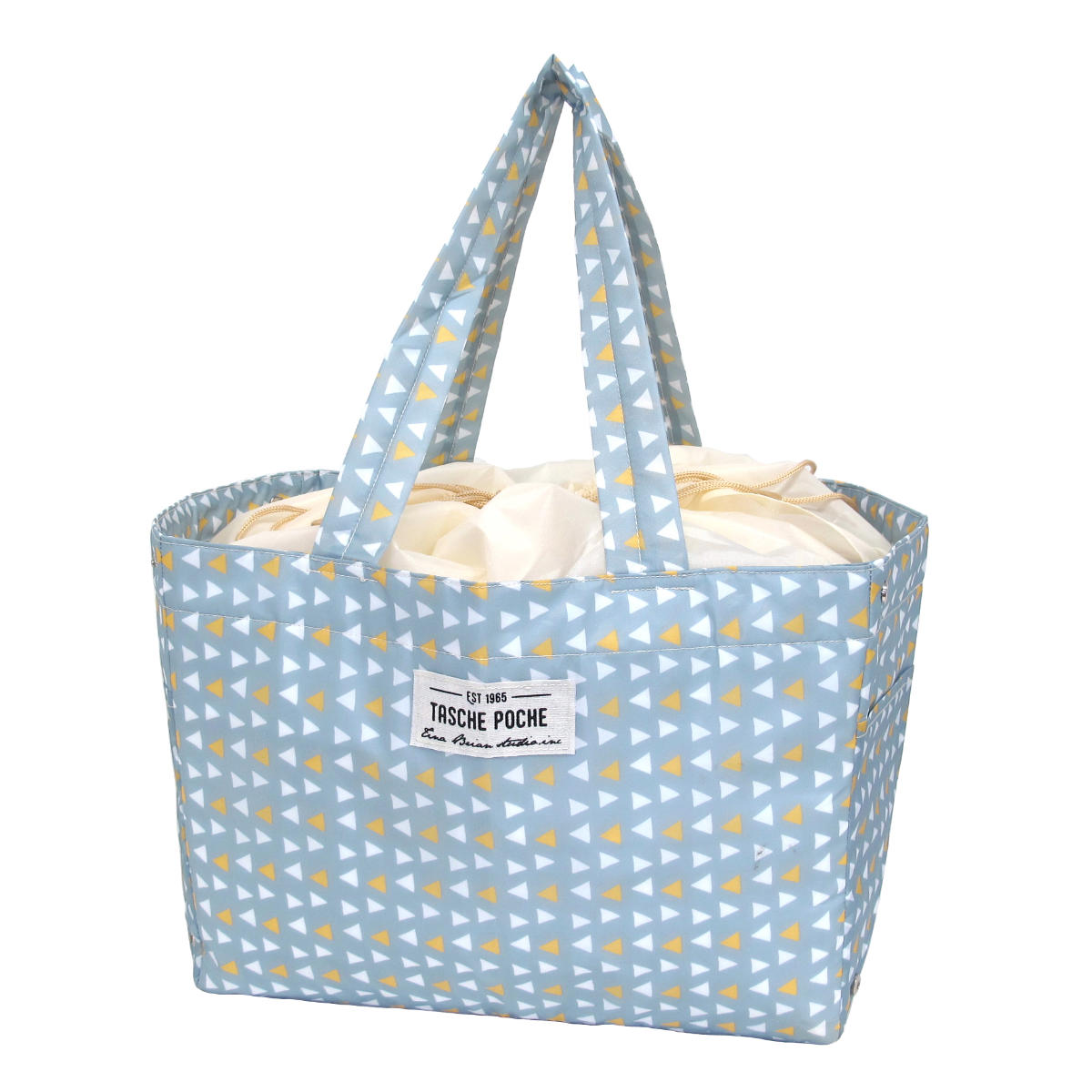 口部は巾着になっているので、中のものが飛び出しにくく、置いたときも中身がみえにくいです。