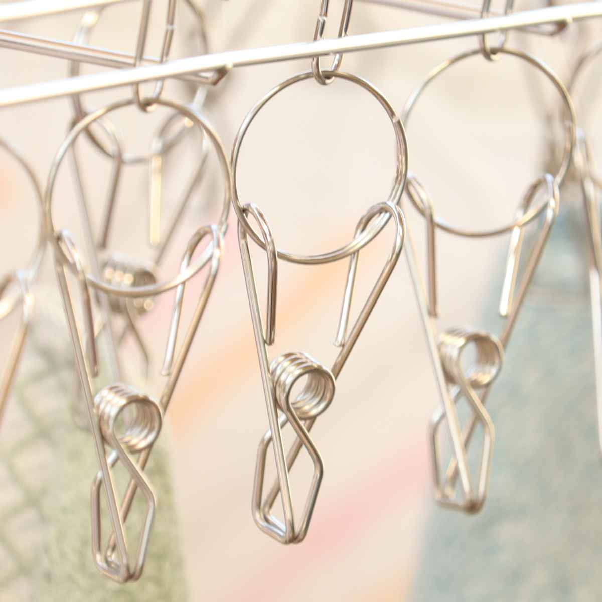 ピンチのつまみ部分をリングで繋ぐことで、からみにくい仕様になっています。洗濯物を干す時のイライラを解消してくれます。
