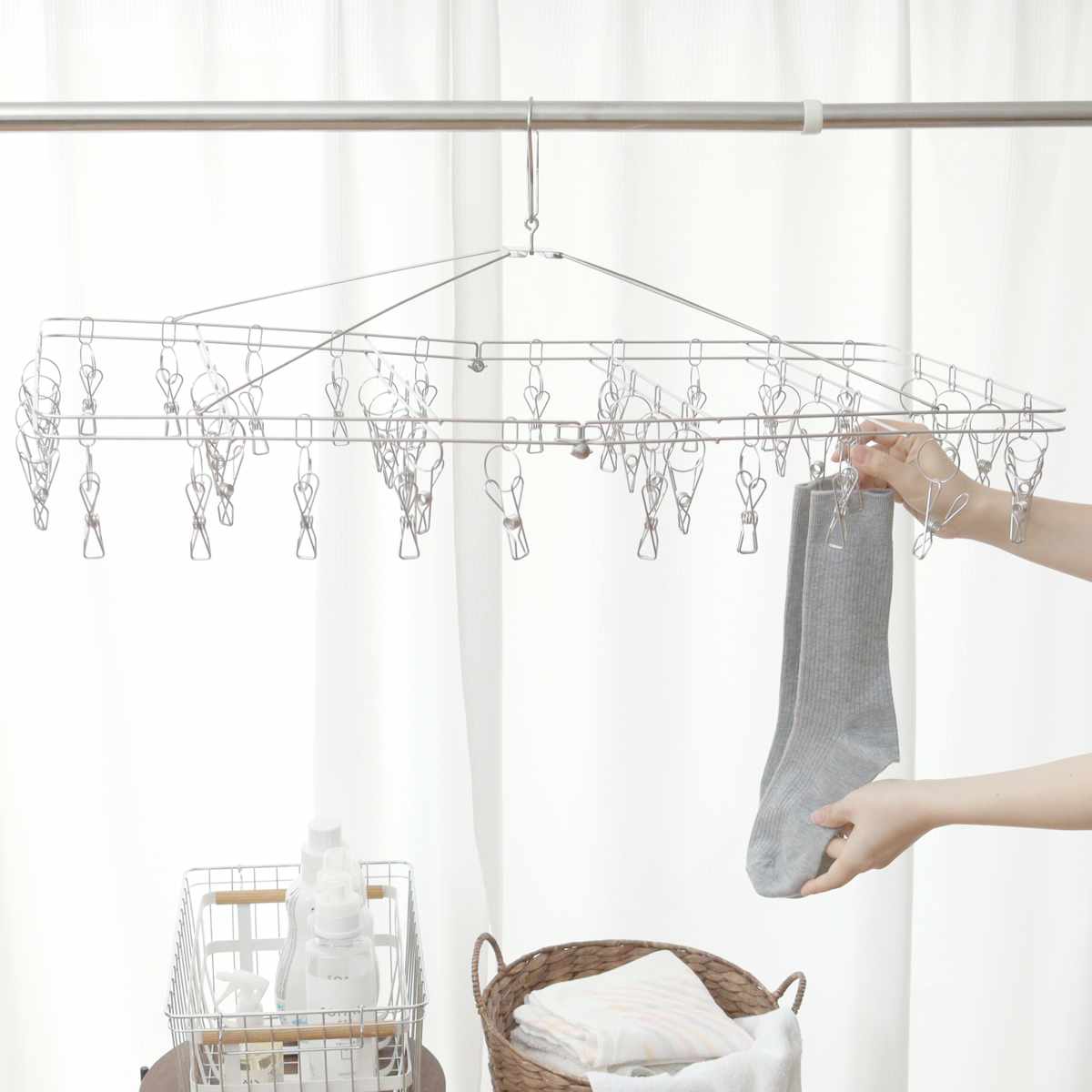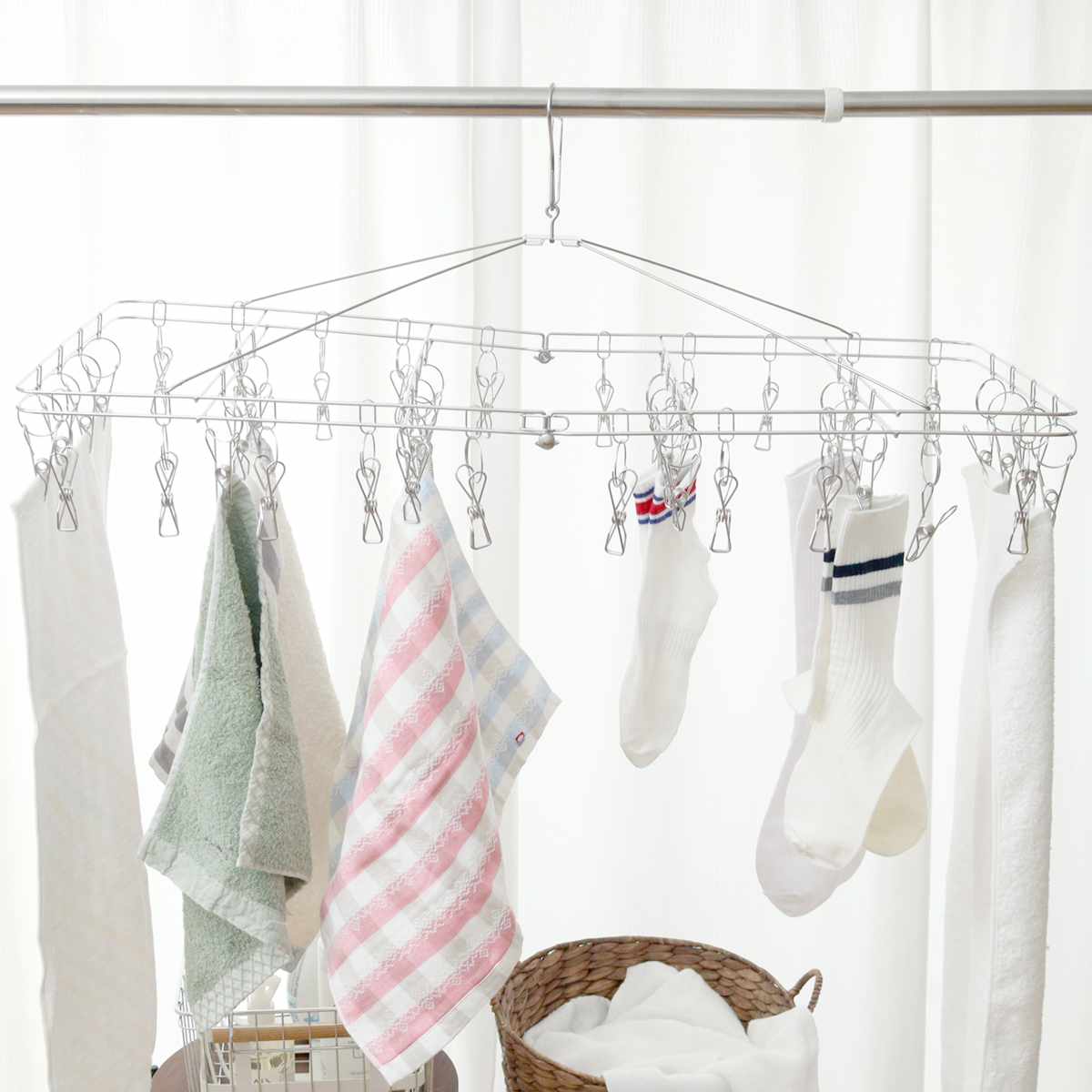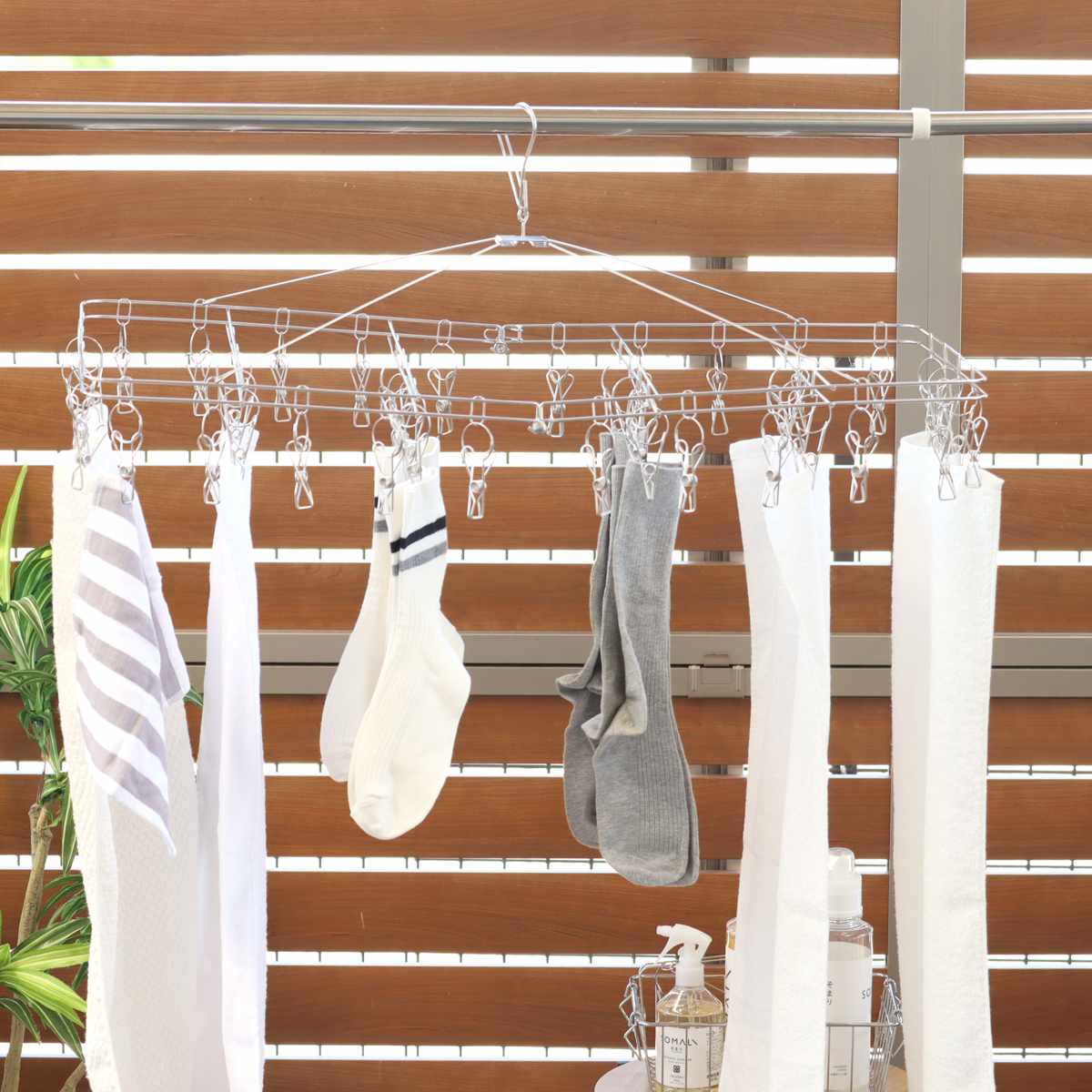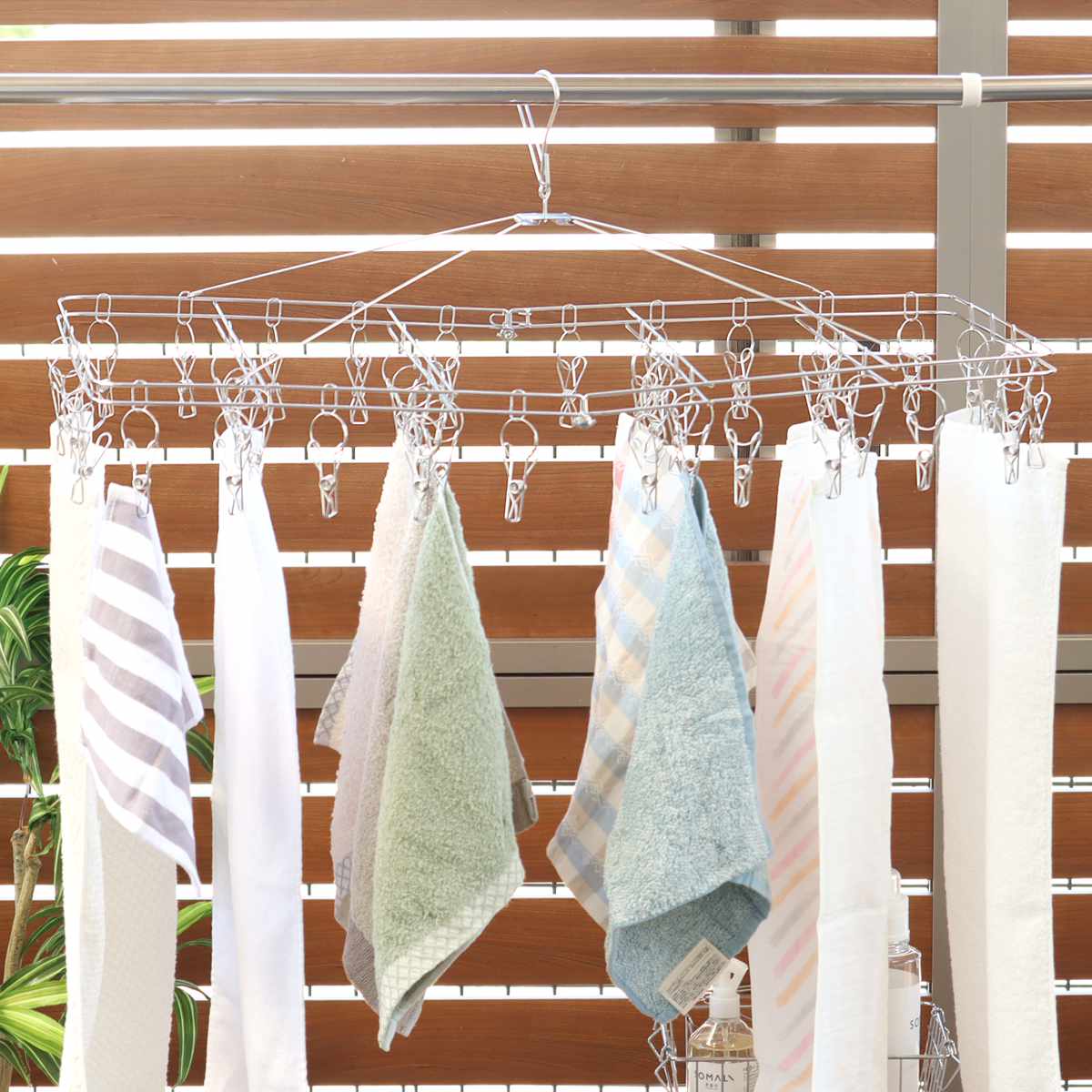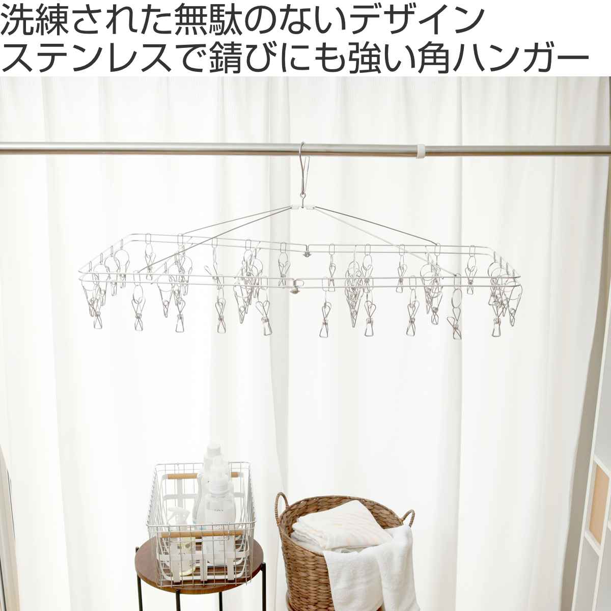 毎日たくさん洗濯をする人にオススメな丈夫で使い勝手が良い、ピンチが42個付いた角ハンガーです。丈夫で清潔なステンレス製です。サビにも強いのでベランダなど屋外で使いたい方にぴったりです。