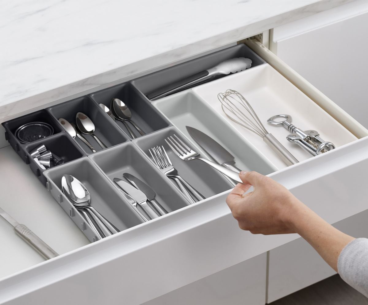 引き出し内をすっきり整頓できる、樹脂製オーガナイザーです。10個の独立したトレーをお好きな形に組み立てて、ご使用の引き出しにフィットさせられます。カトラリーやキッチンツールを種類ごとに整頓して、使いやすくスタイリッシュなキッチンに。