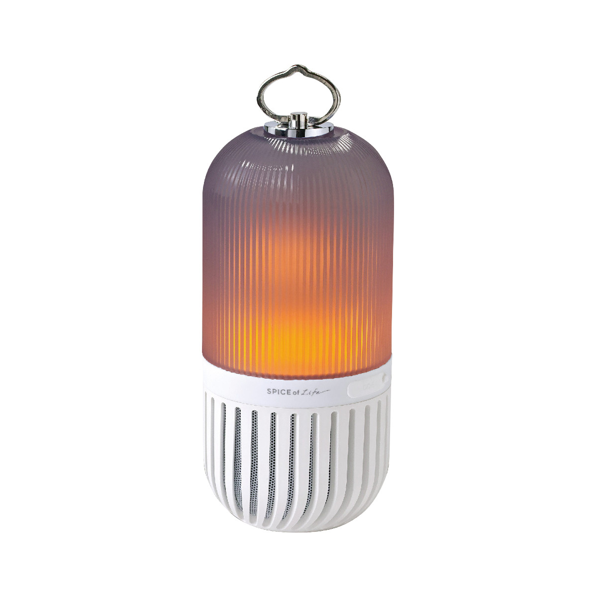 ランタンのようなコロンとしたフォルムで、焚火のような動きのある灯りと固定の灯り、2種類の灯りを楽しめます。Blutoothを搭載した機器と接続すると360度全方向に音楽が広がります。