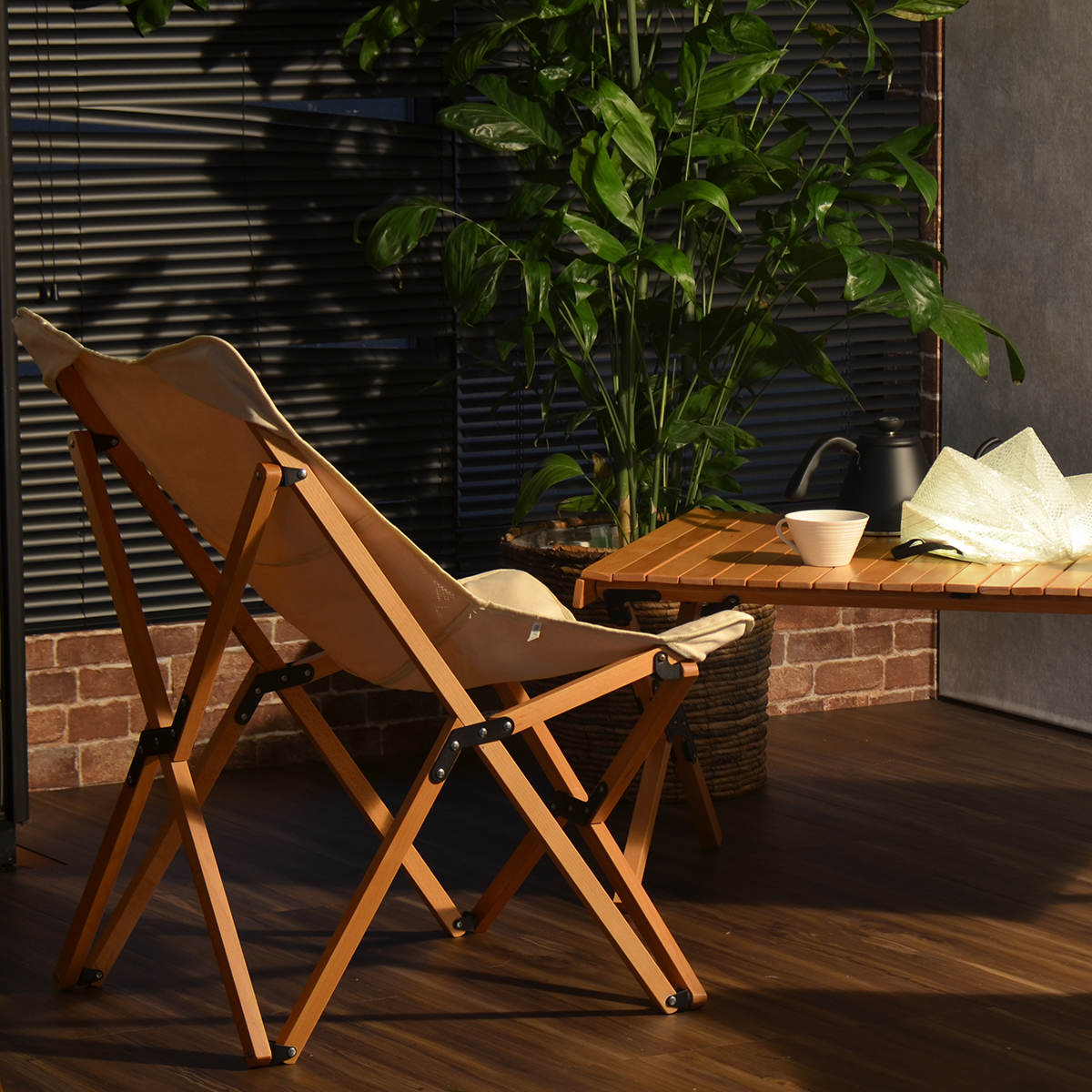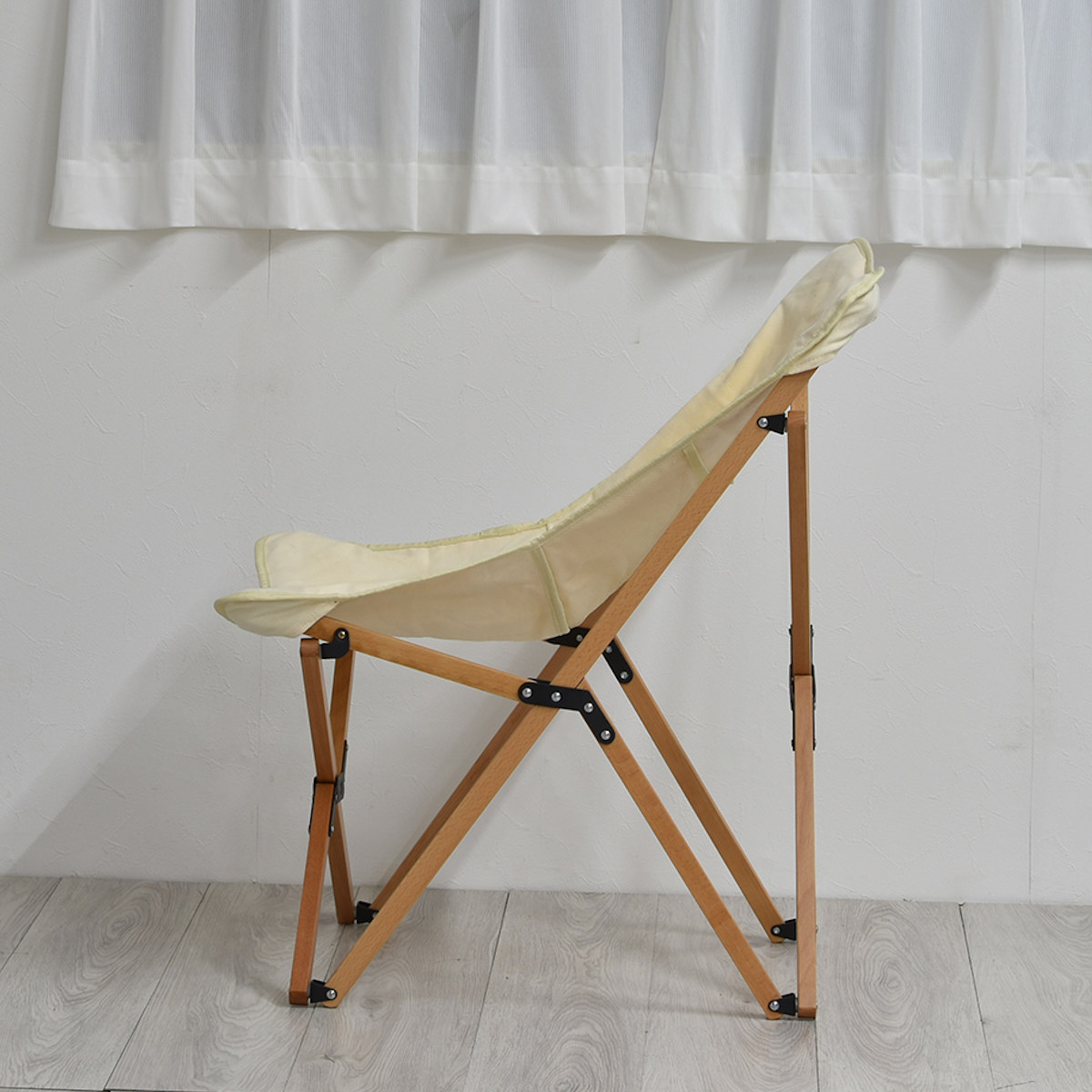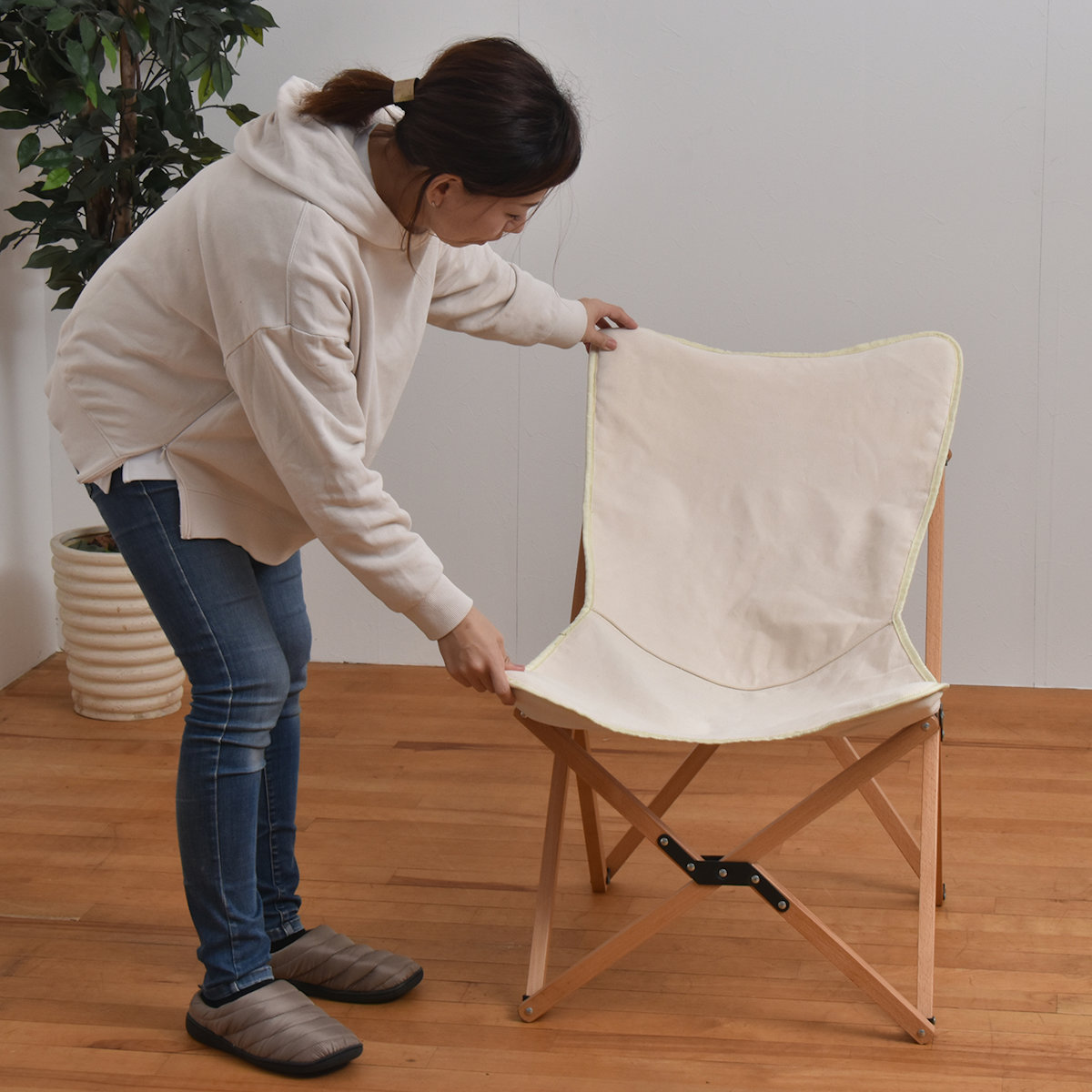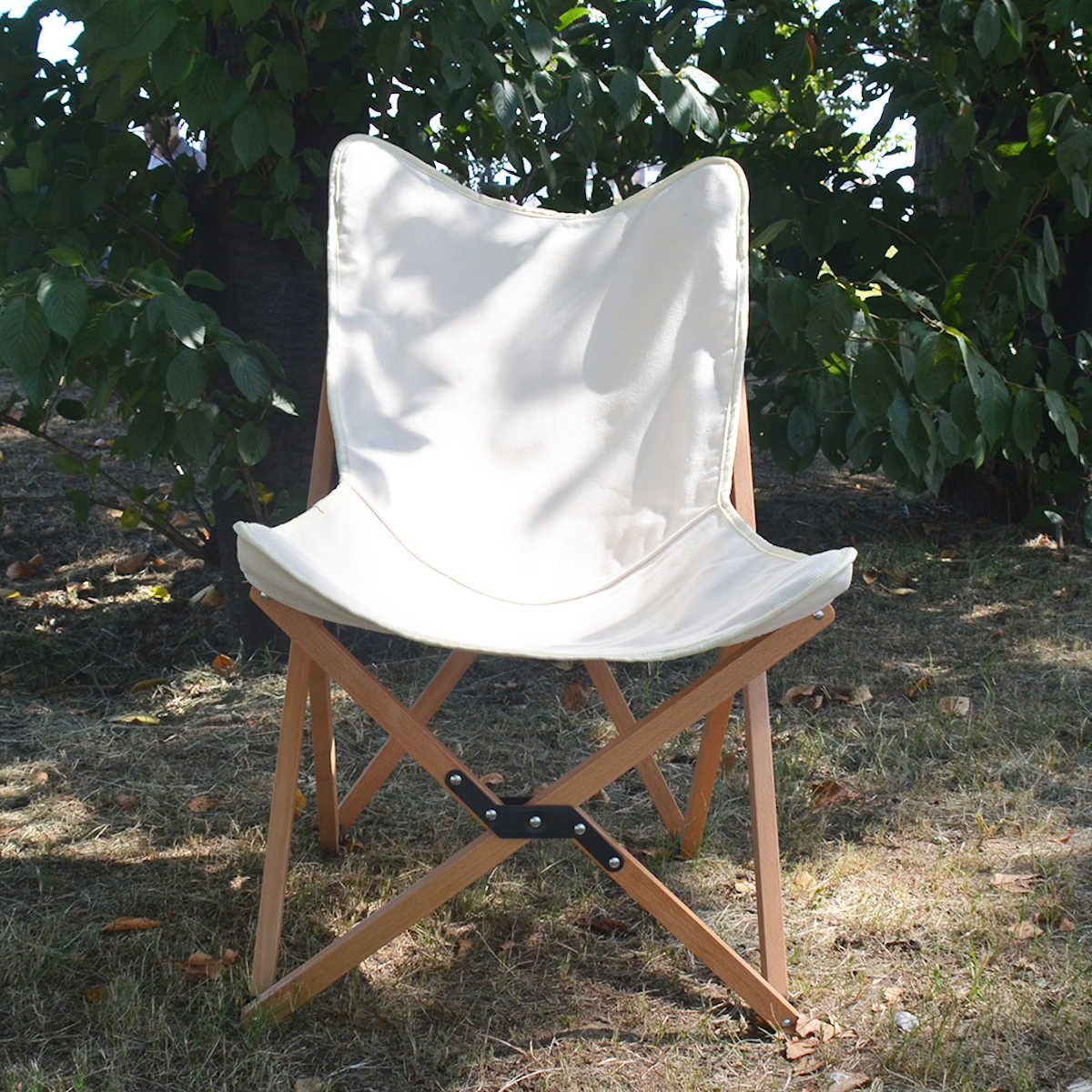 蝶のように羽を広げたフレームが美しい、天然木のキャンプチェアです。広げてカバーを掛けるだけで簡単に組み立てることができ、しっかりとしたキャンバス生地が心地よく体を支えてくれます。室内でもアウトドアでも気軽にお使いいただけます。