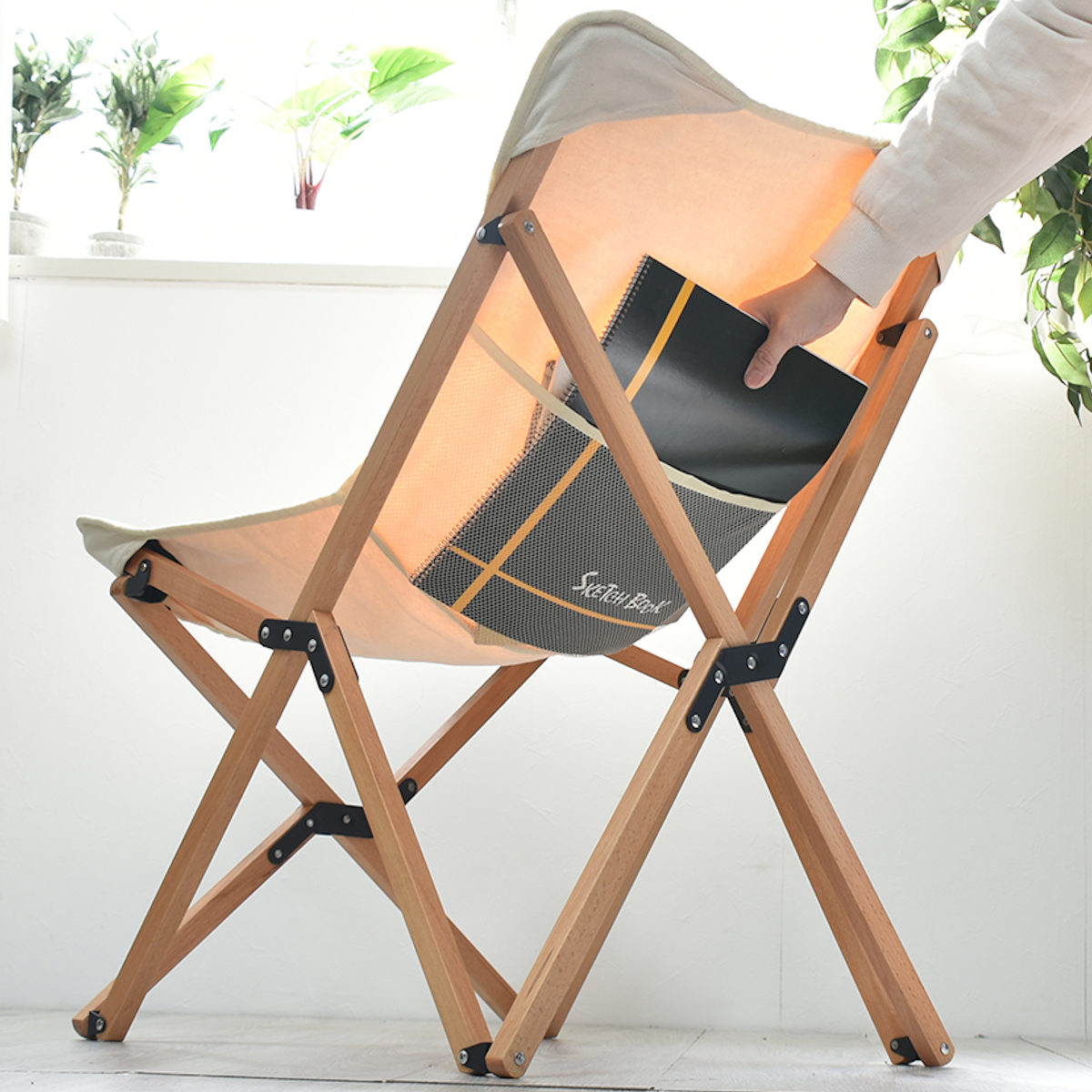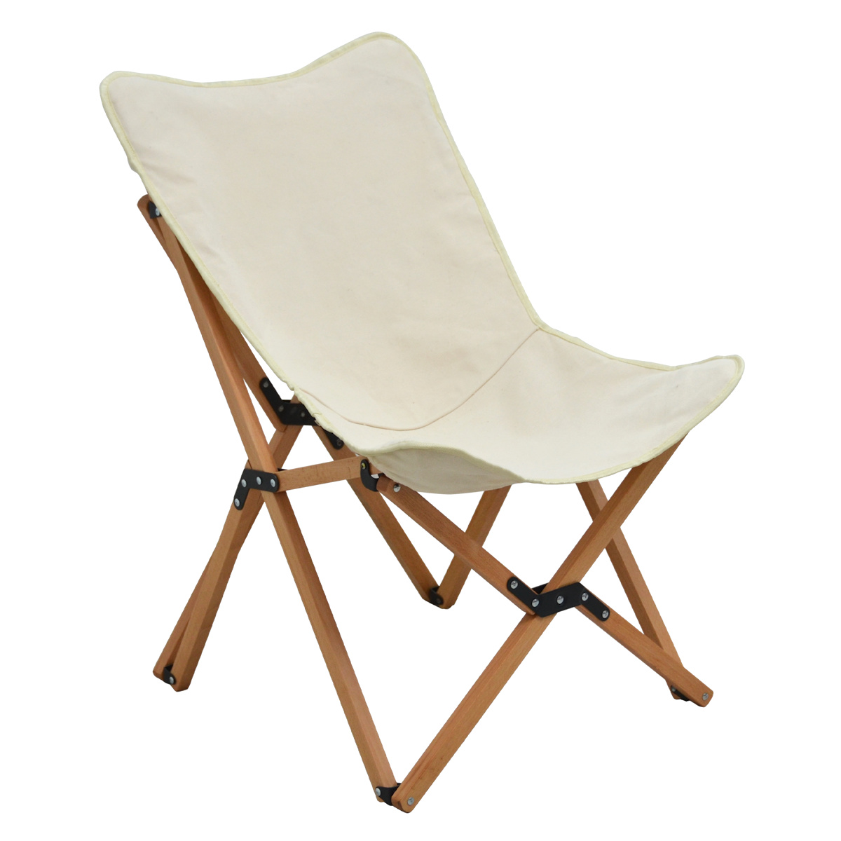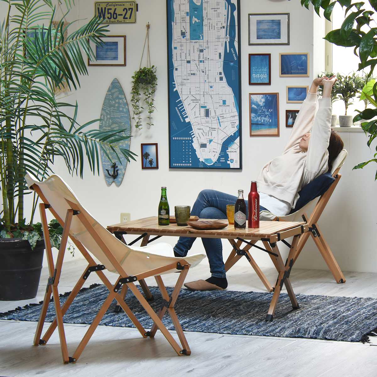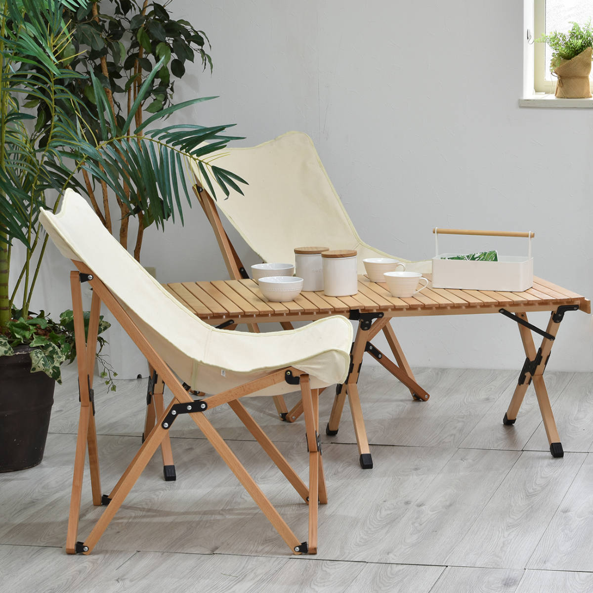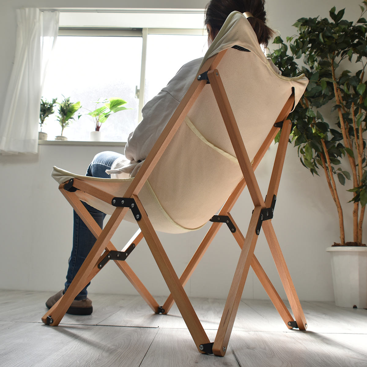 蝶のように羽を広げたフレームが美しい、天然木のキャンプチェアです。広げてカバーを掛けるだけで簡単に組み立てることができ、しっかりとしたキャンバス生地が心地よく体を支えてくれます。室内でもアウトドアでも気軽にお使いいただけます。