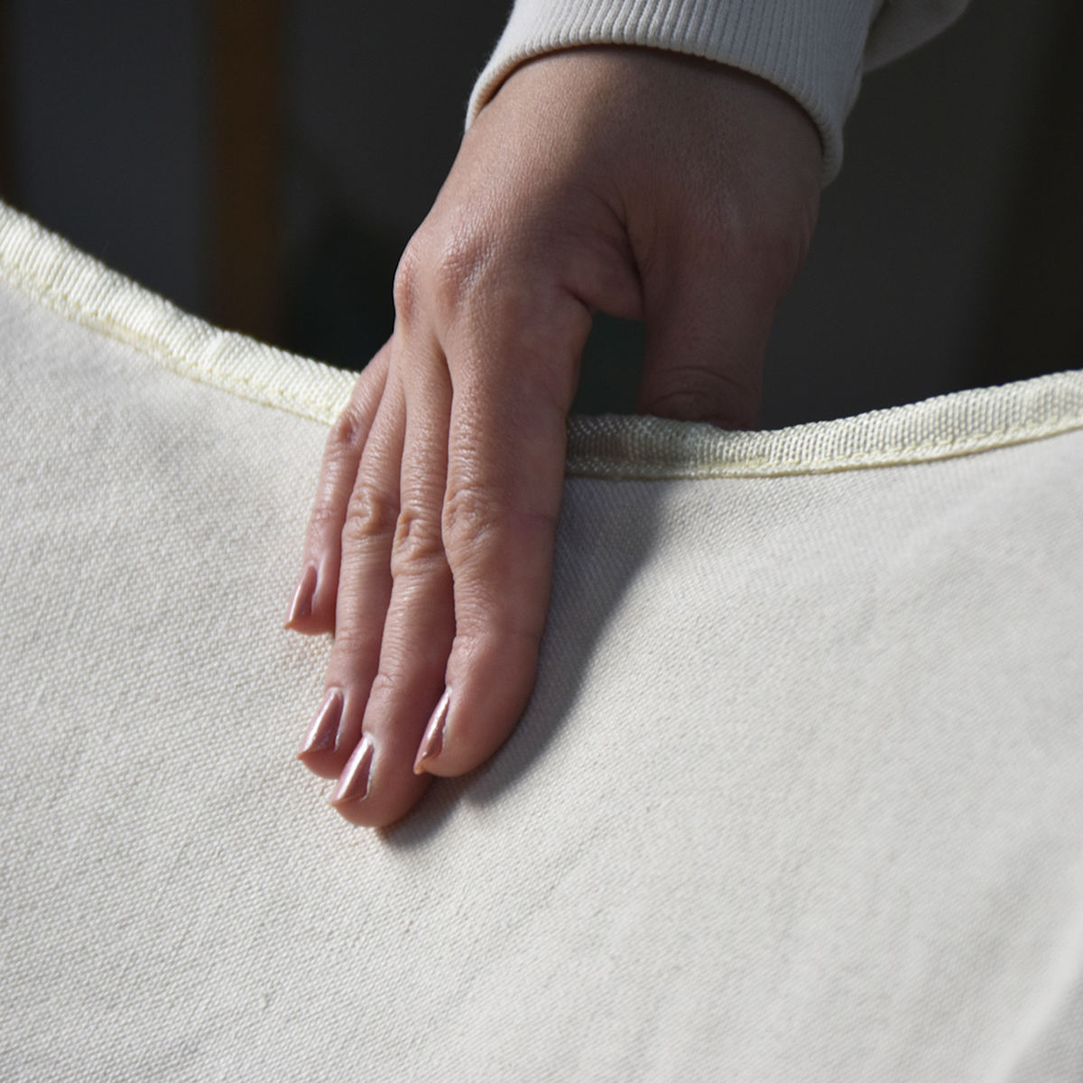 固めの生地が心地いいキャンバス生地です。防炎性があり、バーベキューや焚き火の前などで使用しても安心です。洗濯可能なので汚れたら洗って清潔にお使いいただけます。
