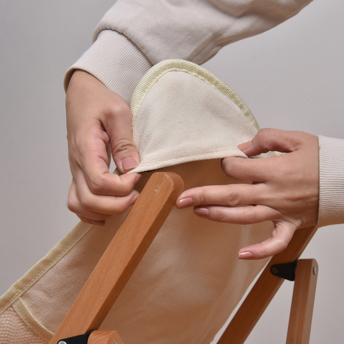 吊り下げ構造の生地が体重に合わせて適度に沈み込み、体を優しく包み込んでくれます。肩まである背もたれから流れるコットンキャンバス生地がハンモックのように体にフィットし、リラックスできる快適な座り心地のチェアです。