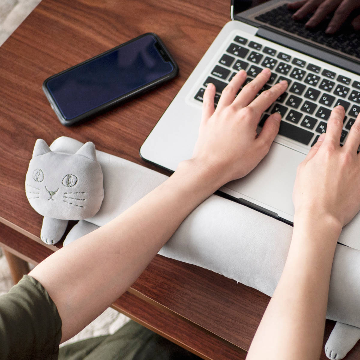 PC作業中の両手首を優しく支える、猫の形のアームレストです。手首からひょっこり顔を出して頑張るあなたを応援します。長時間のキーボード操作による疲労や痛みを軽減する、デスクワークの心強い相棒です。