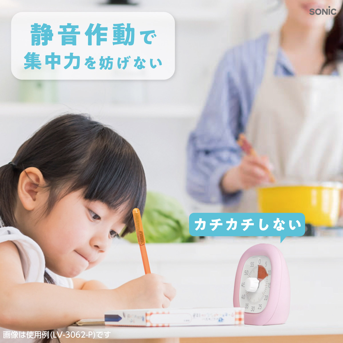 時間の経過とともにフィルムが回転、色面が減っていくので、時間の経過を視覚的に実感できます。時計が読めない、時間感覚がまだ身についていないお子様も、目で見てわかります。カウントダウン終了を「ピピピッ」の電子音でお知らせします。タイマーのカチカチ音が気にならない静音作動設計で学習の邪魔になりません。
