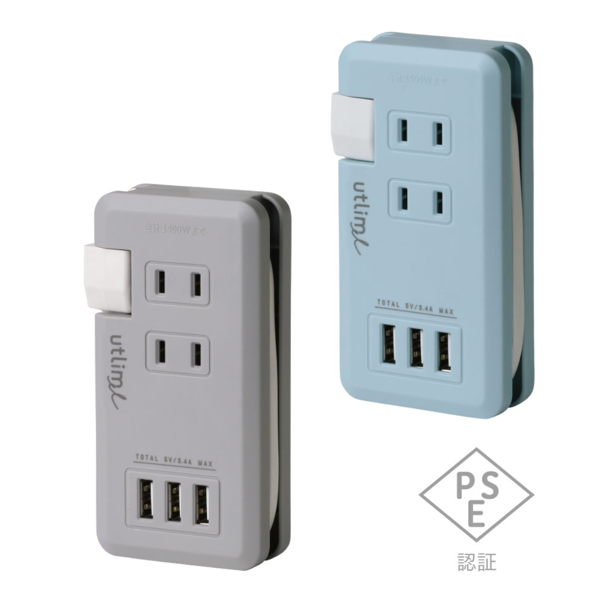 ポータブルコンセント USBポート付 ユートリムエル ( ACアダプター USBアダプター 電源タップ USB充電器 延長コード PSEマーク認証済 コンセント 2口 USB 3ポート コンパクト 持ち運び スマートIC トラッキング防止プラグ 同時充電 ) 【ライトブルー】