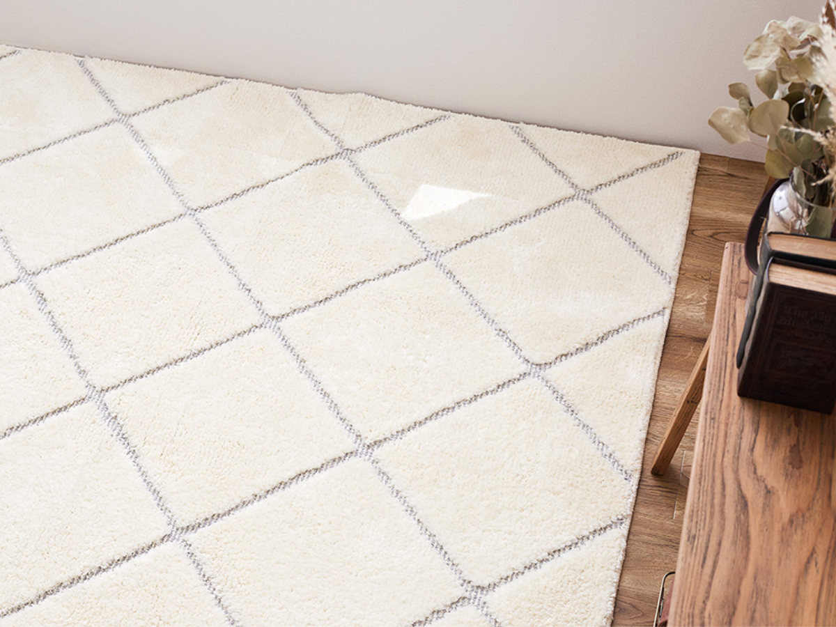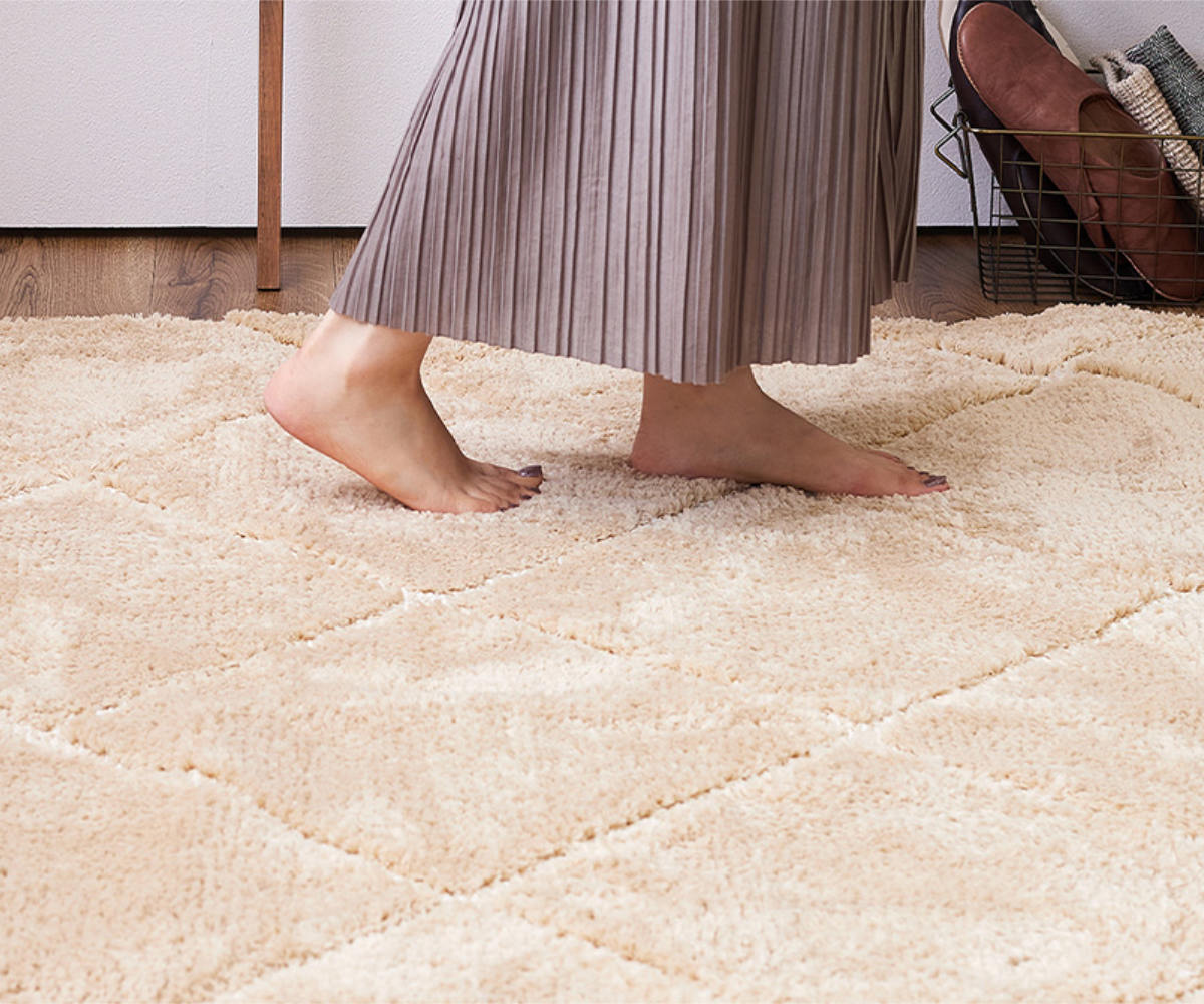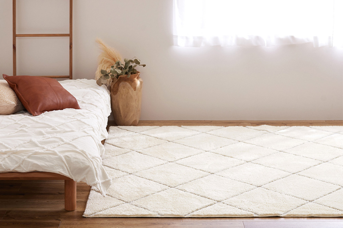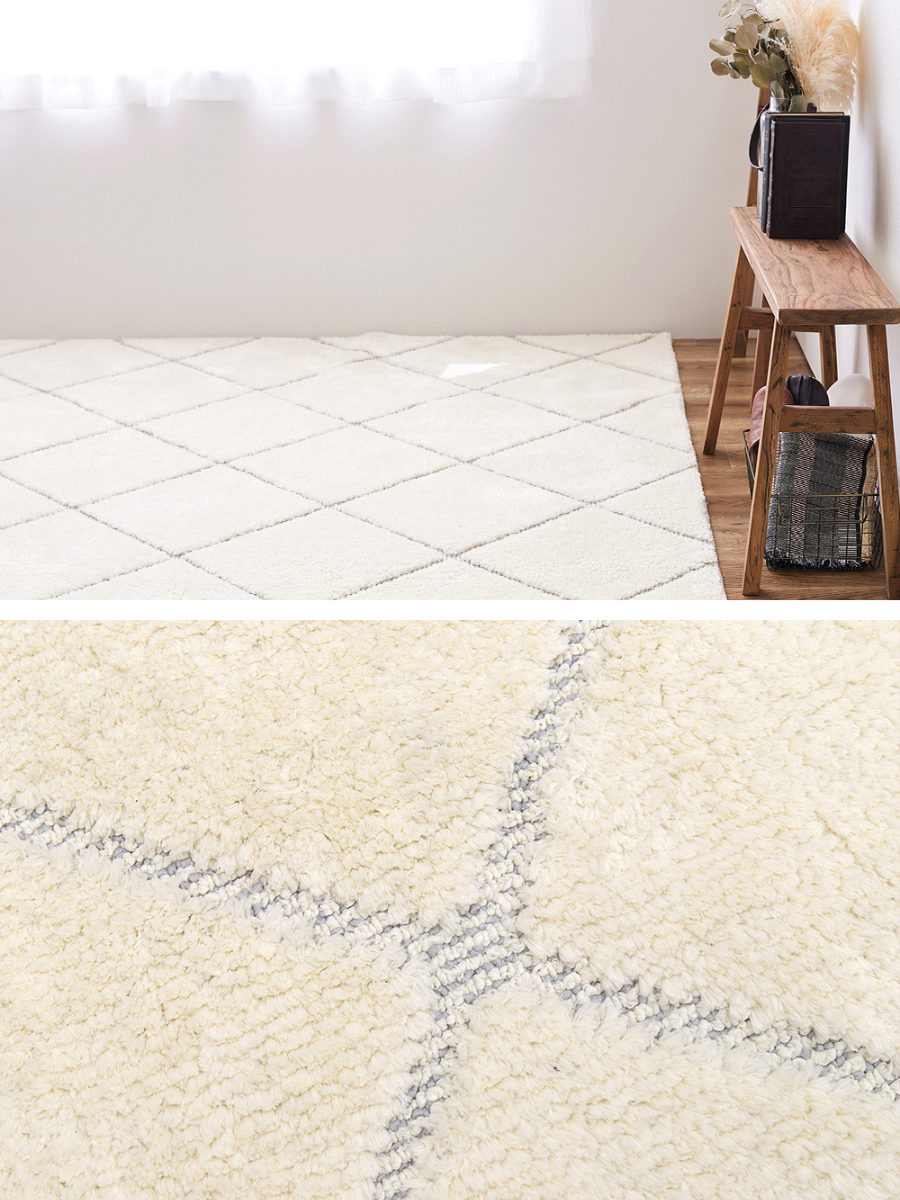 長さの異なるパイル調を組み合わせて模様を表現しています。長めのカットパイルは思わず触りたくなる柔らかさで、ゆっくり寛ぐ癒しの空間を作れます。