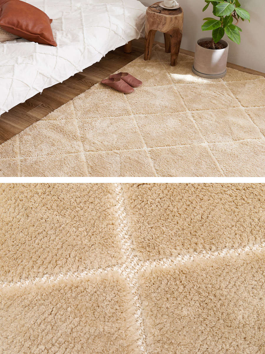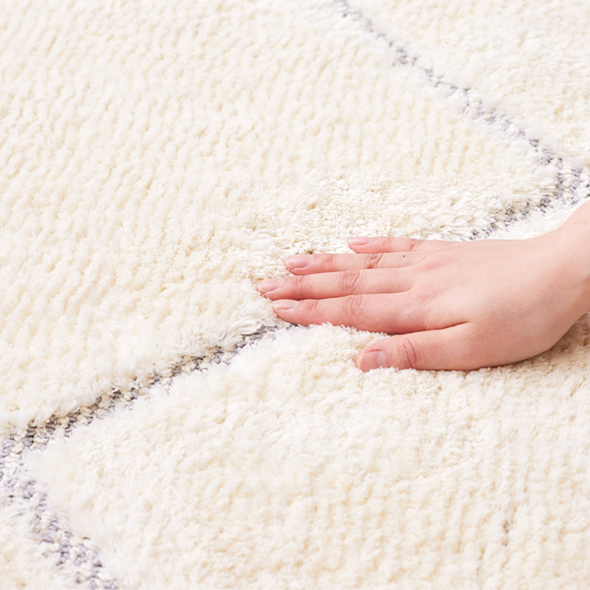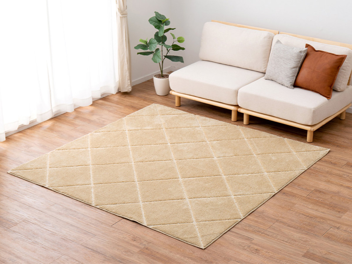 長さの異なるパイル調を組み合わせて模様を表現しています。長めのカットパイルは思わず触りたくなる柔らかさで、ゆっくり寛ぐ癒しの空間を作れます。