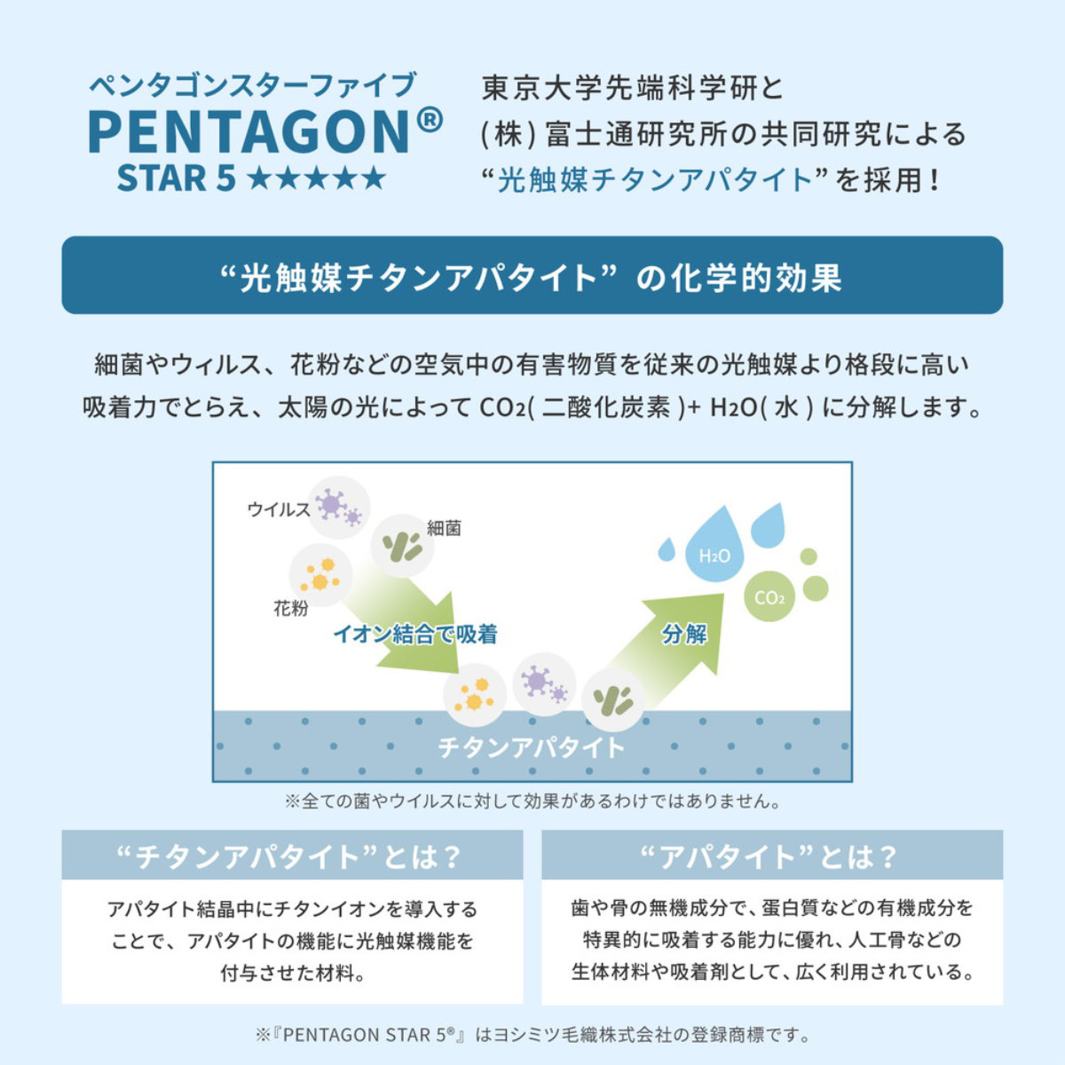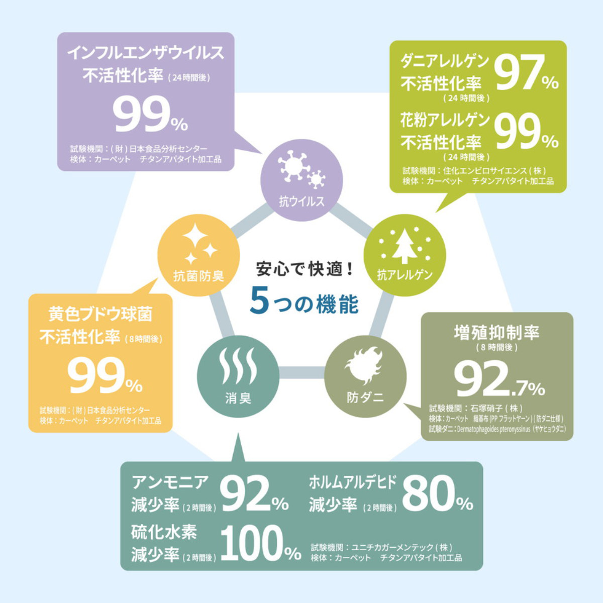 東京大学先端科学研と富士通共同研究所の共同研究による「光触媒チタンアパタイト」を採用したラグです。抗ウイルス・抗アレルゲン・消臭・抗菌防臭・防ダニ加工付きなので小さなお子様のいらっしゃるご家庭にも安心してお使い頂けます。