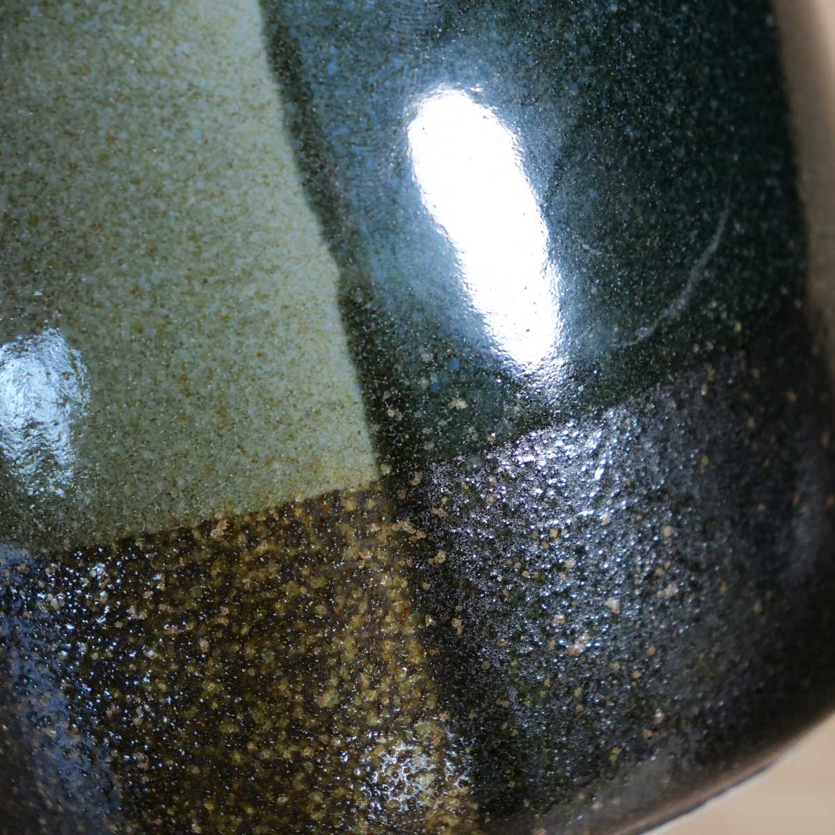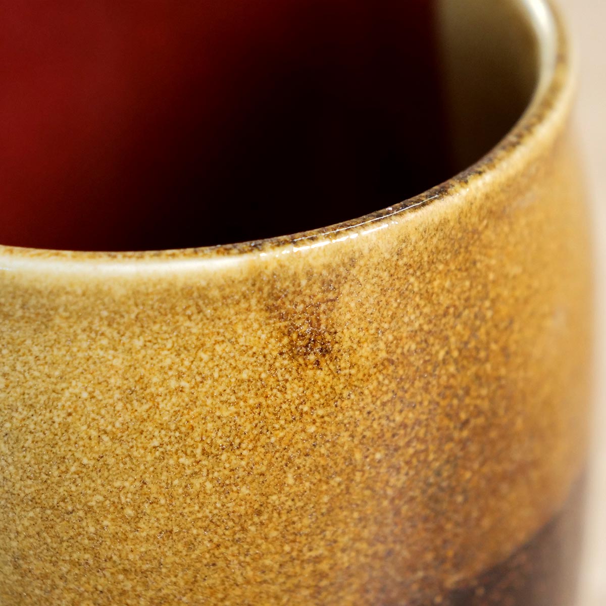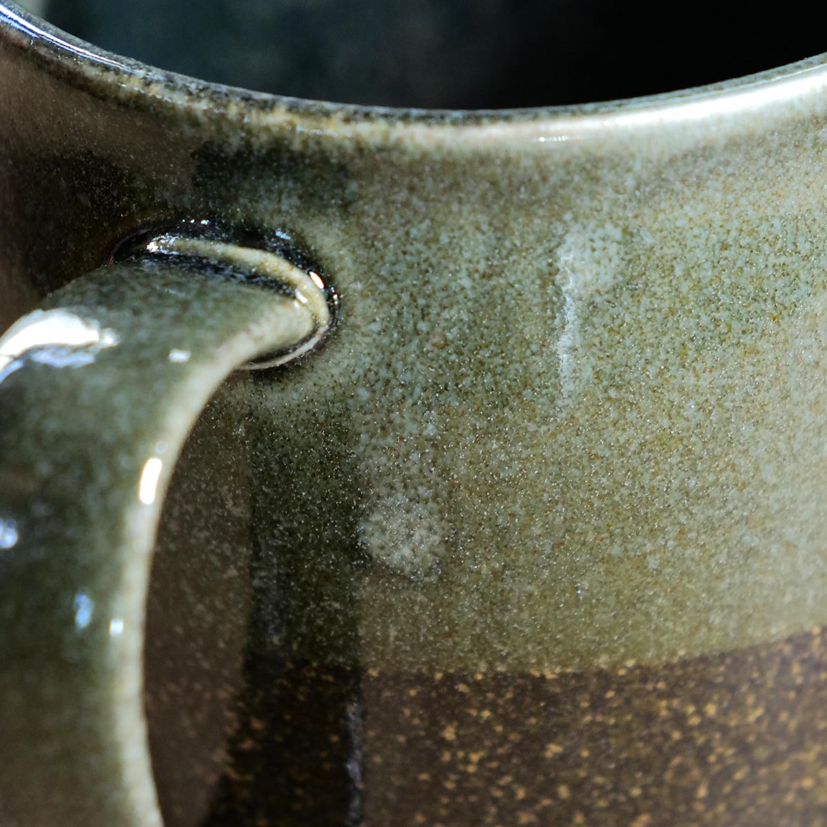 口縁から胴部分の表面はつるつるとした光沢のある質感で、腰部分は少しざらざらとした手触りです。女性の指が約3本入る持ちやすい取っ手が付いています。