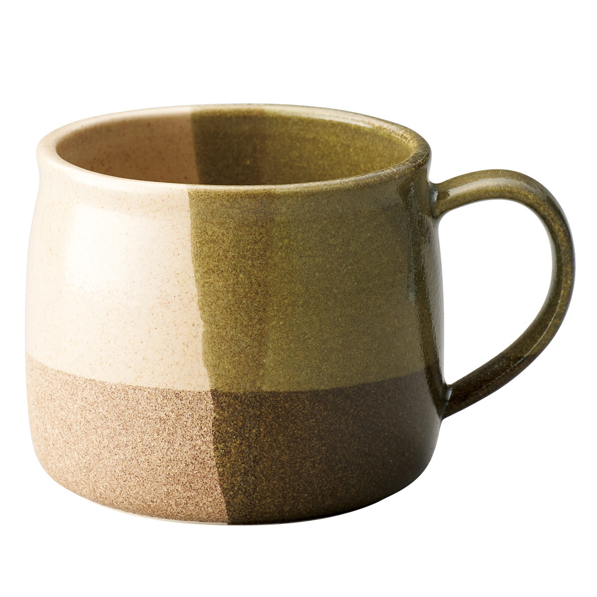 口縁から胴部分の表面はつるつるとした光沢のある質感で、腰部分は少しざらざらとした手触りです。女性の指が約3本入る持ちやすい取っ手が付いています。
