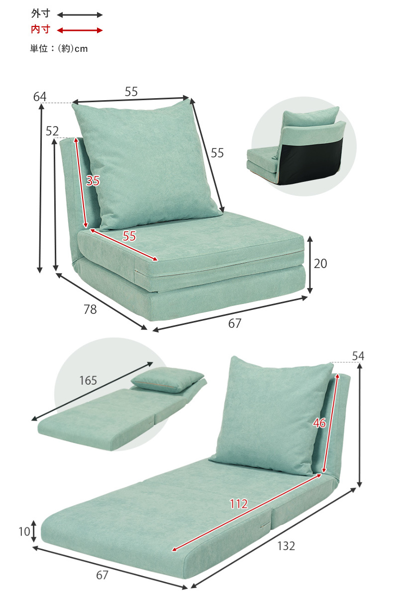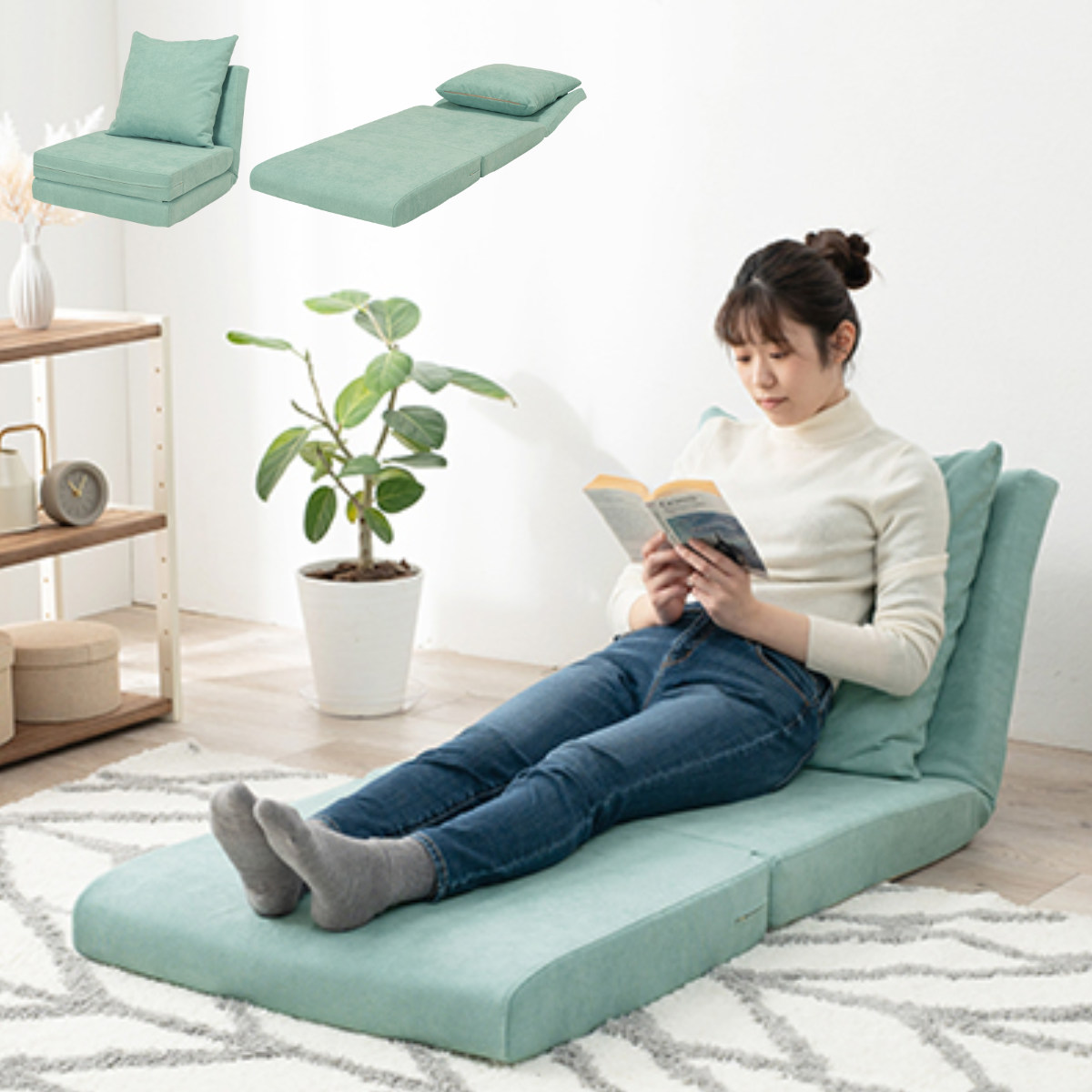 ソファベッド 幅67cm 14段階リクライニング 折りたたみ ( 3Way カウチ ソファー フロアソファー ロー ソファ シングル ベッド 1人掛け 座椅子 椅子 コンパクト リビング お昼寝マット リクライニング クッション )【 モスグリーン 】
