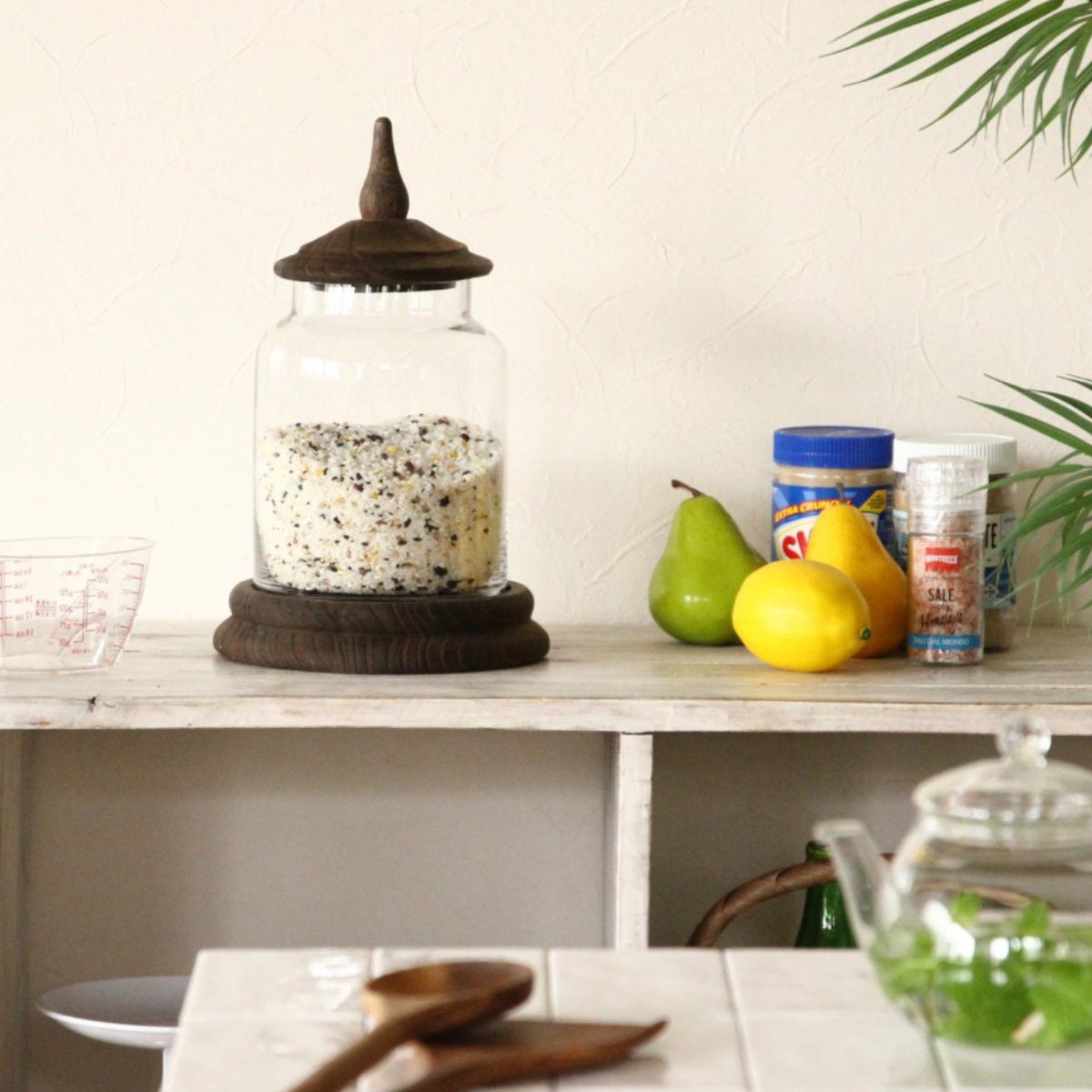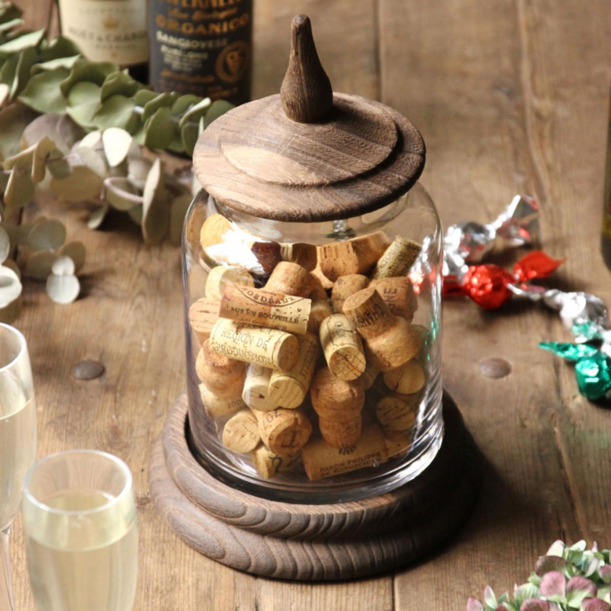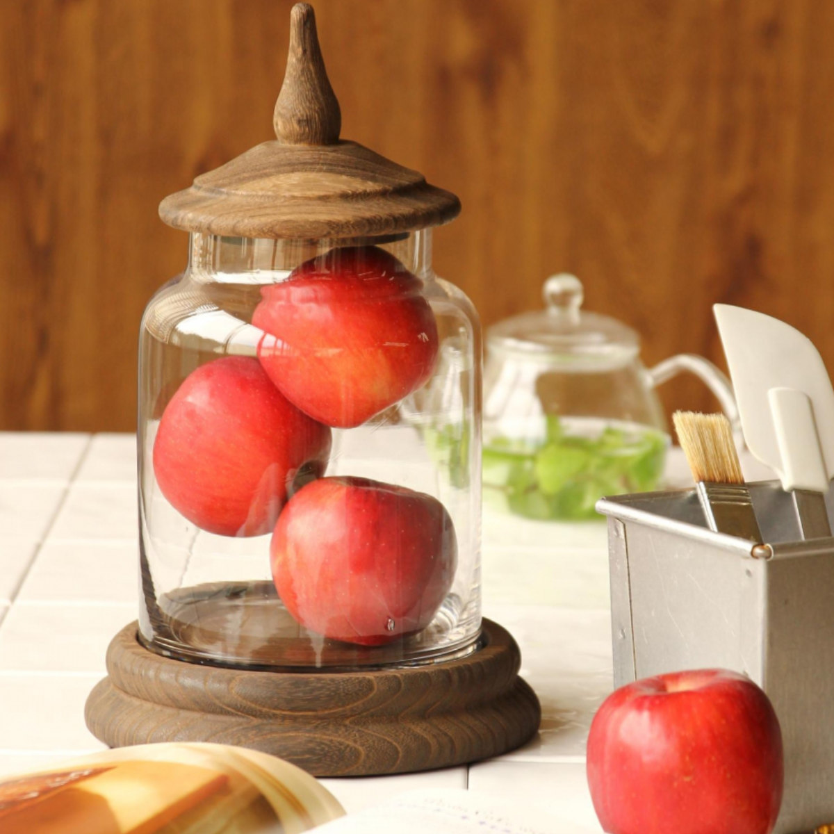 ガラスと天然木の組み合わせがおしゃれな、大き目サイズのガラスジャーです。フルーツやお菓子、お米などの食品の保存に最適で、キッチンやカウンターにおしゃれな雰囲気をプラスできます。食品以外にも、抜いたコルクを貯めるなど使い方は様々。あえて見せる収納にすることで、空間をおしゃれに演出できます。