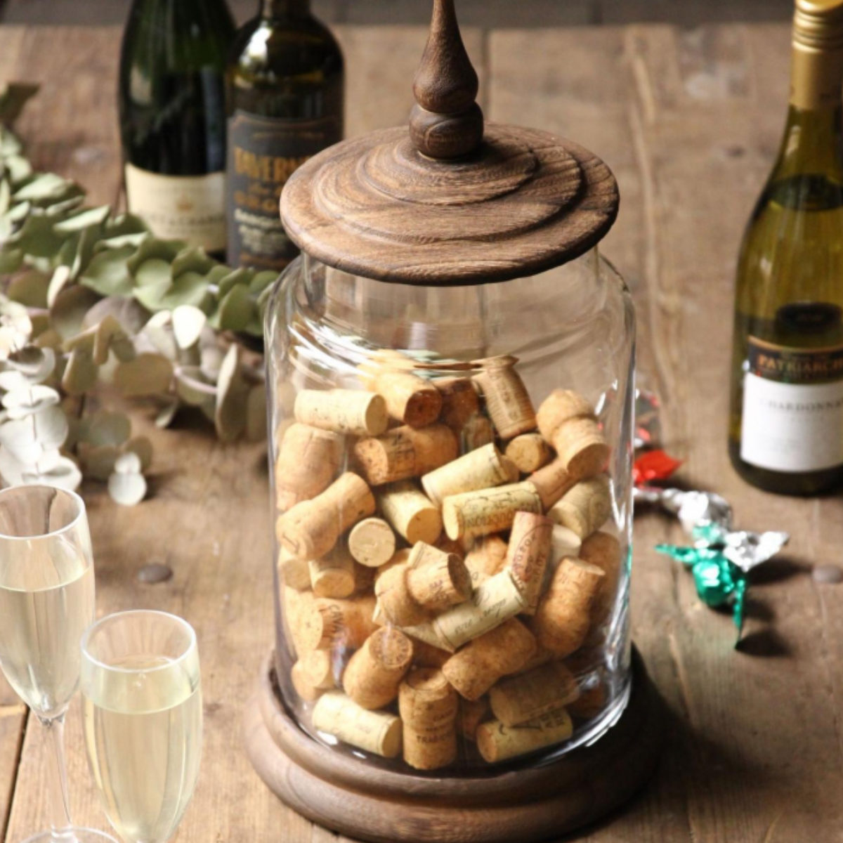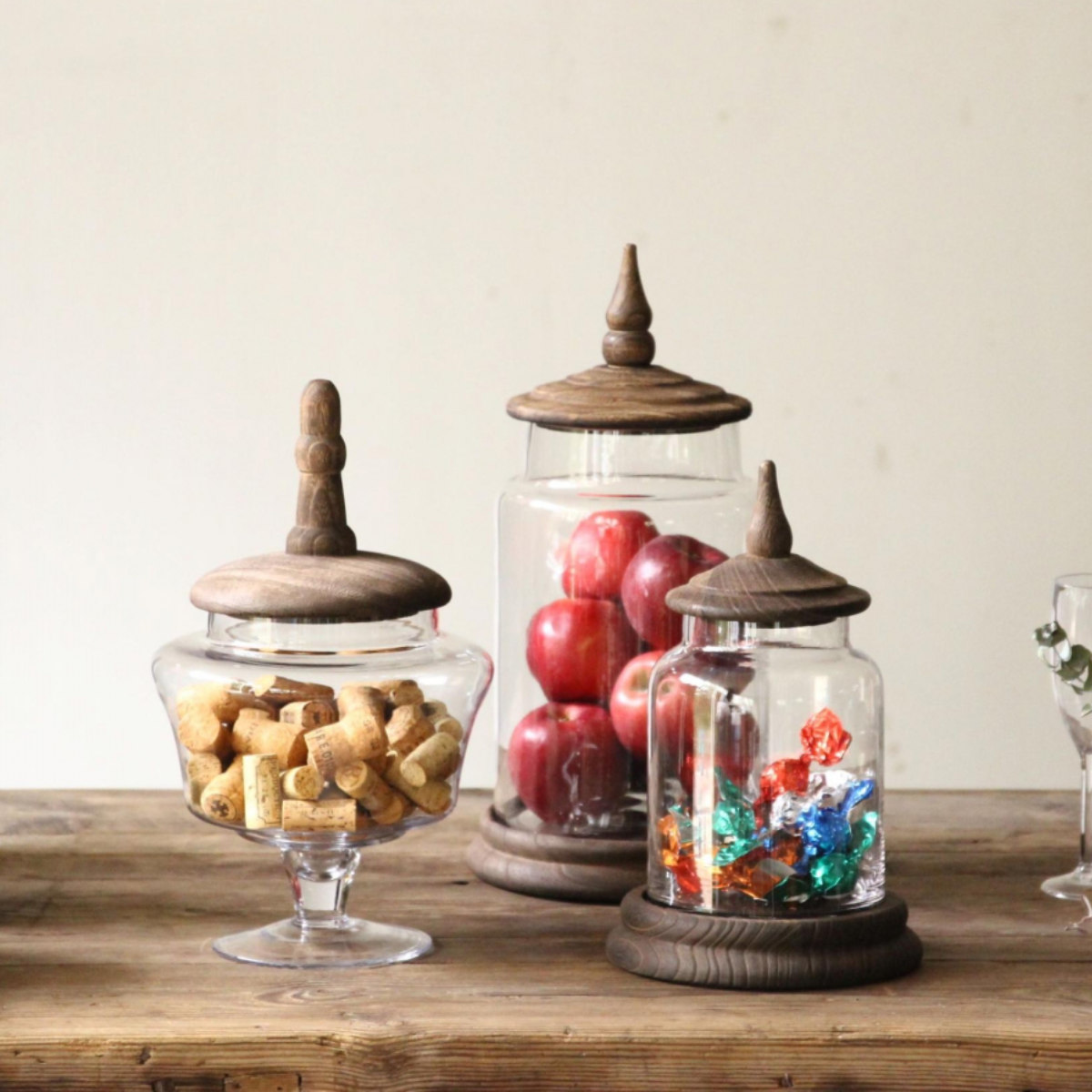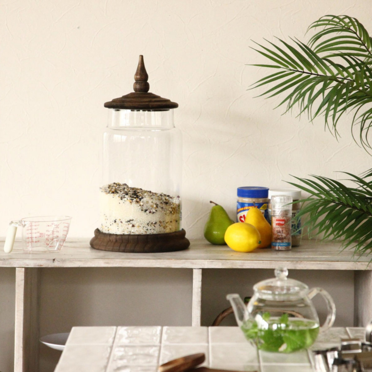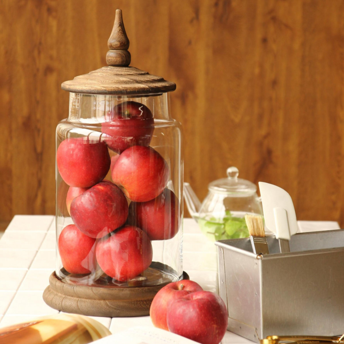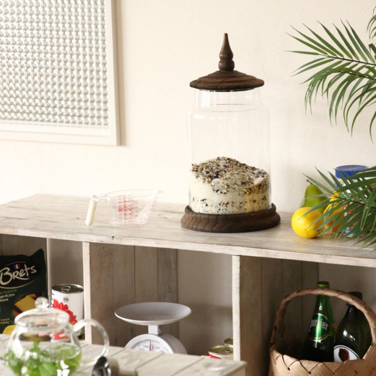 ガラスと天然木の組み合わせがおしゃれな、大き目サイズのガラスジャーです。フルーツやお菓子、お米などの食品の保存に最適で、キッチンやカウンターにおしゃれな雰囲気をプラスできます。食品以外にも、抜いたコルクを貯めるなど使い方は様々。あえて見せる収納にすることで、空間をおしゃれに演出できます。