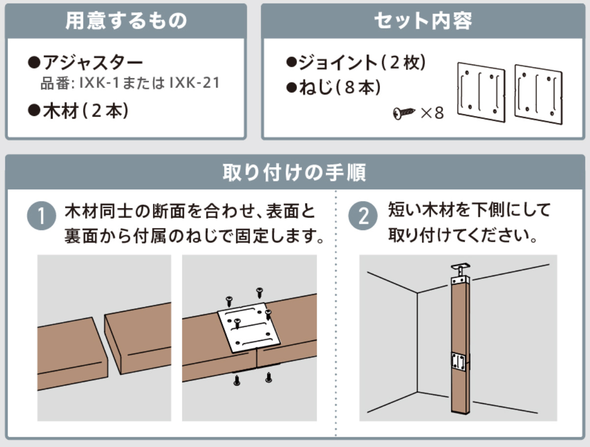 | 備考 | 【別途必要品】 ・アジャスター(IX□-1または、IX□-21) ・市販の2×4(38×89mm)または、1×4(19×89mm)の木材2本 ・プラスドライバー |