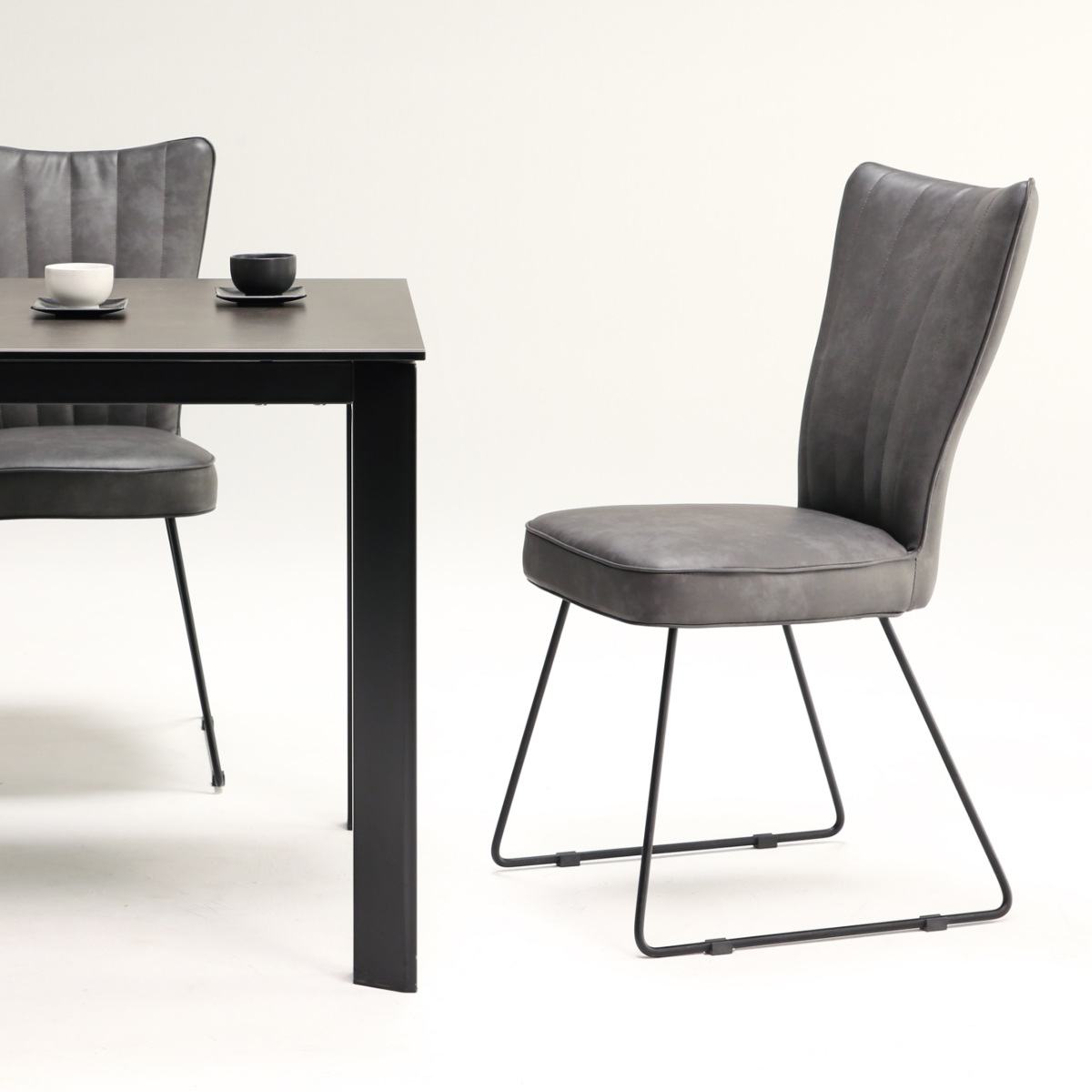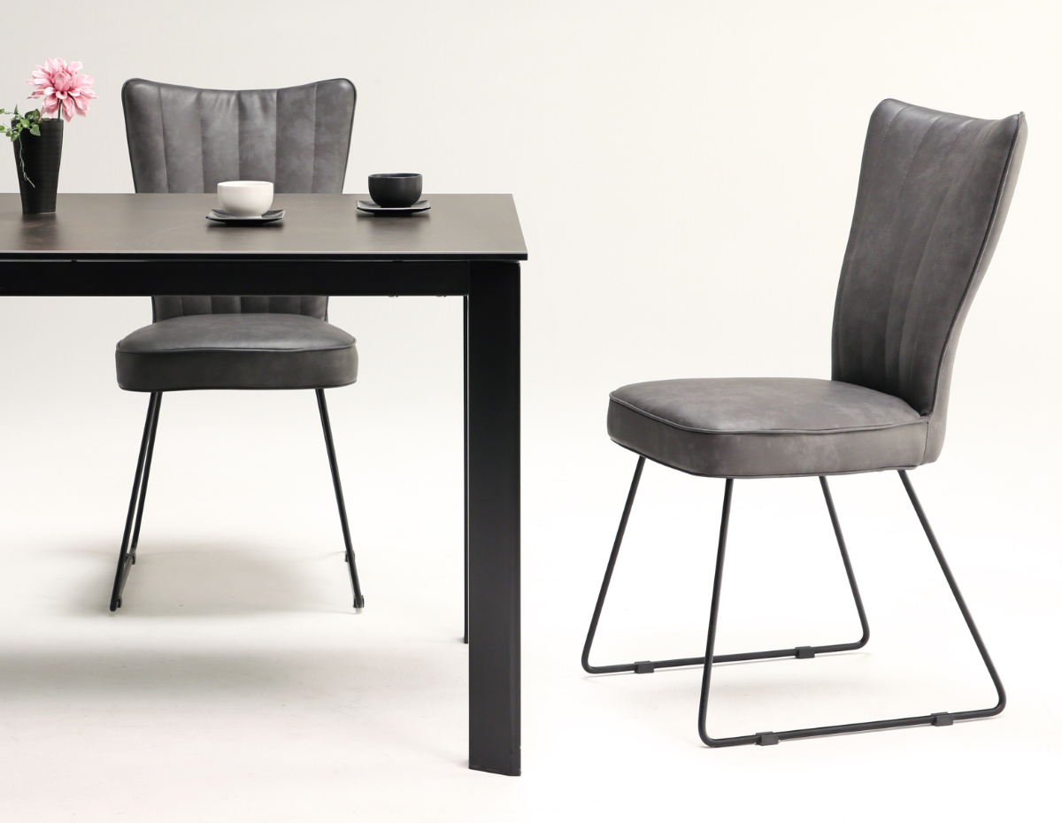スタイリッシュモダンなダイニングチェア2脚セットです。質の良い表情のPUレザーと、落ち着きのある風合いのファブリック生地のチェアがセンスの良いダイニング空間を演出します。