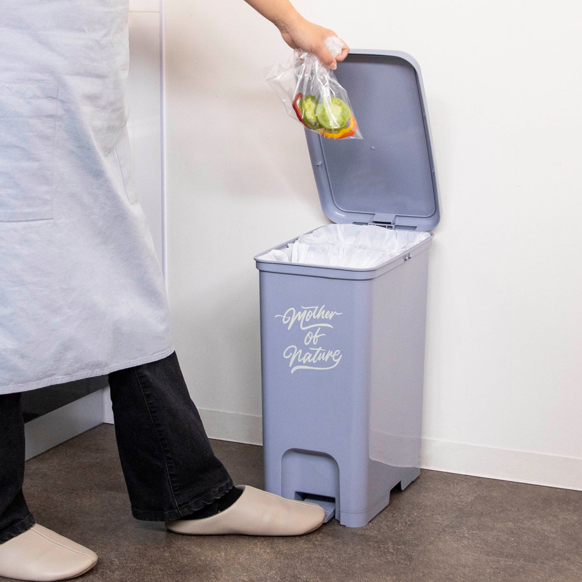 足で軽く踏むだけでサッと開く、ペダル式のゴミ箱です。手がふさがっていたり汚れていても、ふたを開けられるのでとても便利です。ワンポイントデザインが空間のアクセントとなり、インテリアに調和します。