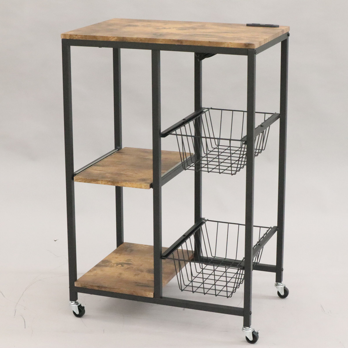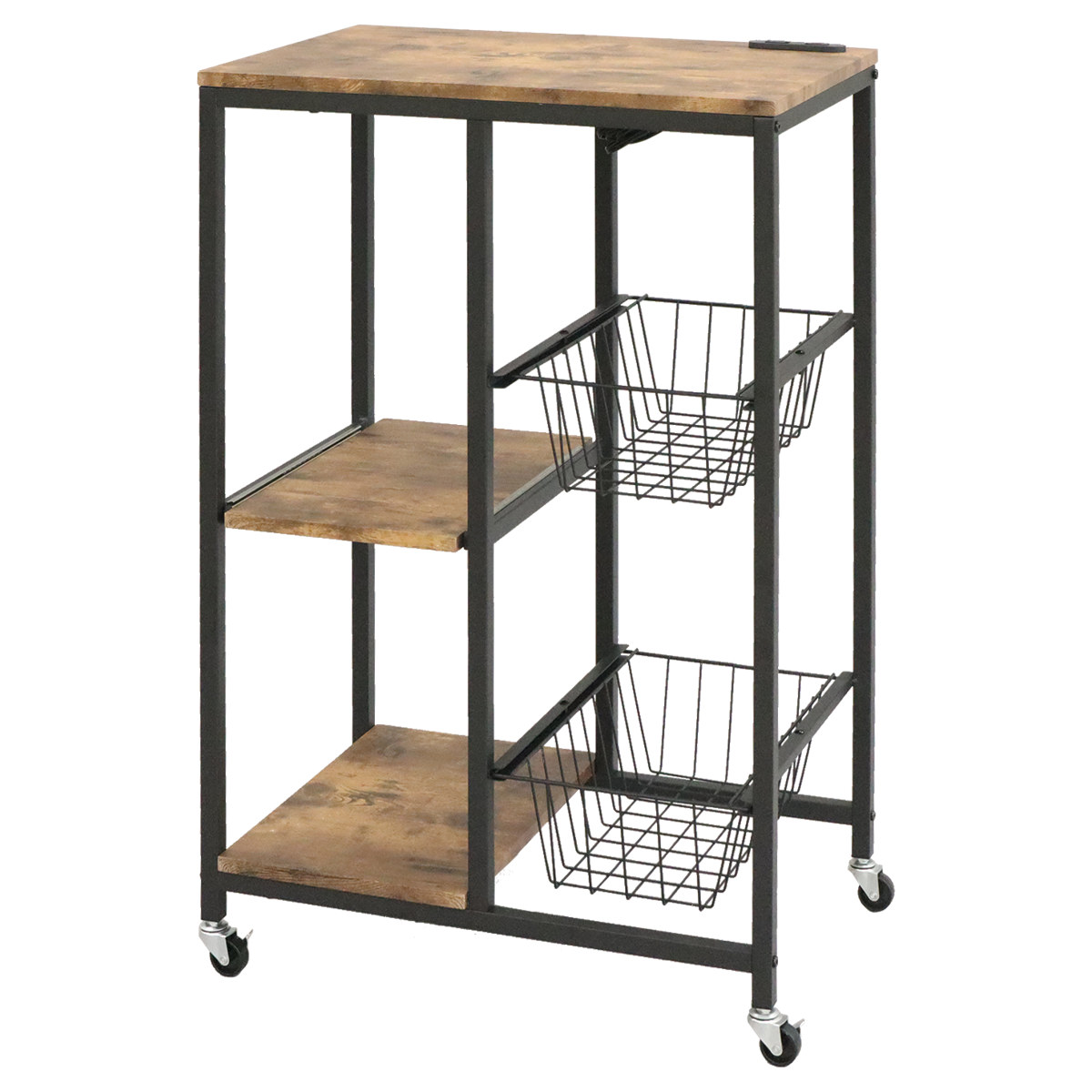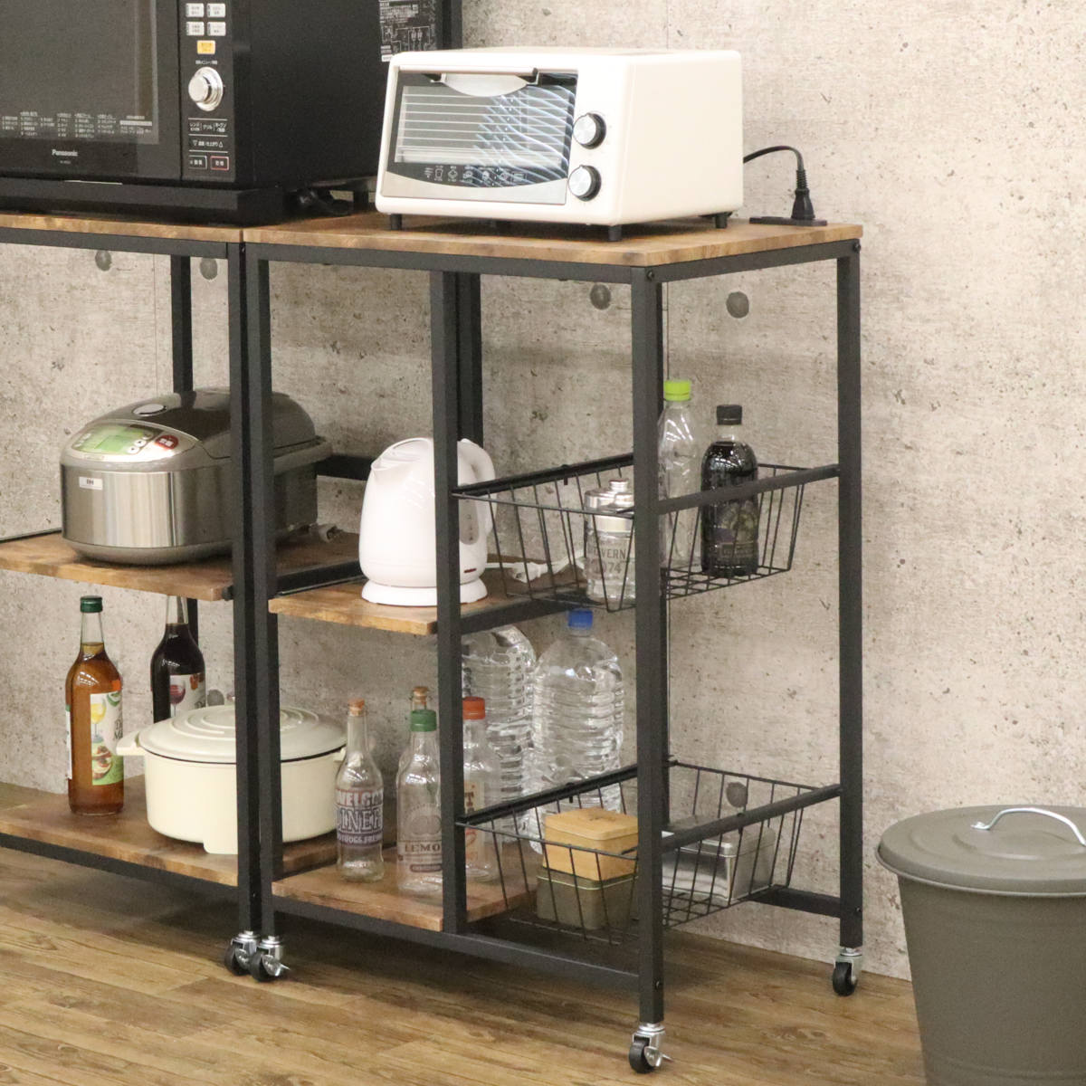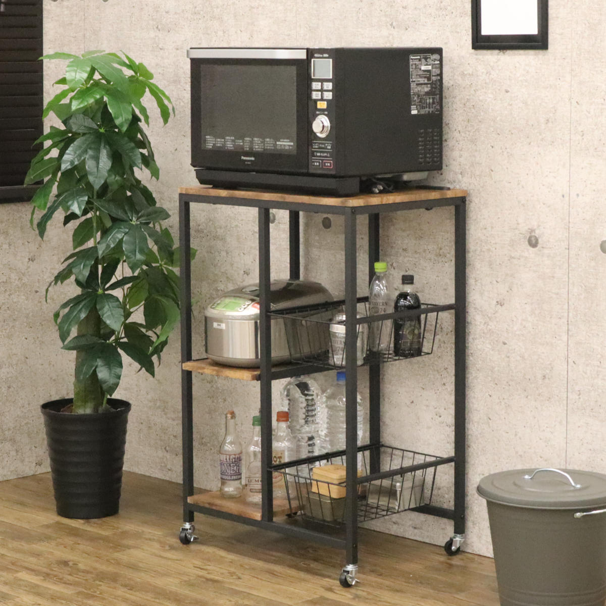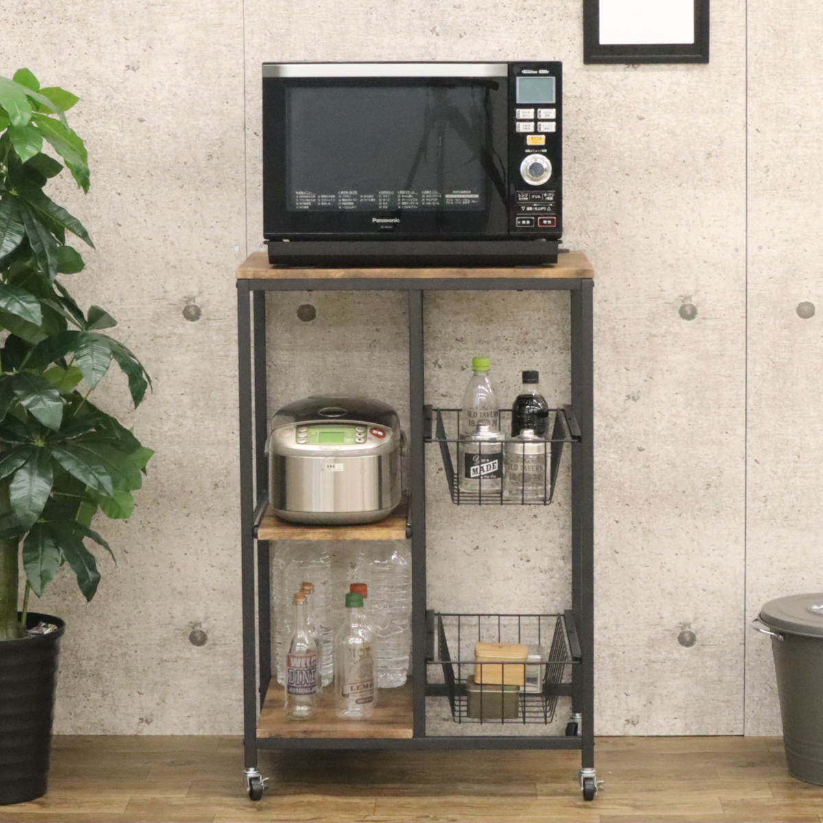 レンジラック ヴィンテージ調 スライドバスケット付 幅62cm ( キッチン収納 収納 メッシュ ラック 収納ラック キャスター レンジ台 家電収納 台所収納 収納ワゴン カゴ ブラウン ブラック おしゃれ )