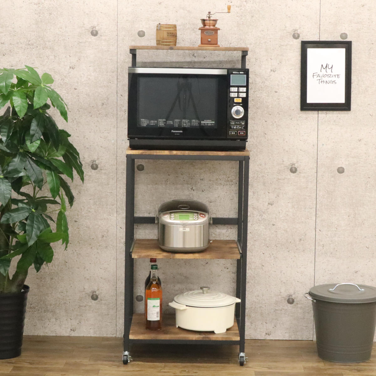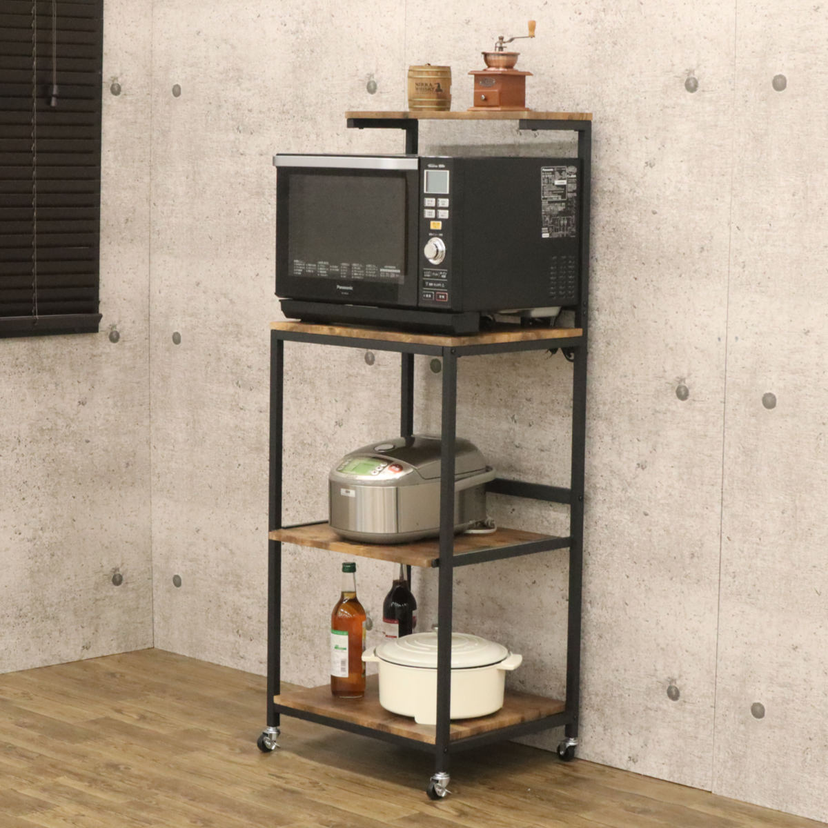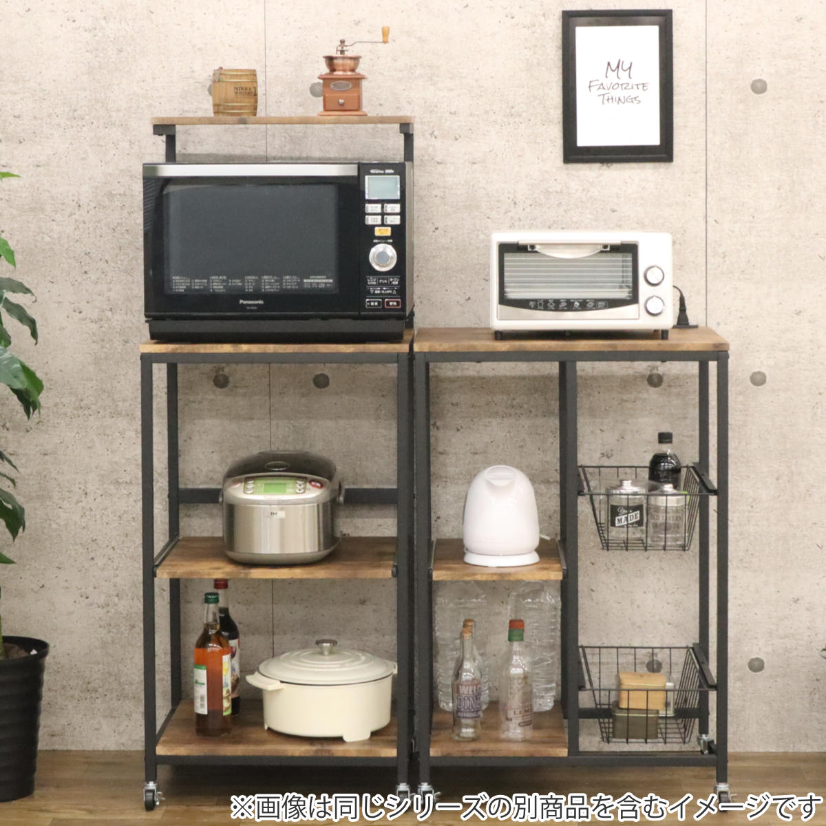 ヴィンテージ調のリアルな木目柄のPVCを使用したレンジラックです。落ち着きのあるカラーとシンプルなデザインでモダンな雰囲気を演出します。豊富な収納スペースで家電を一ヶ所に設置することができ、キッチンがすっきりと片付きます。
