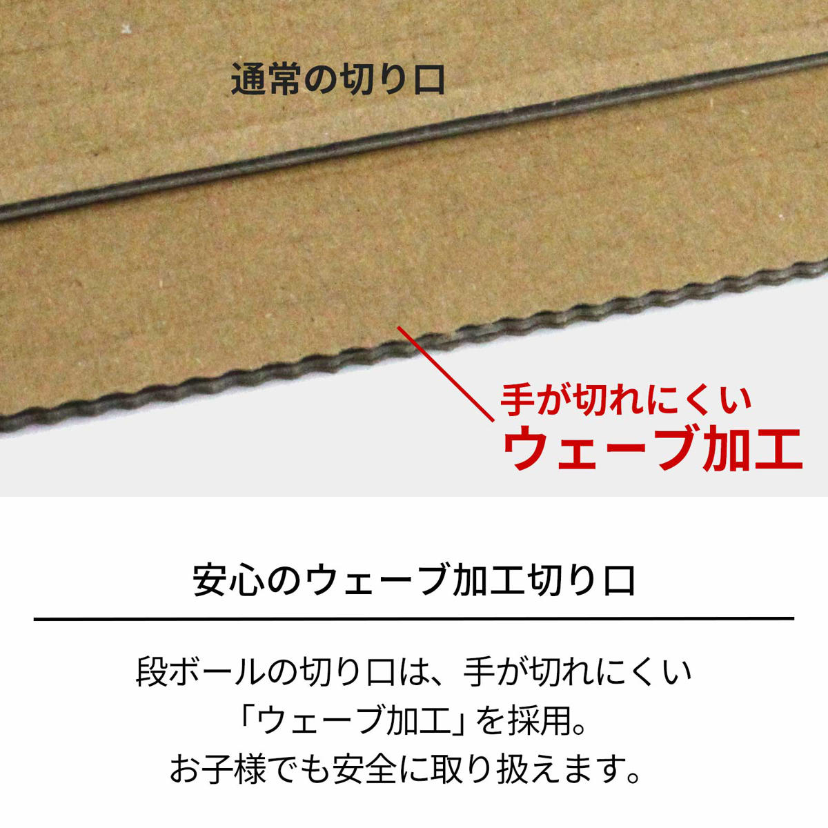 | すべり止めシール付き 底面には付属のゴム製すべり止めシールを付けられます。不意な揺れでもすべりにくいので安心です。 | 安心のウェーブ加工切り口 ダンボールの切り口は、手が切れにくい「ウェーブ加工」を採用。お子様でも安全に取り扱えます。 |