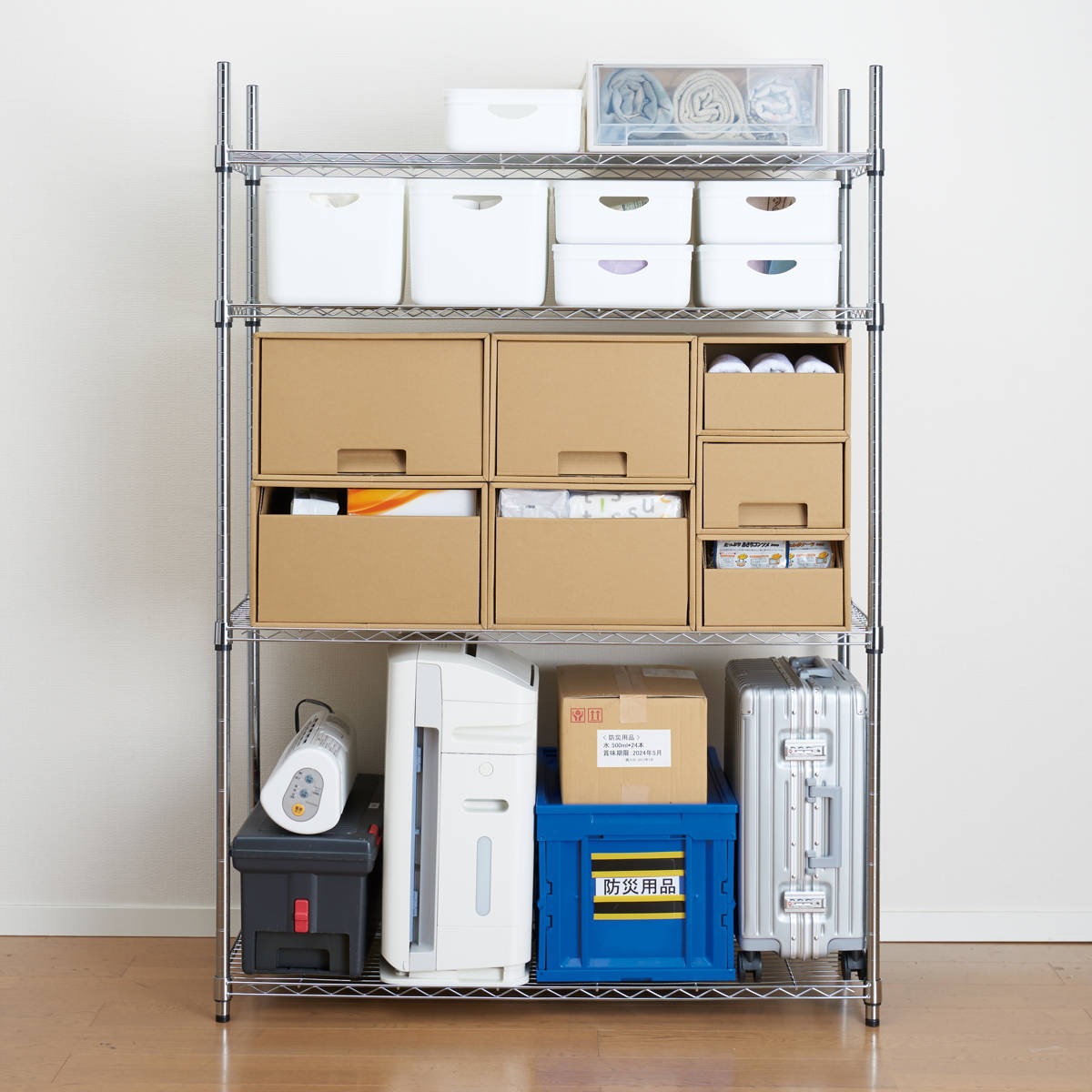 「横幅90cmと120cmのスチールラック」にぴったり合うサイズ設計で綺麗に並べられる為、余計な隙間が生まれにくいです。