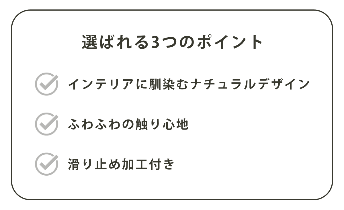 ボリュームのあるパイル地は、ふわふわとした肌ざわりが特長です。洗濯ネットを使用すればお洗濯も可能なので、いつでも清潔に保てます。