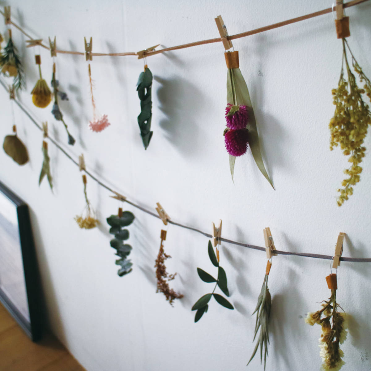 100cmの紐に色鮮やかなドライフラワーをピンチ止めしています。パッケージのままお部屋に飾ることもできます。