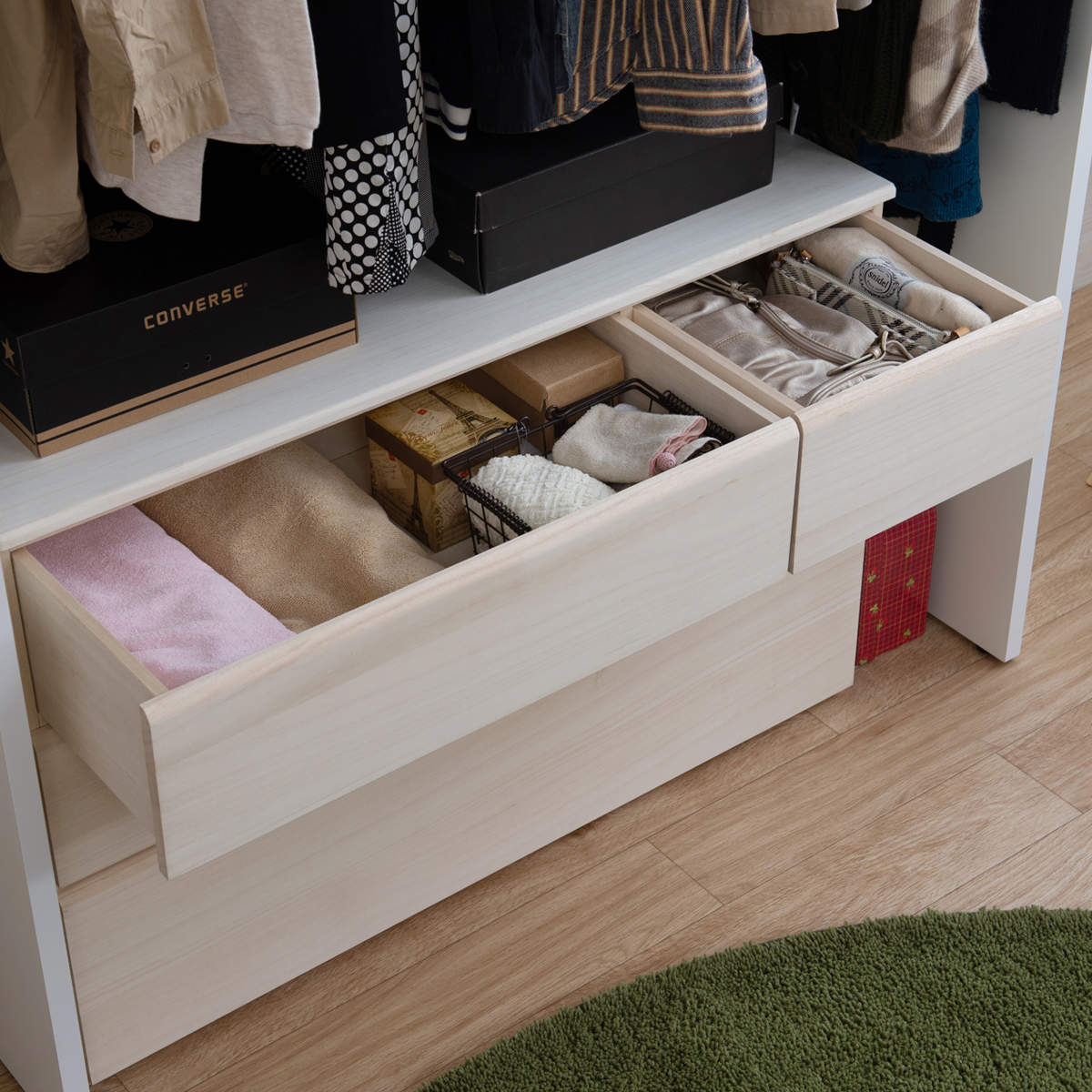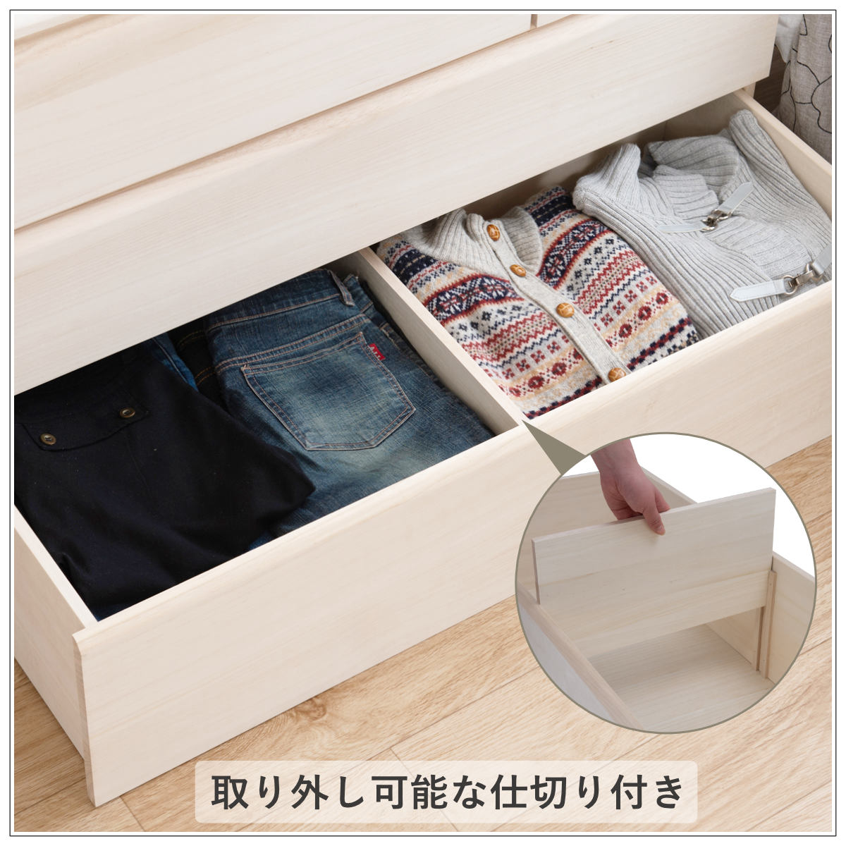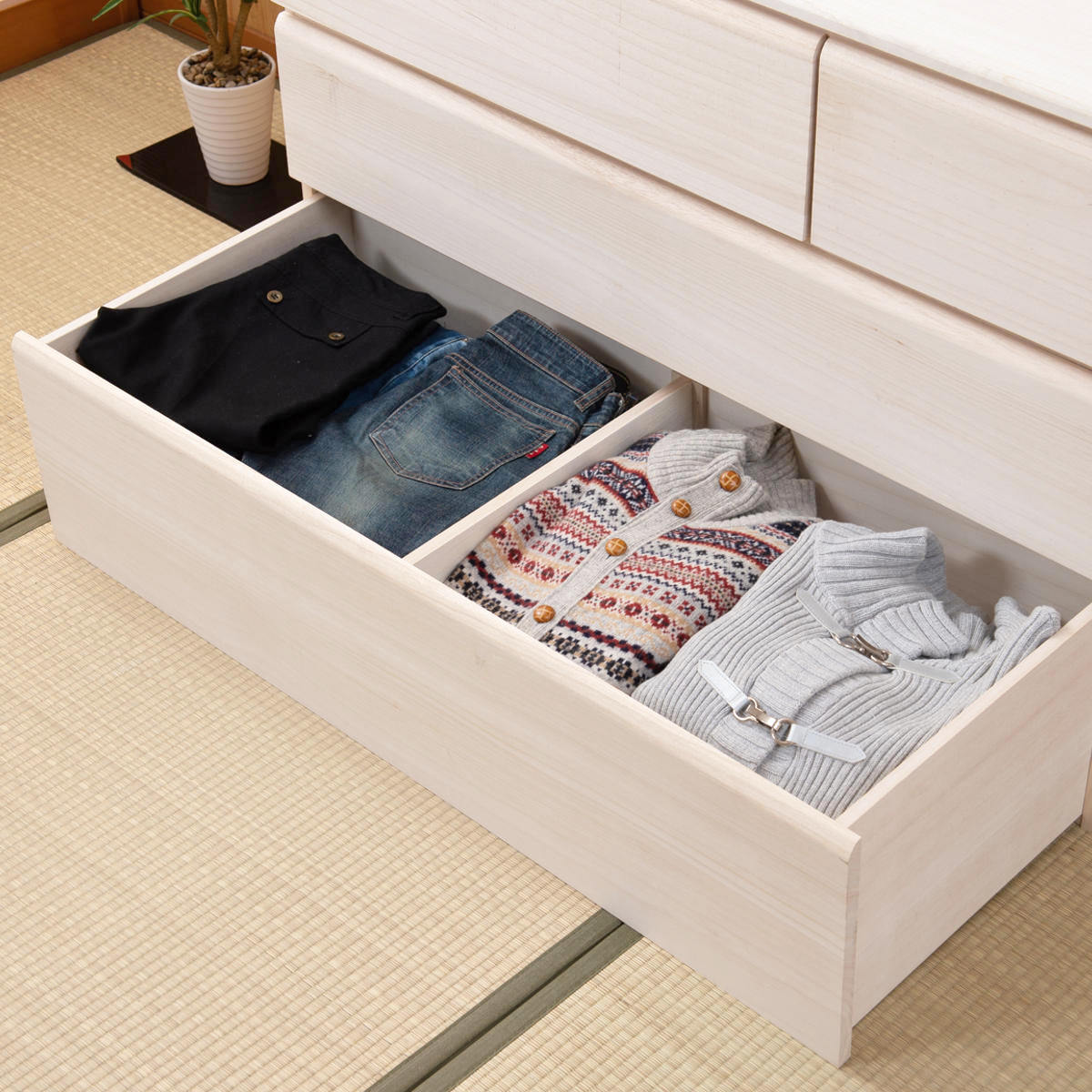 最下段の引出しの真ん中には、取り外し可能な仕切り付きです。洋服類の収納の際におすすめです。