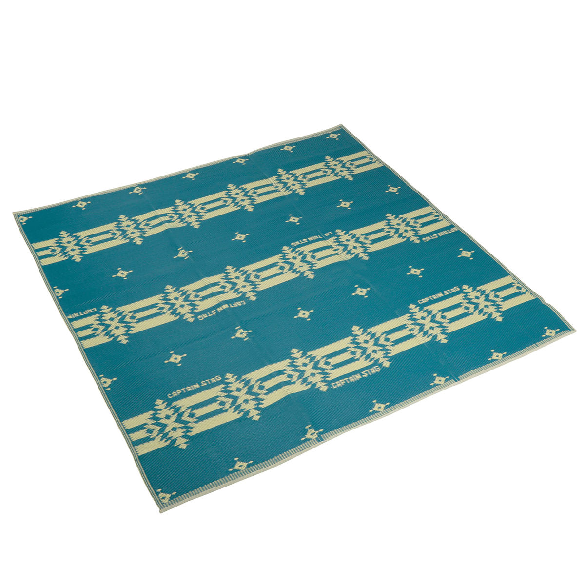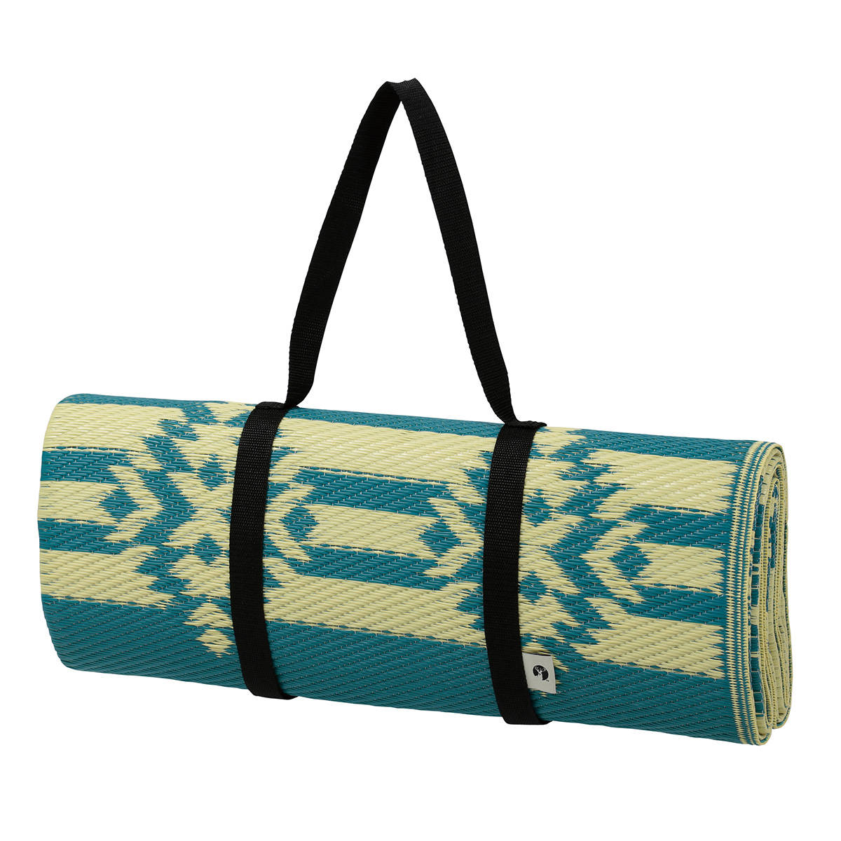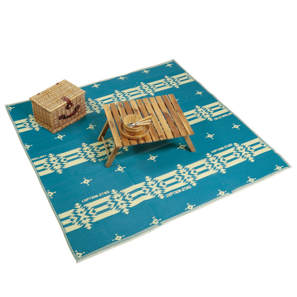 広々として大人2~3人でもゆったりとご使用いただけるサイズです。通常のレジャーシートとは違うゴザのような手触りで屋外でものびのびとくつろげます。通気性と水はけの良さがあり、丸洗いが可能です。ターコイズブルーの色味とネイティブな柄がおしゃれでアウトドアシーンにもピッタリです。