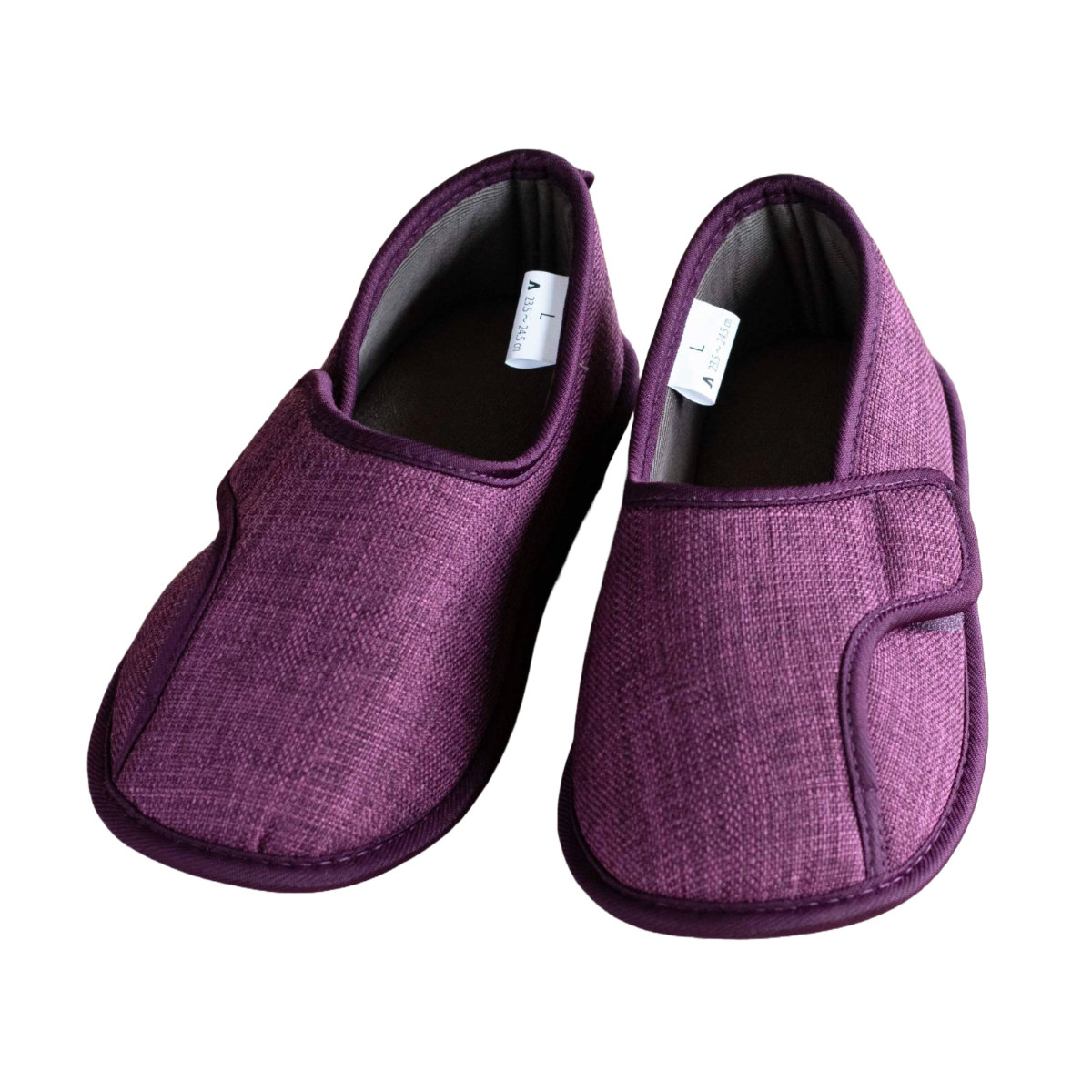 広めの履き口で大きく開くから足入れスムーズ、介助者にとっても履かせやすいルームシューズです。面ファスナー式なので足の状態に合わせて調整できます。