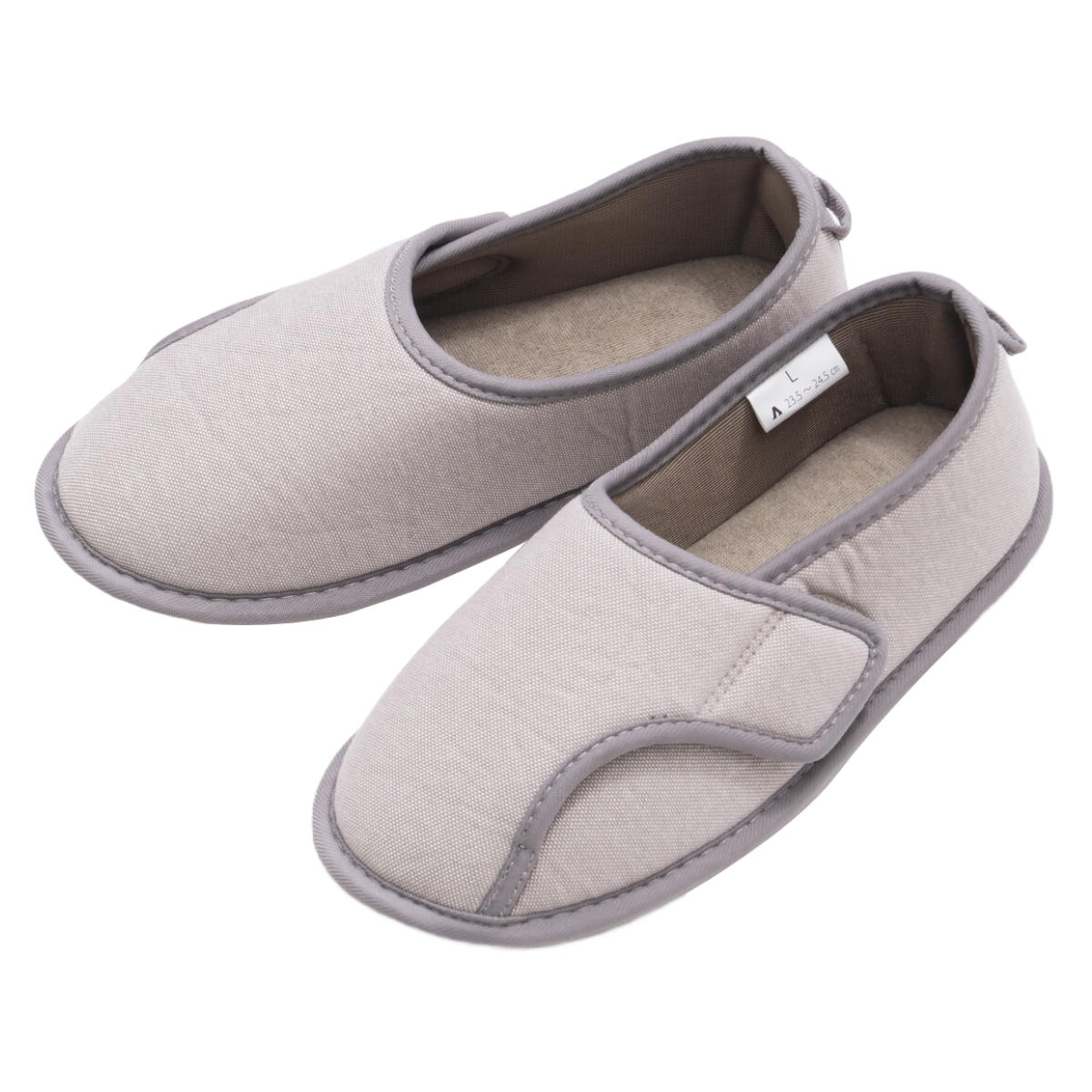 広めの履き口で大きく開くから足入れスムーズ、介助者にとっても履かせやすいルームシューズです。面ファスナー式なので足の状態に合わせて調整できます。
