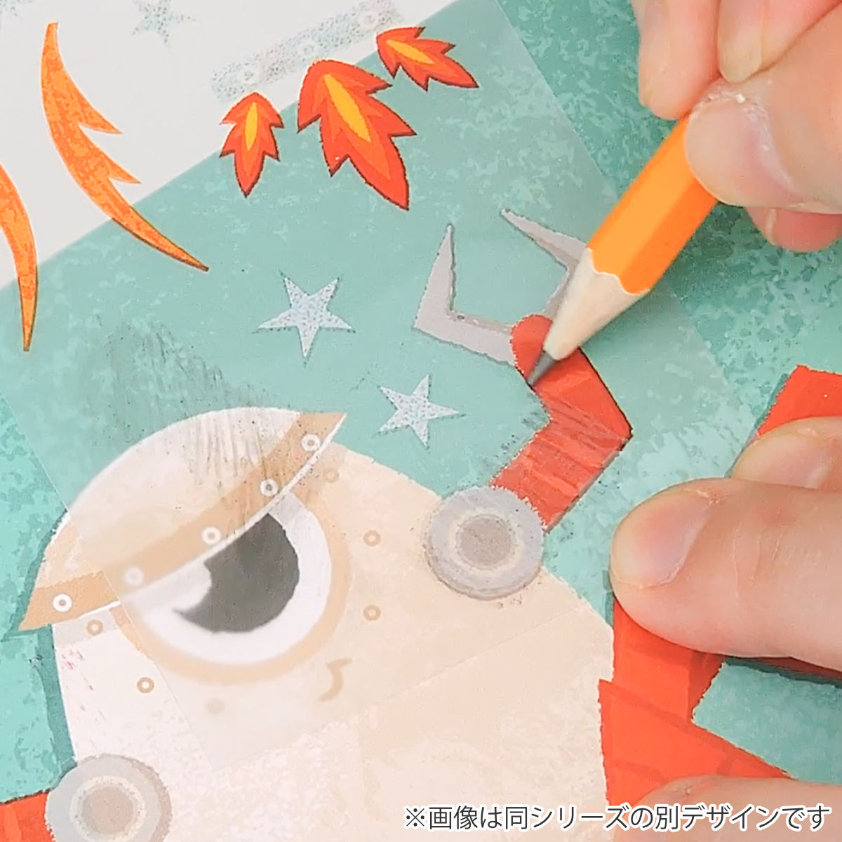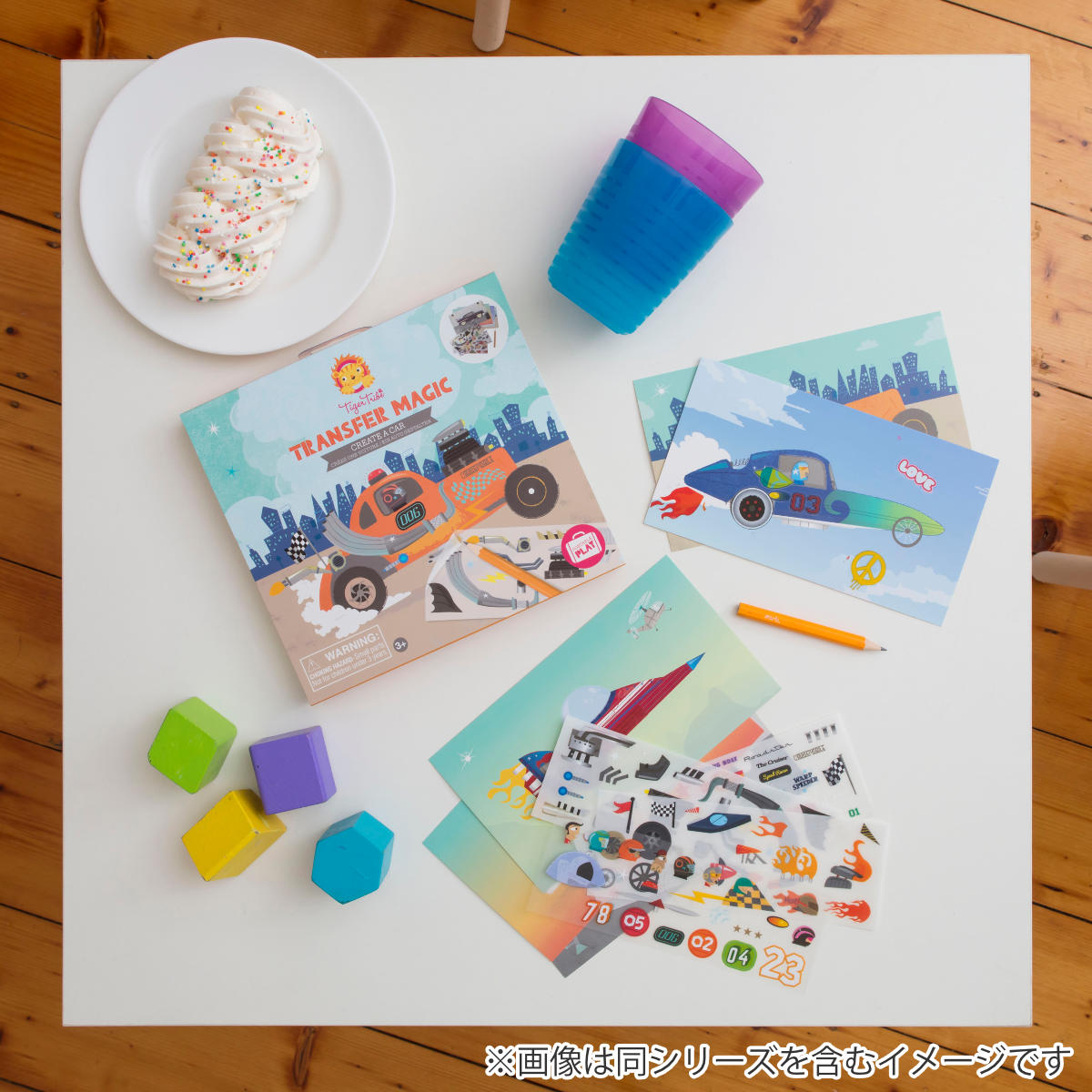転写シールをエンピツでこすって貼り付け、素敵な作品を作りましょう。転写シールは普通のシールとは違い、イラストの部分だけをこすって転写することができるシールです。シールには白い枠がないので、まるで最初から一枚のイラストのように仕上げられます。一枚一枚丁寧に、時間をかけて遊べます。お子さまの指先と想像力が鍛えられます。