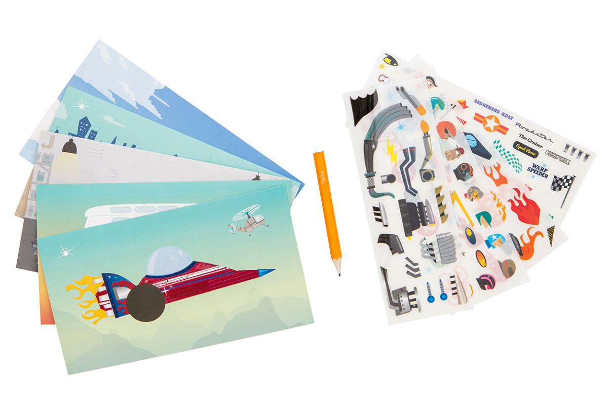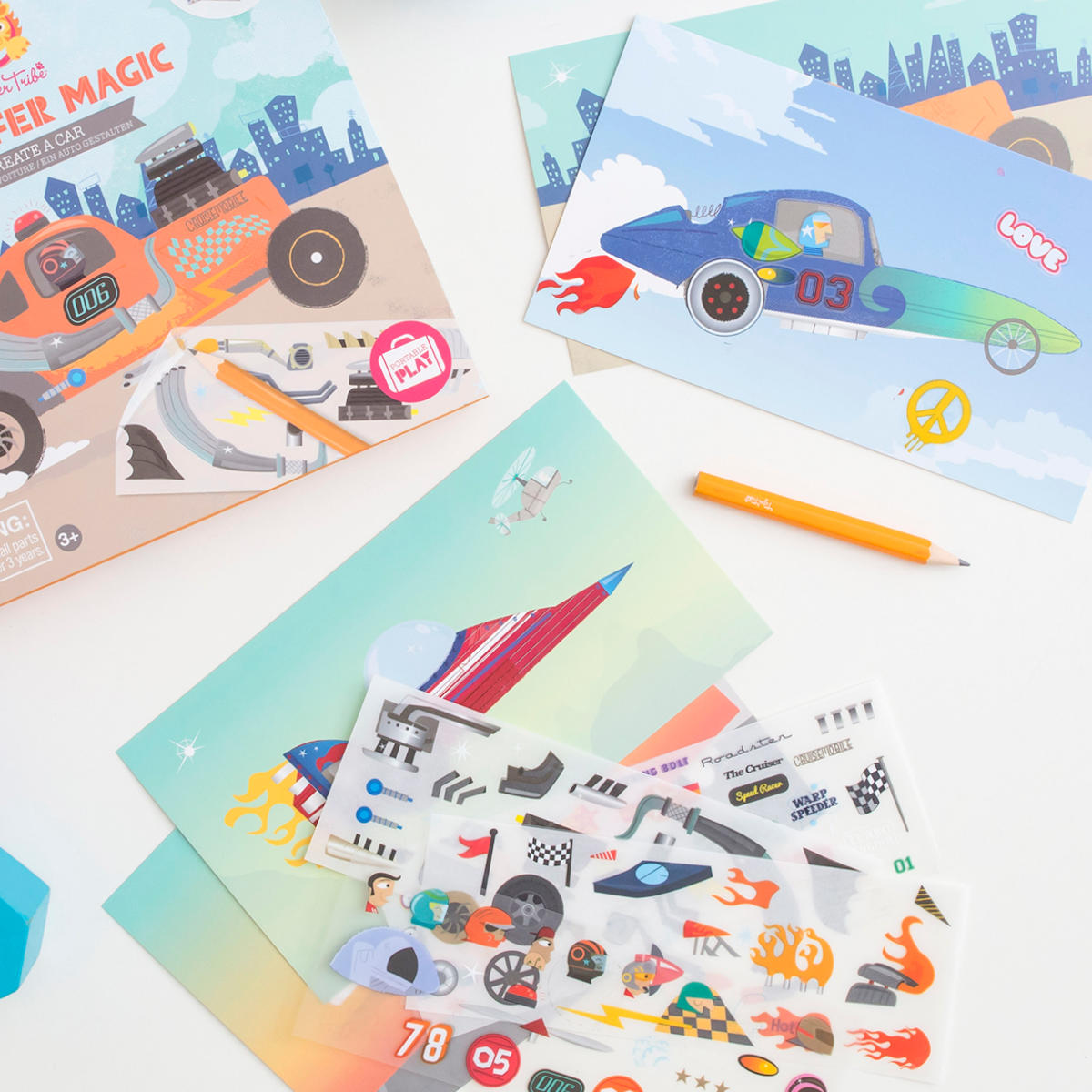 パーツの転写シールをどんどんつけて、おしゃれでかっこいいスポーツカーをデザインしましょう。しっかりとした台紙なので、出来上がったあとお部屋に飾るのも素敵です。