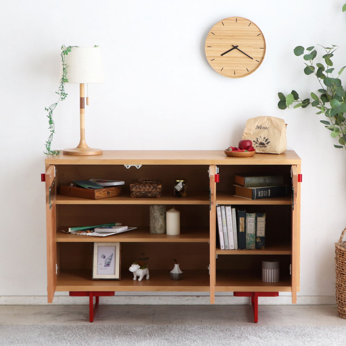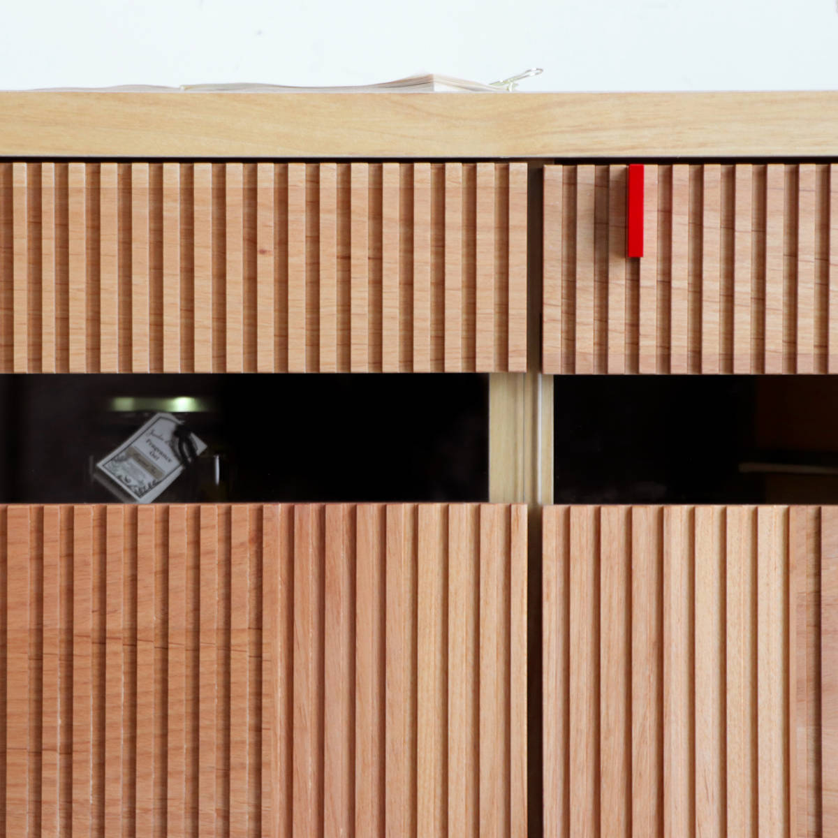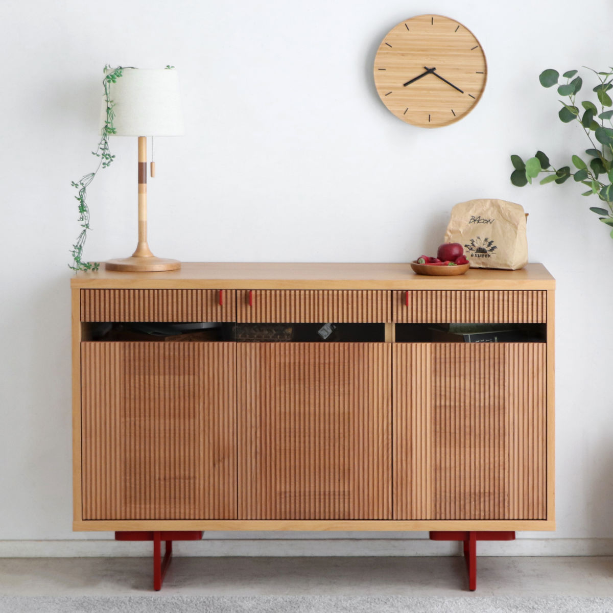 木目とアクセントの赤が映える和モダンサイドボード