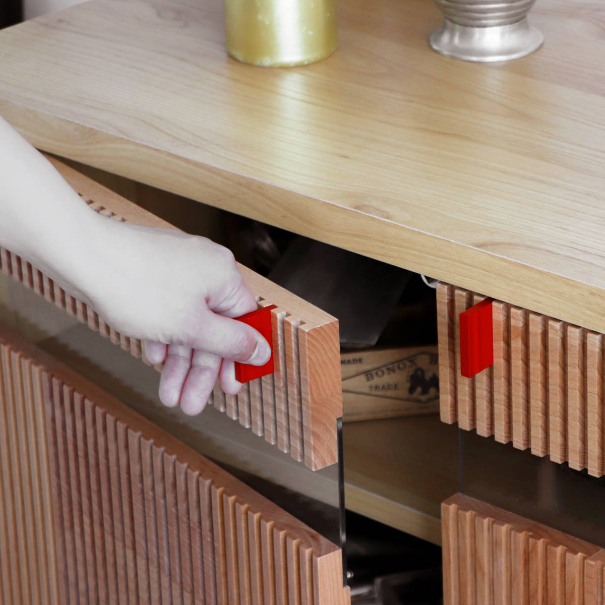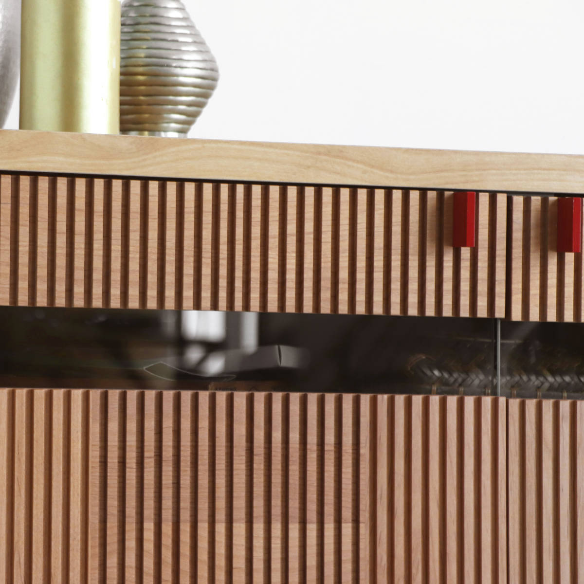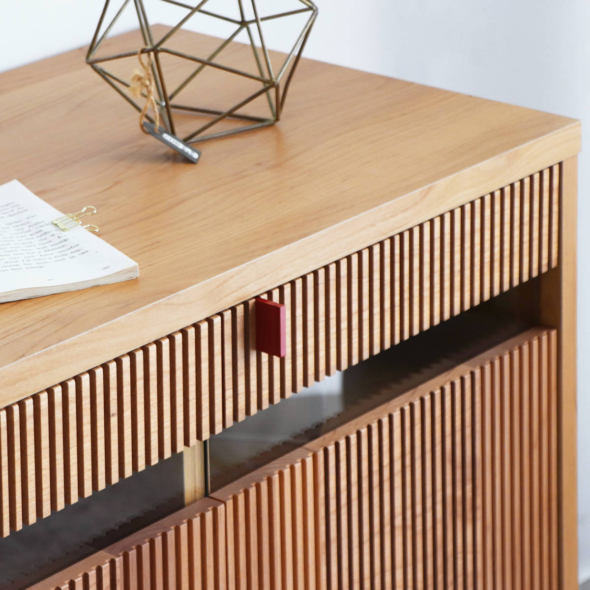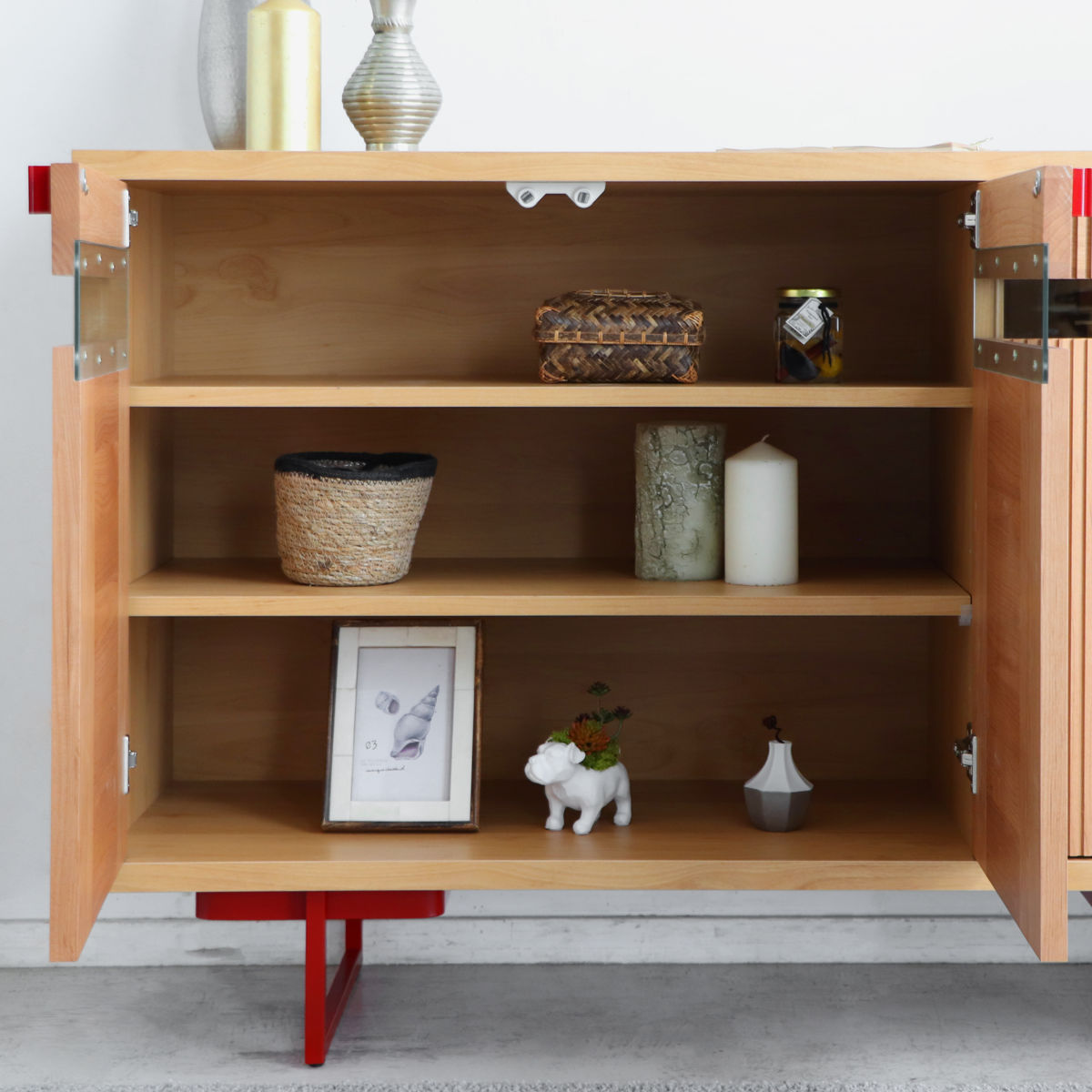 木目とアクセントの赤が映える和モダンサイドボード