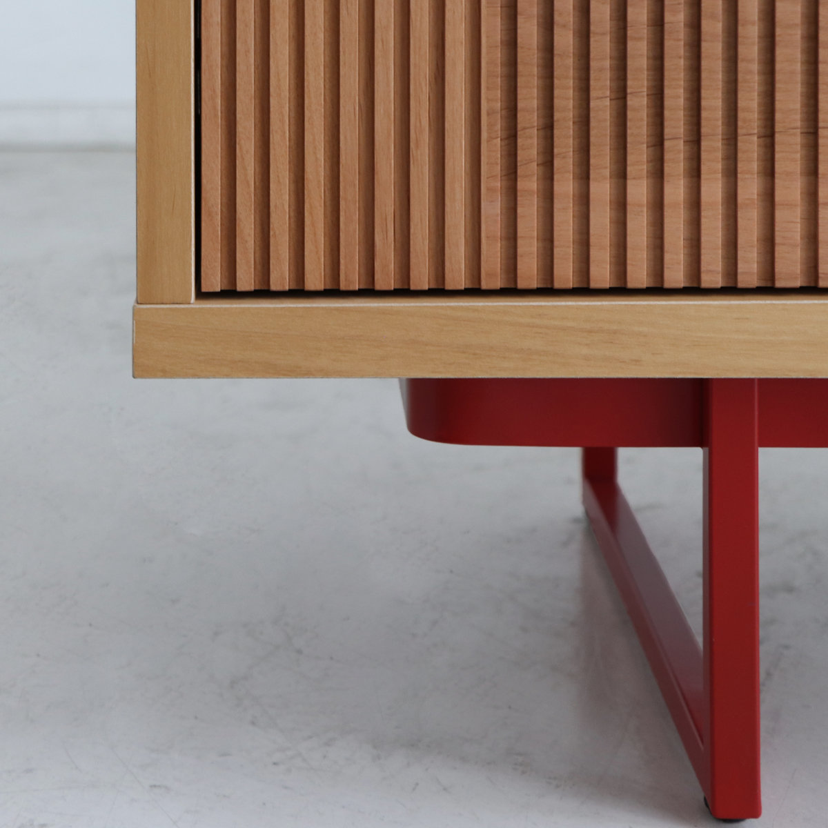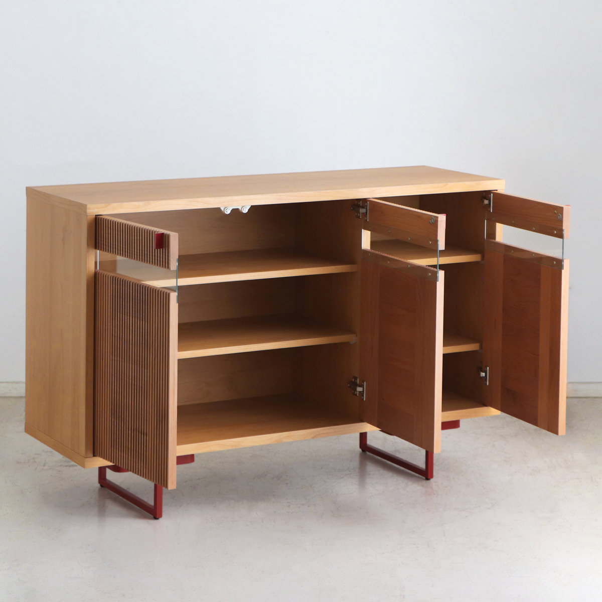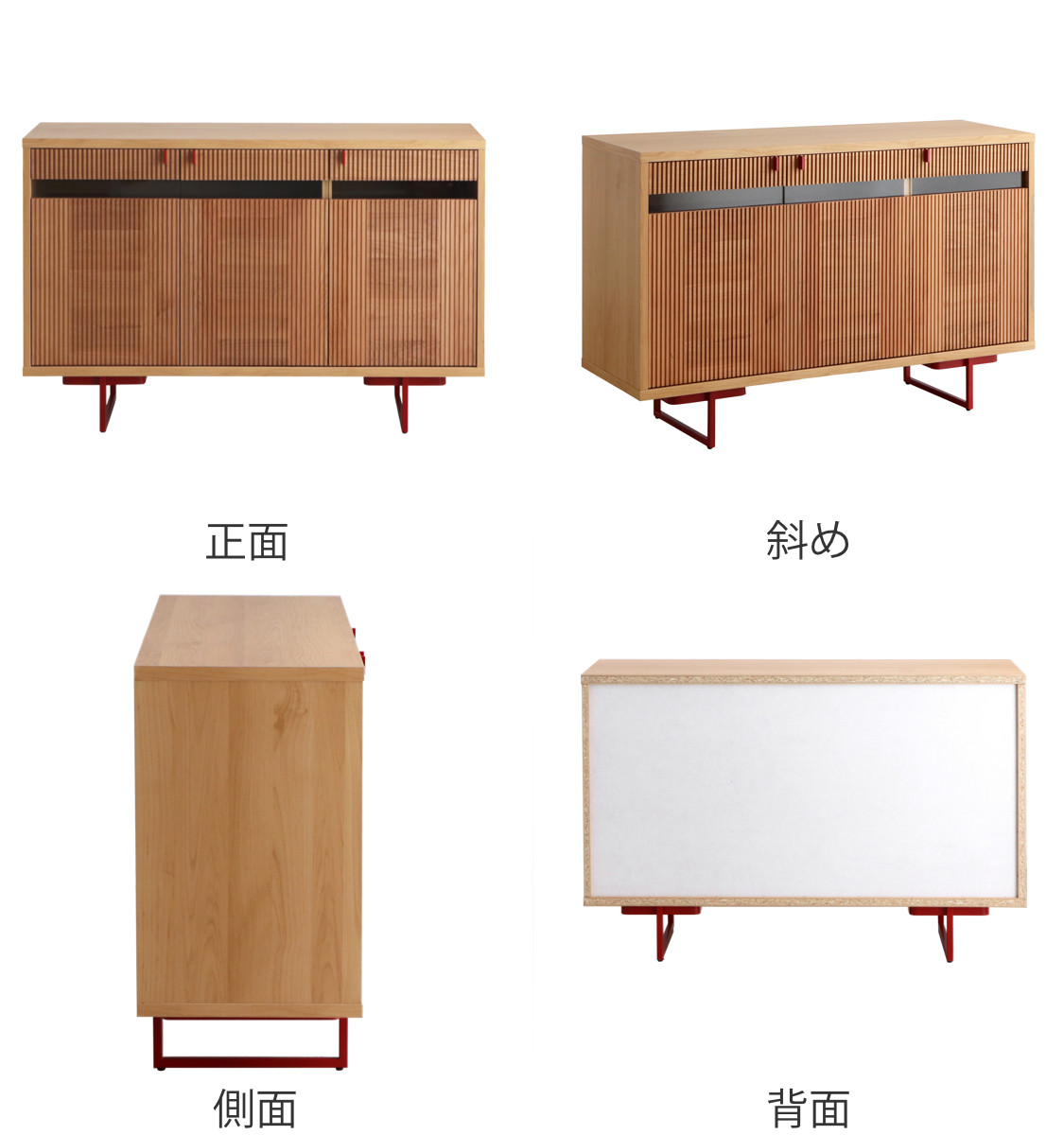 美しく掘り込み加工されたアルダー無垢と、アクセントの赤の取っ手と脚が魅力のサイドボードです。汚れに強く、耐久性に優れたウレタン塗装仕上げです。