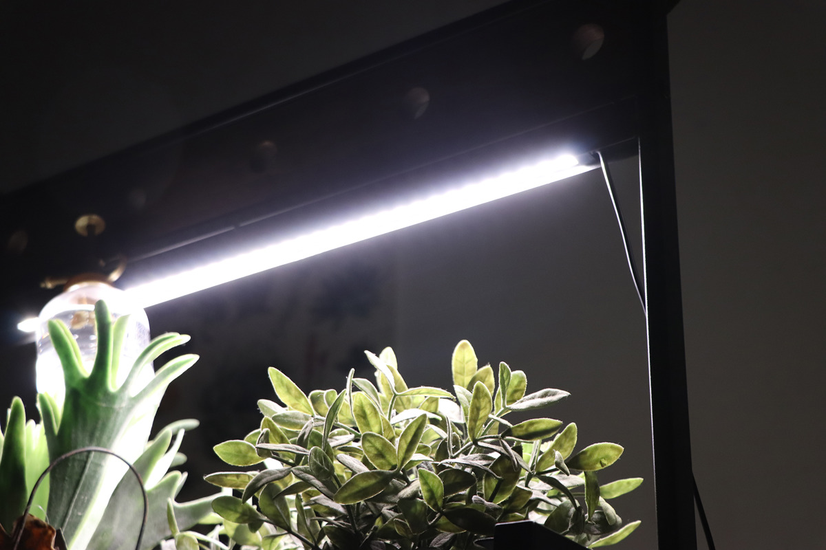 雨の日や日中カーテンを閉めて外出するなど、様々な状況でも植物が育つように光を放ちます。夜間には間接照明としてワゴンを中心に優しく明かりが広がります。