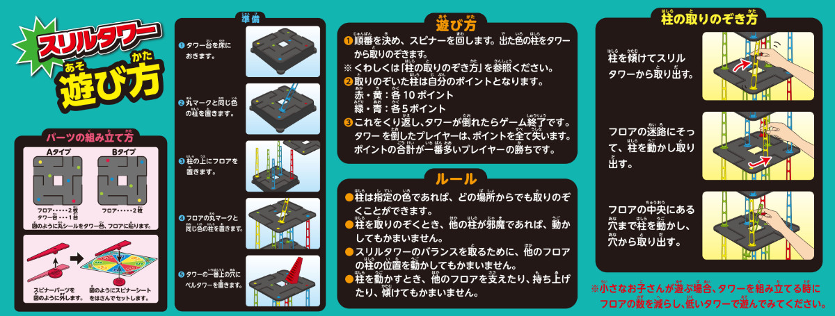| 内容量 | 1個 【セット内容】 タワー台:1台 柱:12本(赤、黄:各4本、緑、青:各8本) ベルタワー:1個 フロア:4枚 スピナーシート:1枚 丸シール:1枚 スピナーパーツ:1個 |