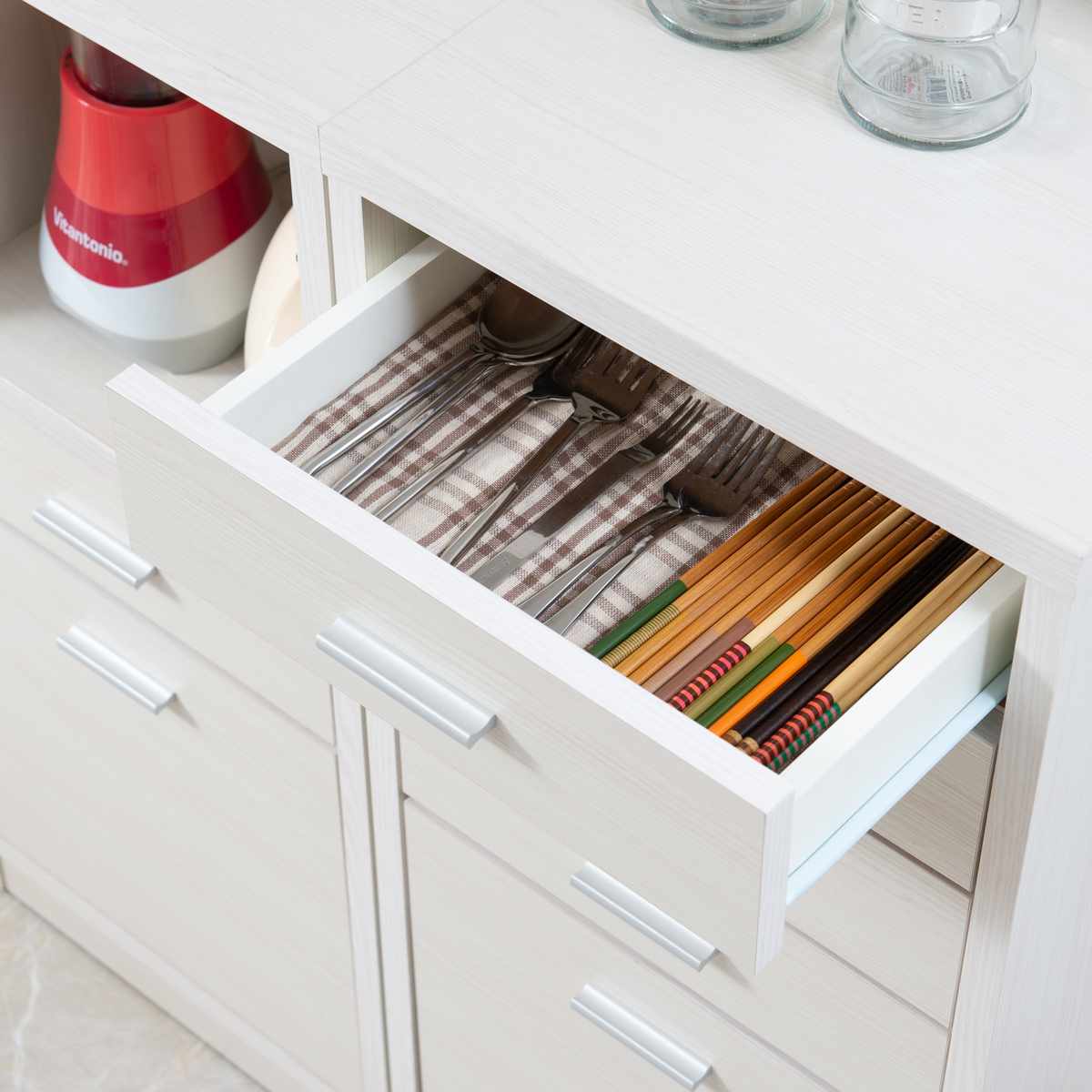5杯の引出しを備えているので、小物類をスッキリ整理できます。最下段の引出しは2Lペットボトルが収納できる深さがあり、ストック置きにもぴったりです。さらにスライドレール付きで、開閉もスムーズに行えます。