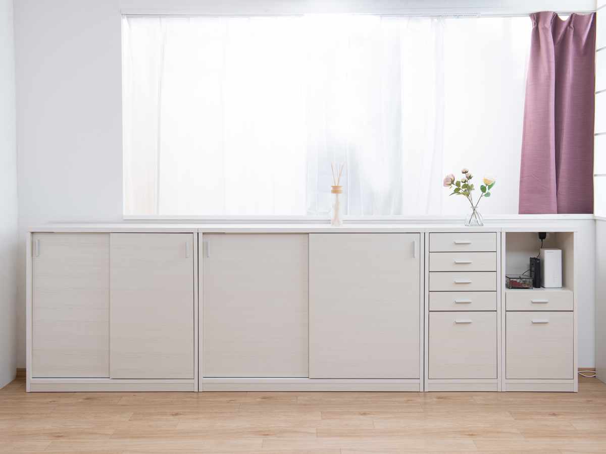 同じ高さで設計された同シリーズのオープンラックやチェストと組み合わせると、統一感のある空間に仕上がります。