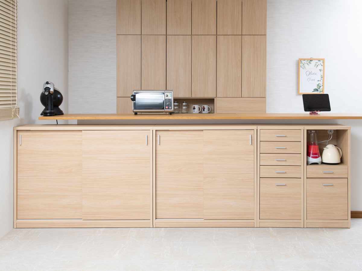 スクエアデザインでシンプルに仕上げたキャビネットです。高さ約88cmとカウンター下に収まりやすいサイズで、空いたスペースを有効活用できます。