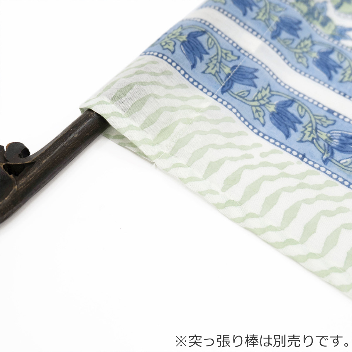 「ブロックプリント」とは木版を使って、職人が手でスタンプを押すように生地の上にプリントして作られるインドの伝統的な布です。温かみの感じられるハンドメイドののれんです。