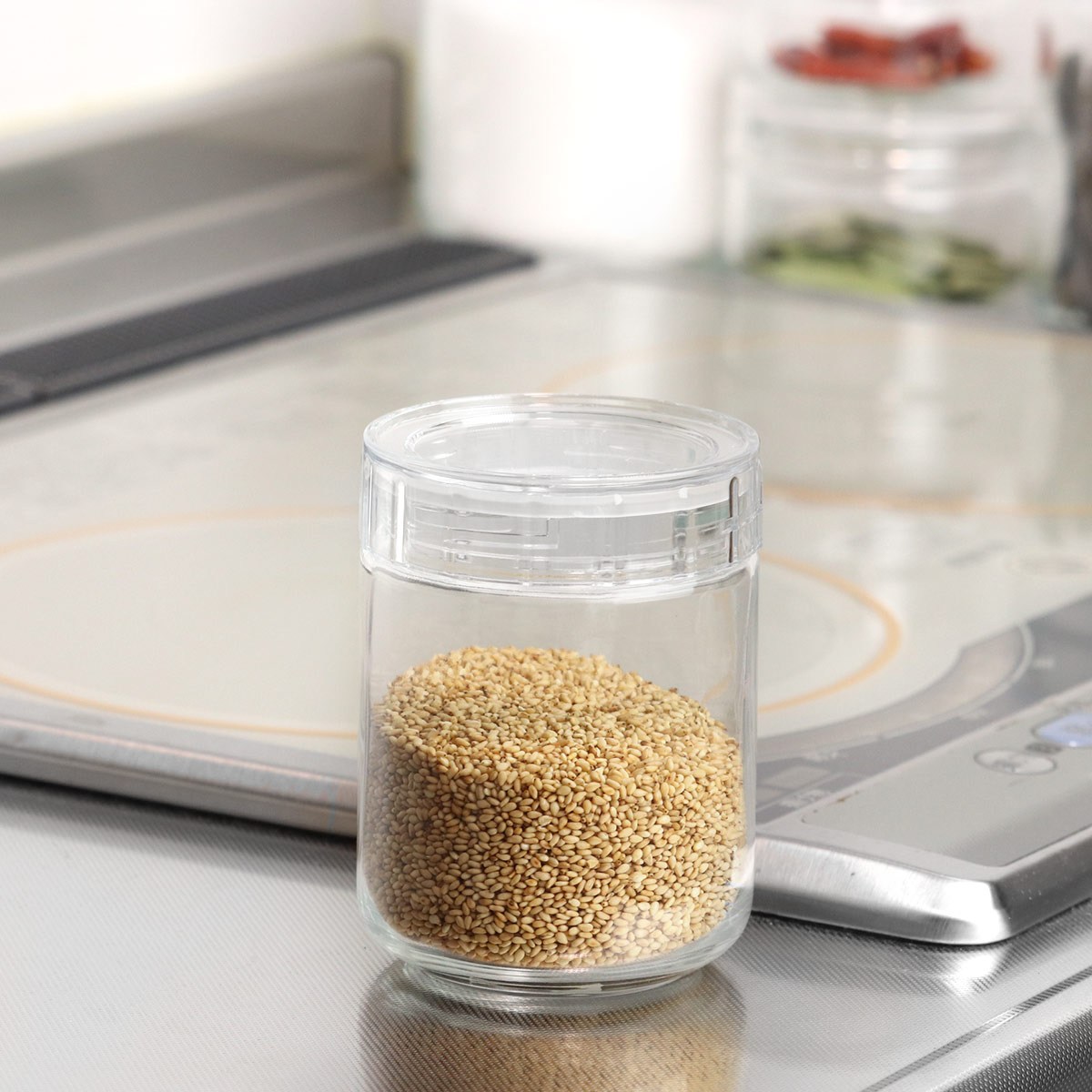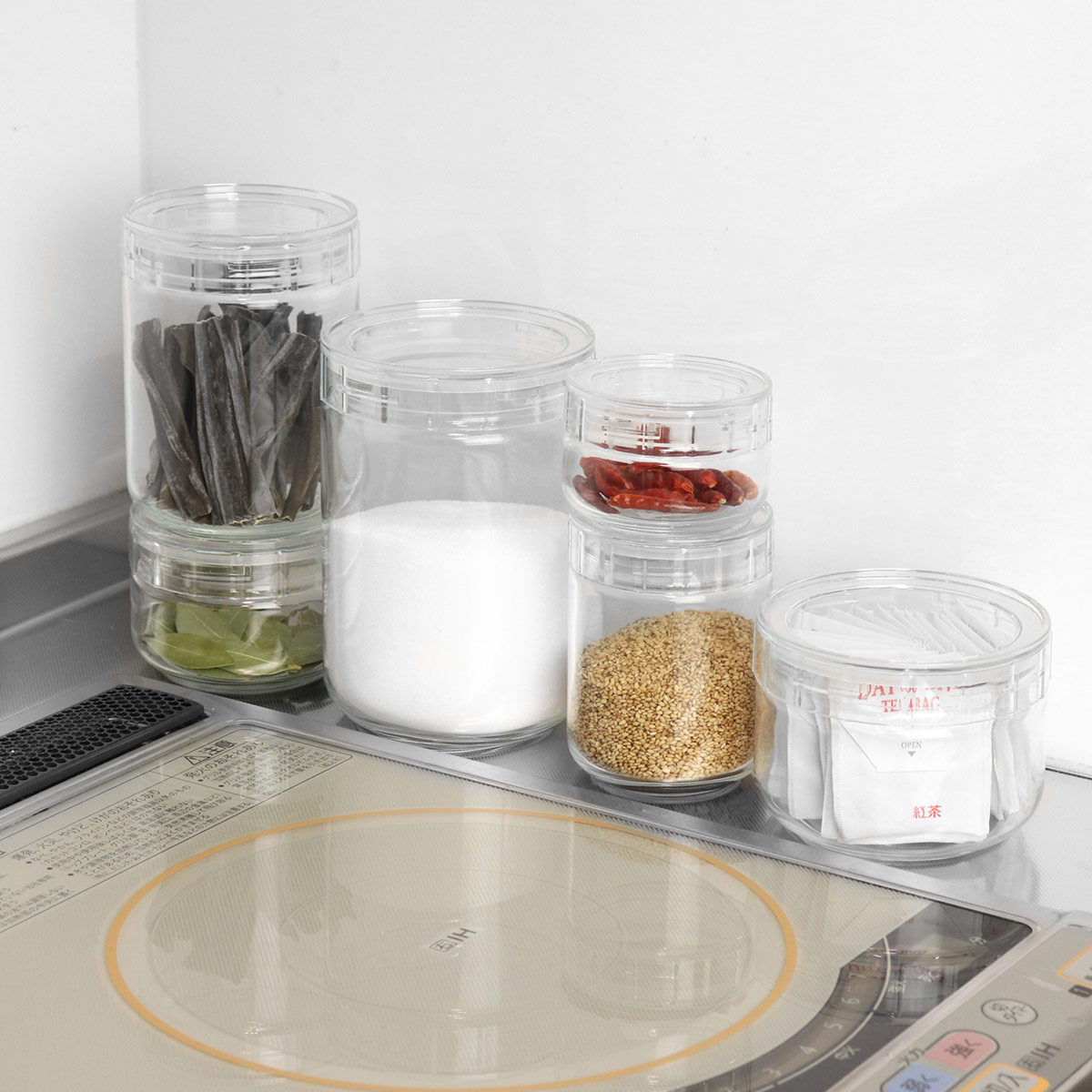 フタには縁があるので安定して重ねられます。重ねて並べれば、ごちゃごちゃしがちなキッチンもスッキリとした印象に。透明度の高いガラスで中身がよく見えるので、ストック管理にも役立ちます。