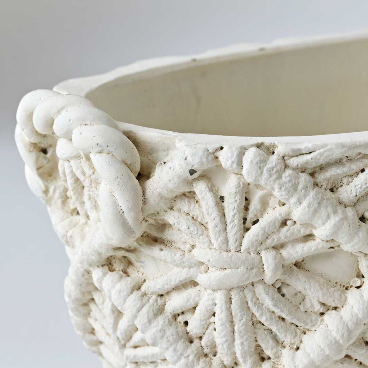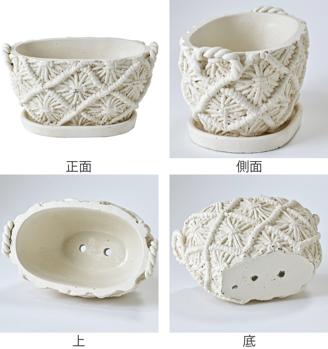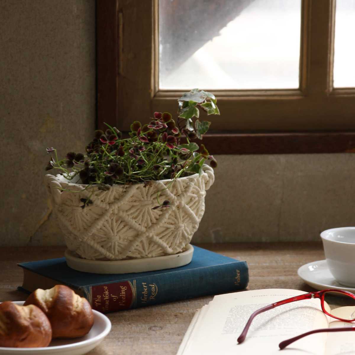 マクラメ編みのカゴの質感を再現した陶器プランターです。植物がよく映えるナチュラルなホワイトカラーは、どんなインテリアにも馴染みます。