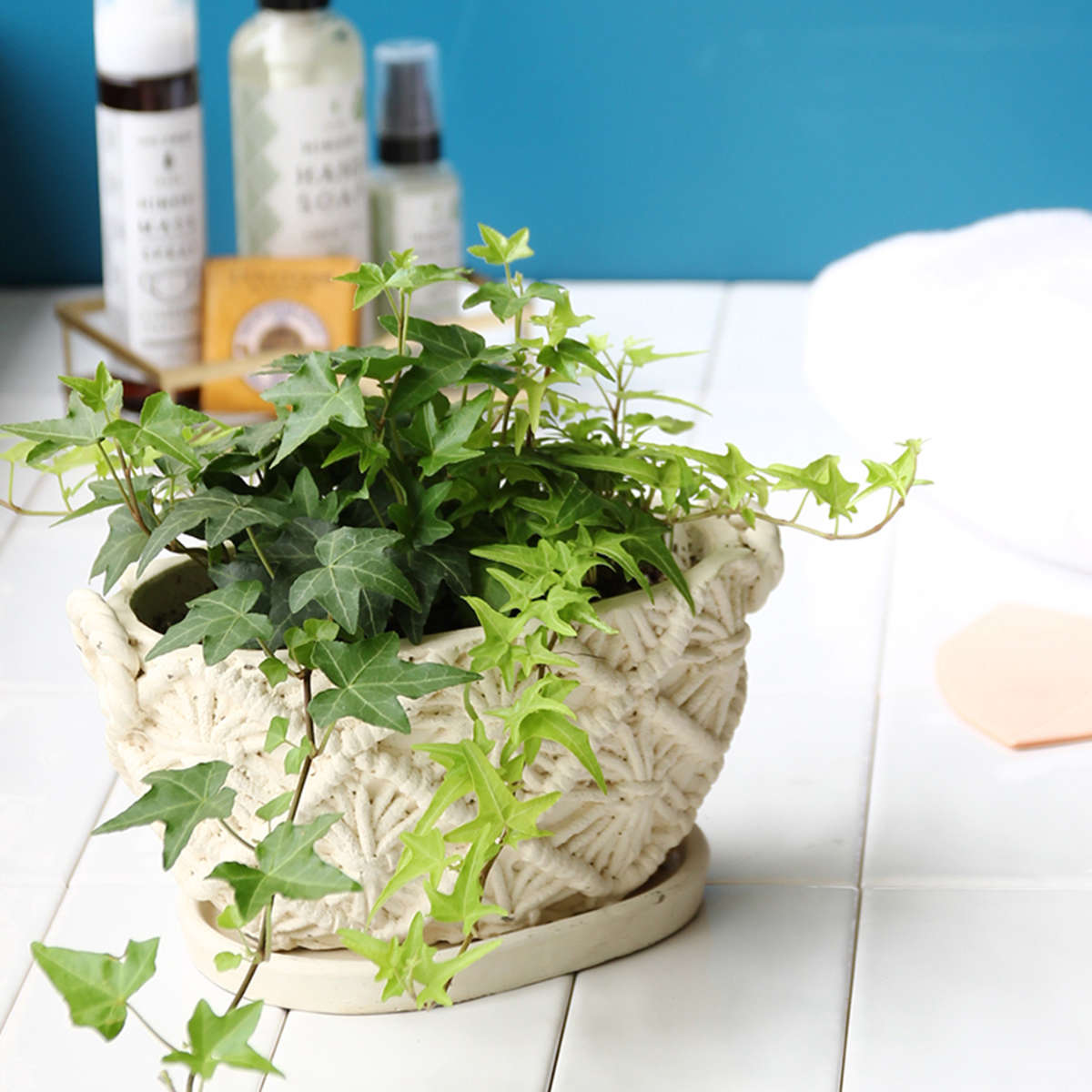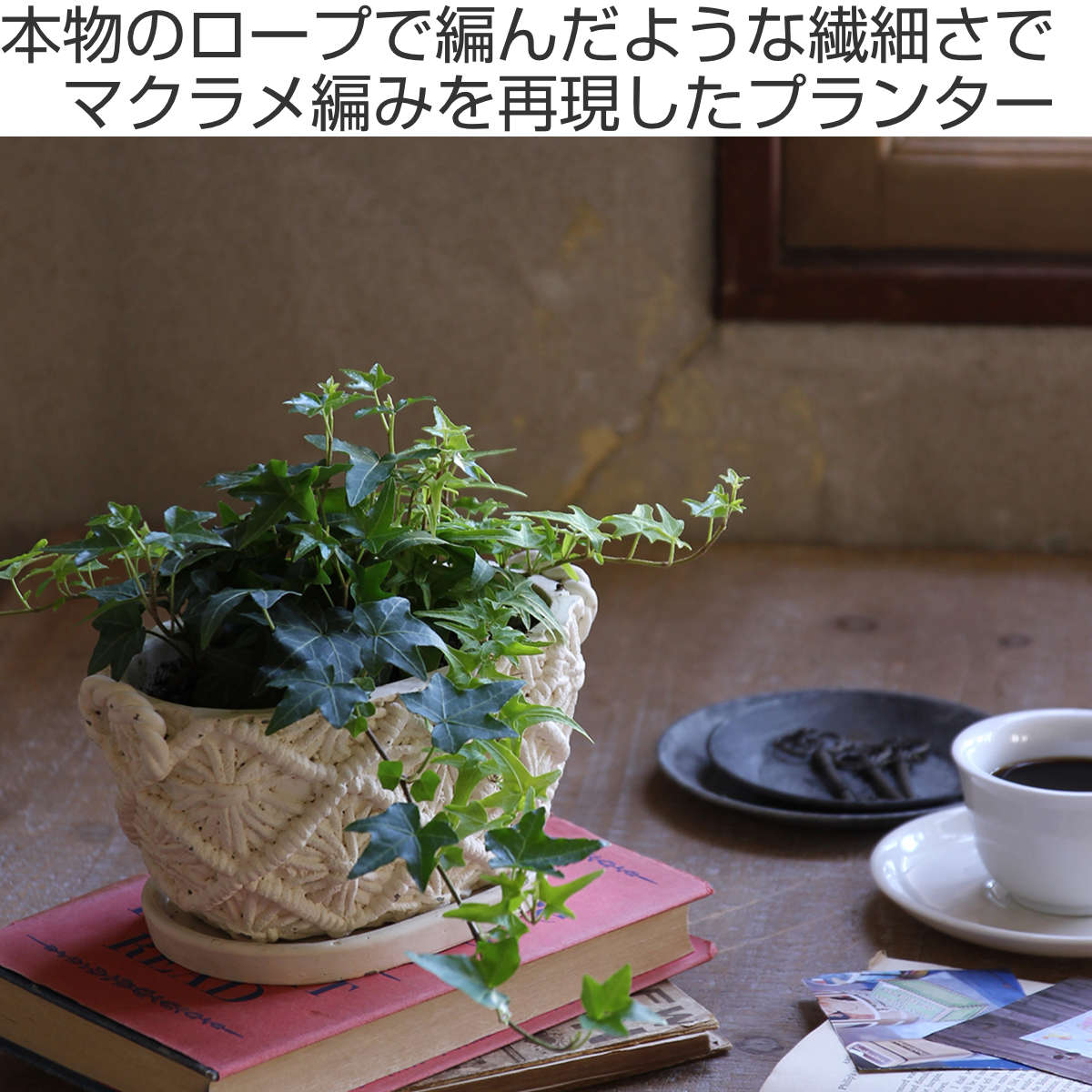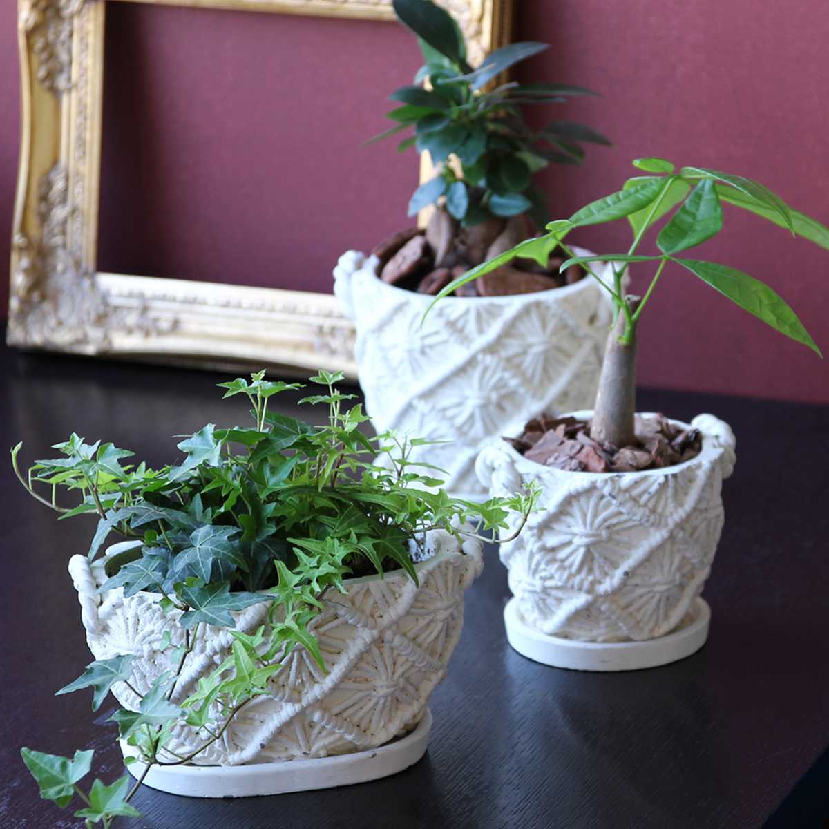 マクラメ編みのカゴの質感を再現した陶器プランターです。植物がよく映えるナチュラルなホワイトカラーは、どんなインテリアにも馴染みます。