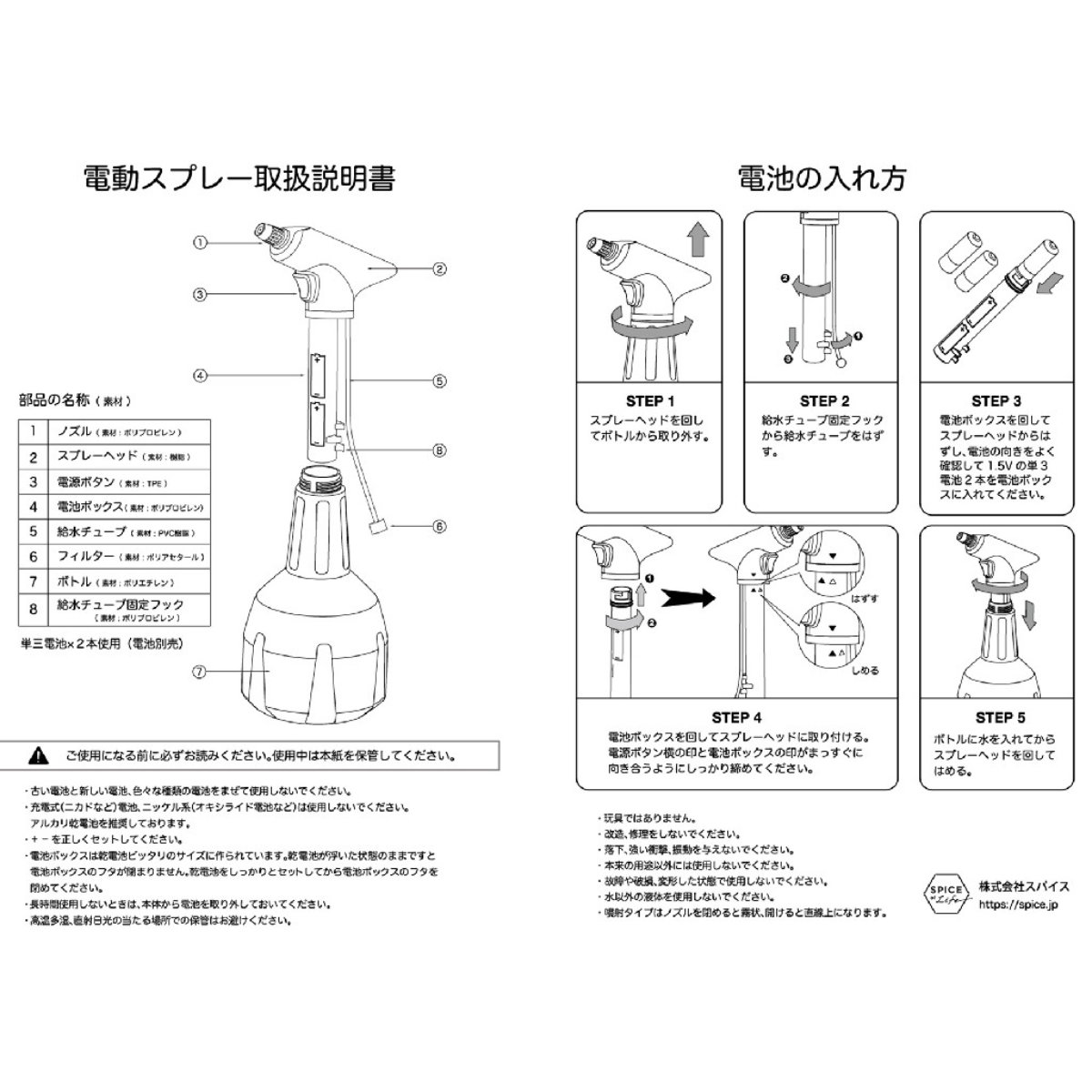 スプレーヘッドを回して、ボトルから取り外し、電池ボックスに単三電池2本を入れるだけの簡単仕様です。電源ボタンを押すだけで自動で噴霧します。