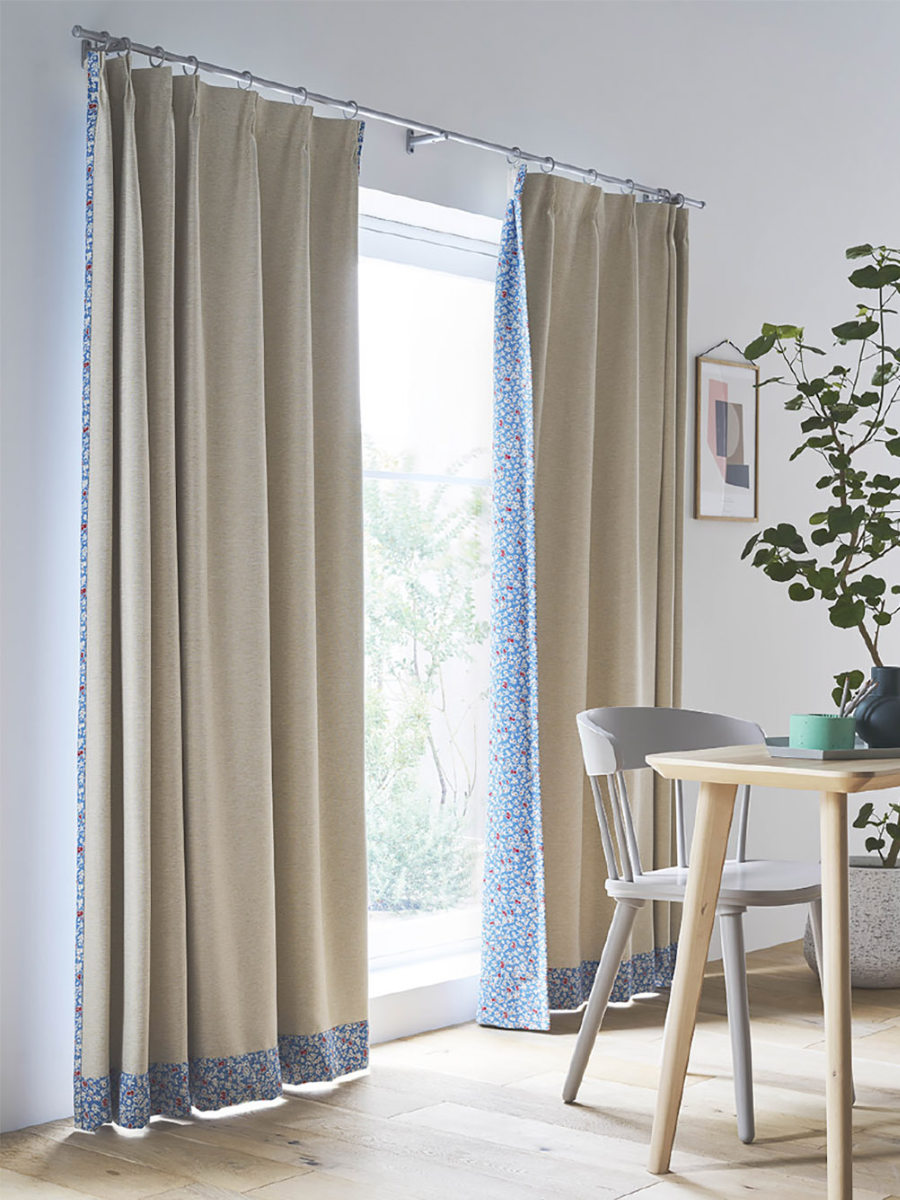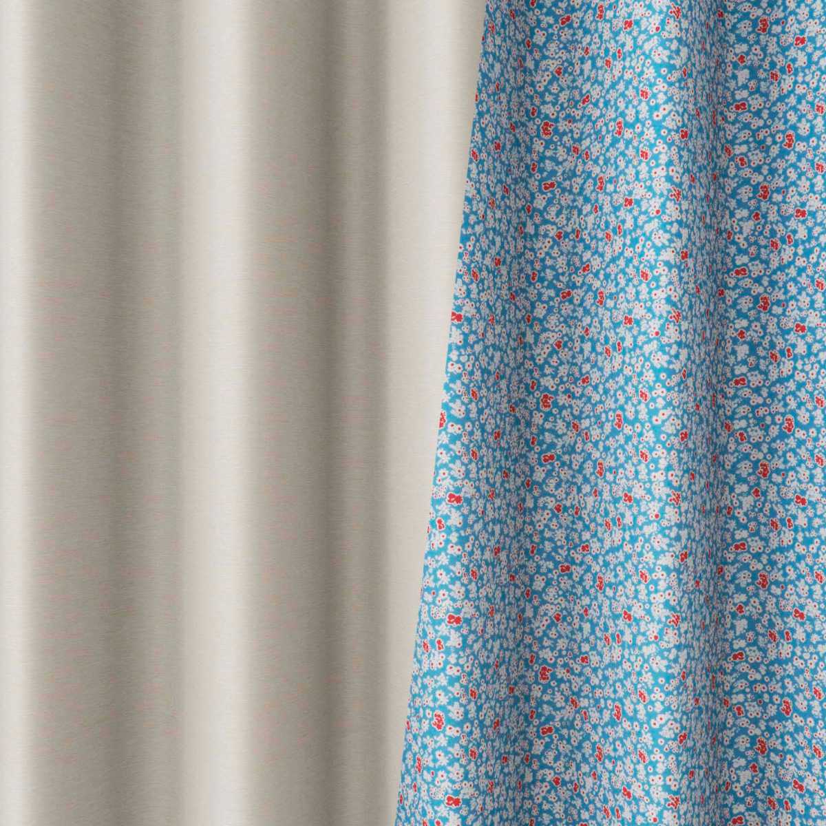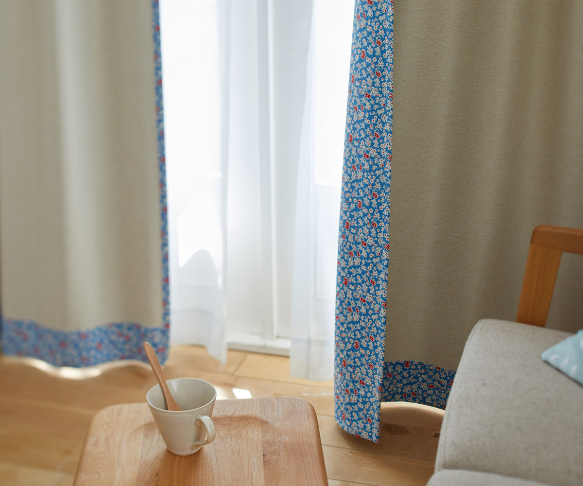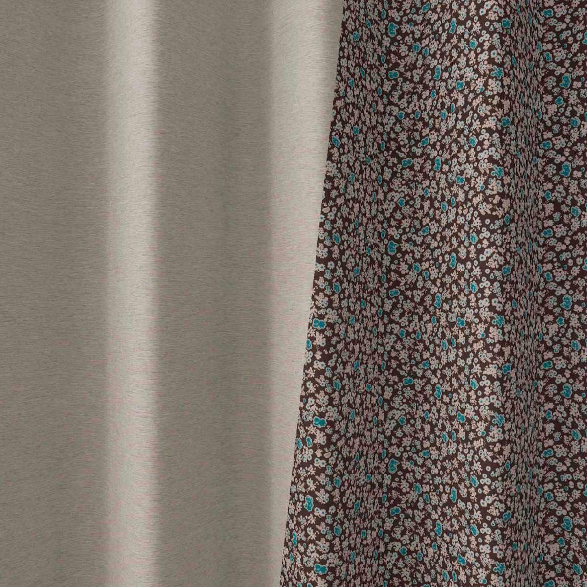 裏面の柄をチラ見せする縫製のバックプリントカーテンです。室内からはシンプルな無地のデザインが主に見えますが、外からは裏面にあしらわれたレトロな雰囲気の小さなお花が見えます。