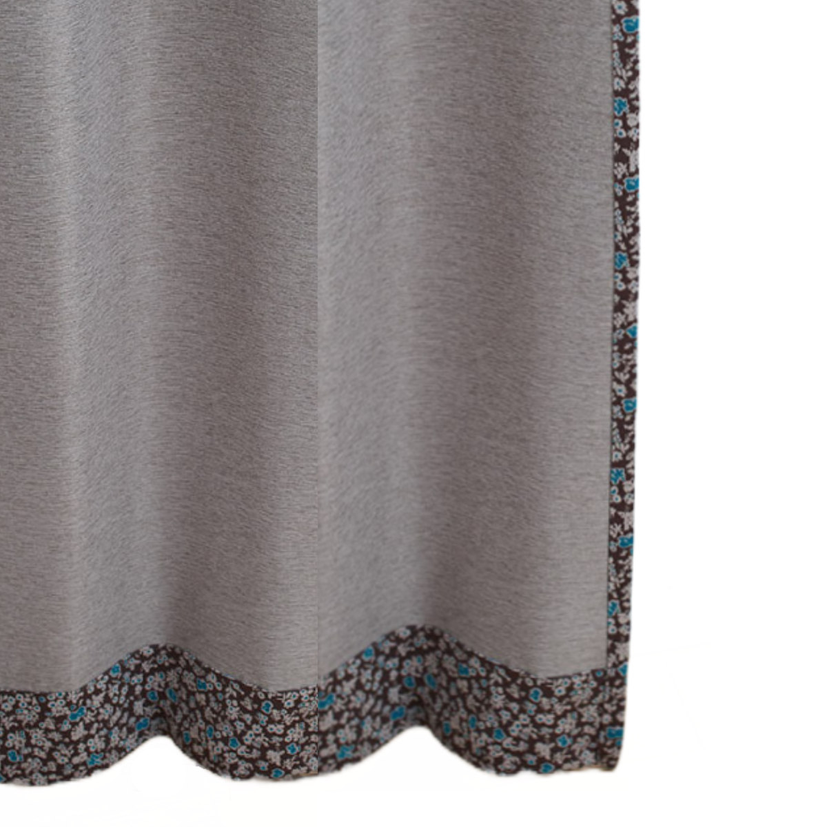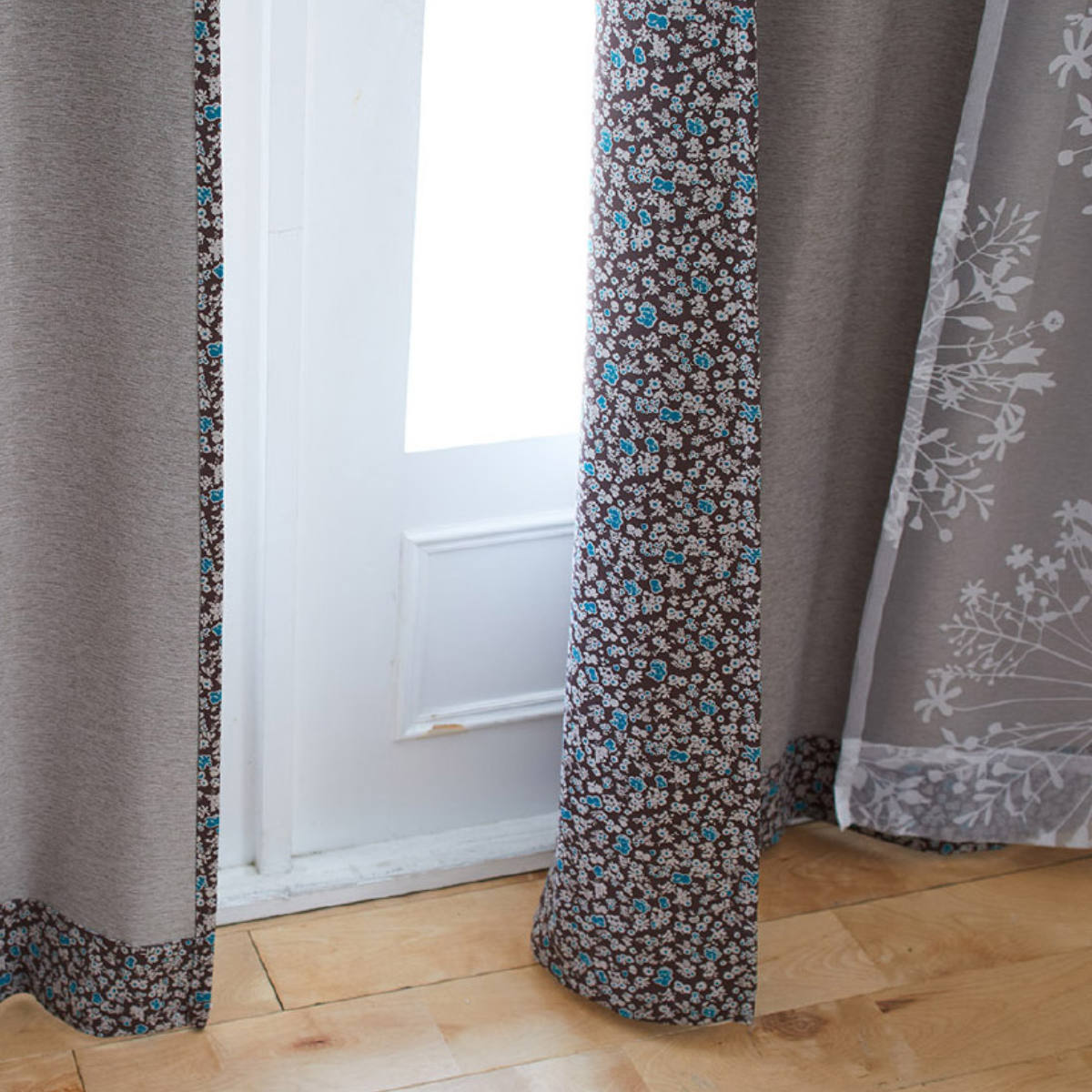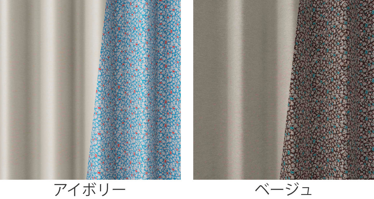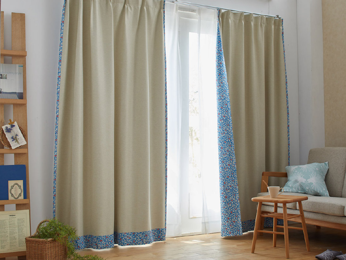 裏面の柄をチラ見せする縫製のバックプリントカーテンです。室内からはシンプルな無地のデザインが主に見えますが、外からは裏面にあしらわれたレトロな雰囲気の小さなお花が見えます。